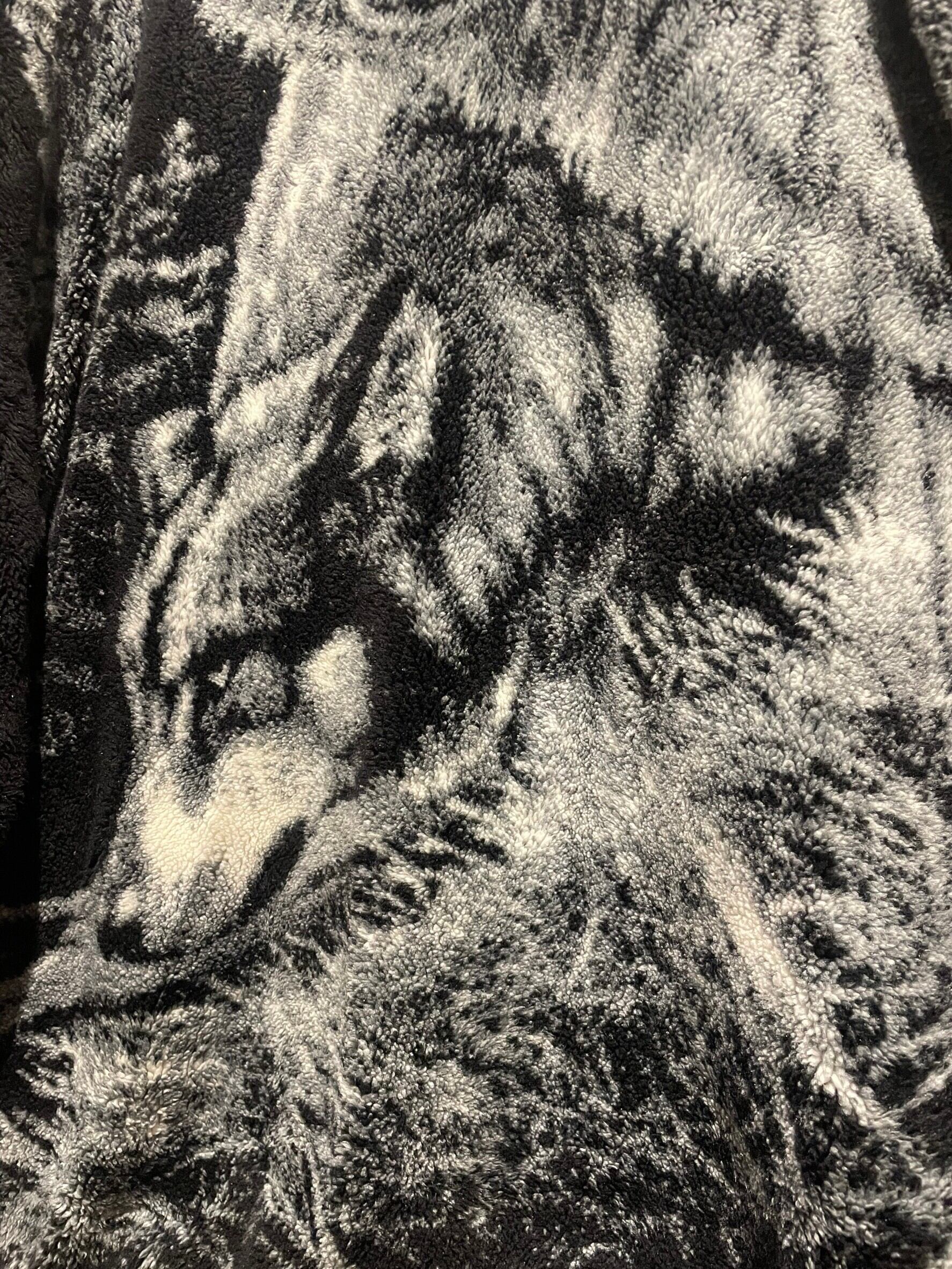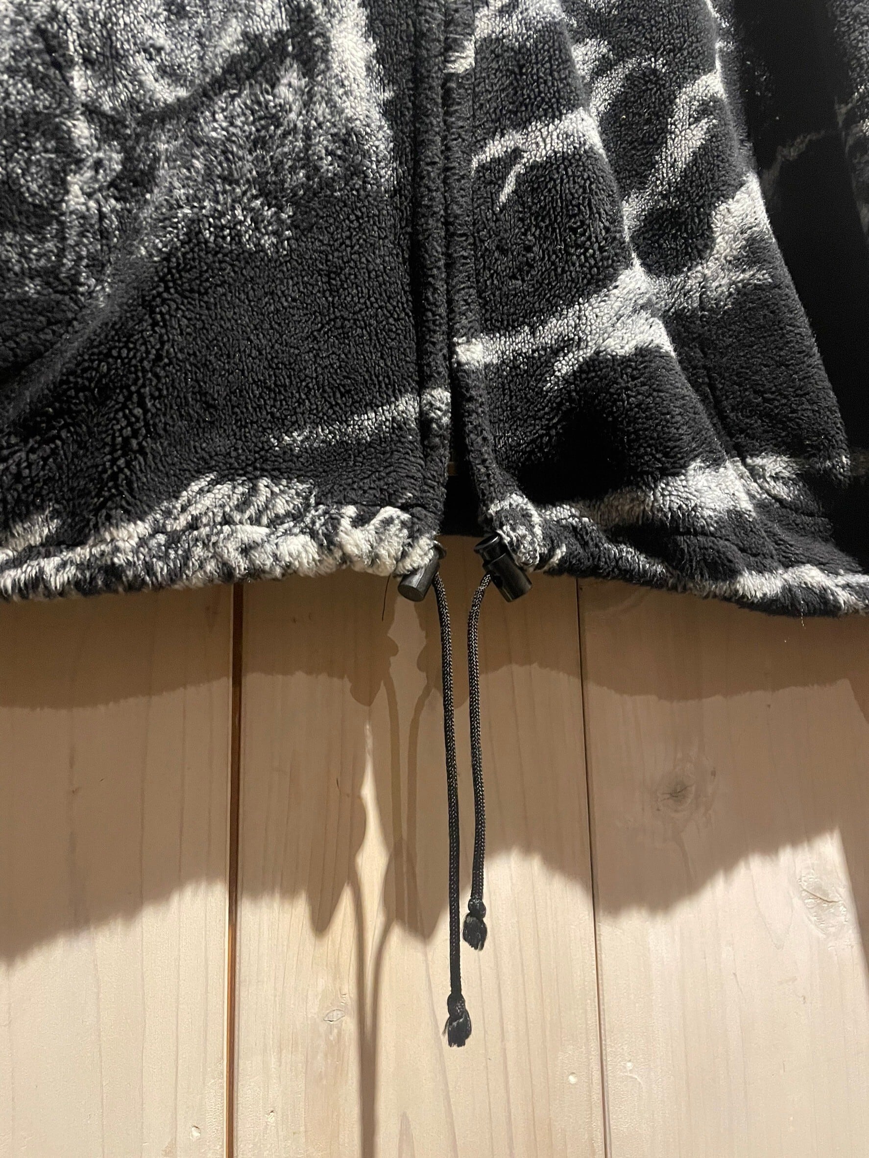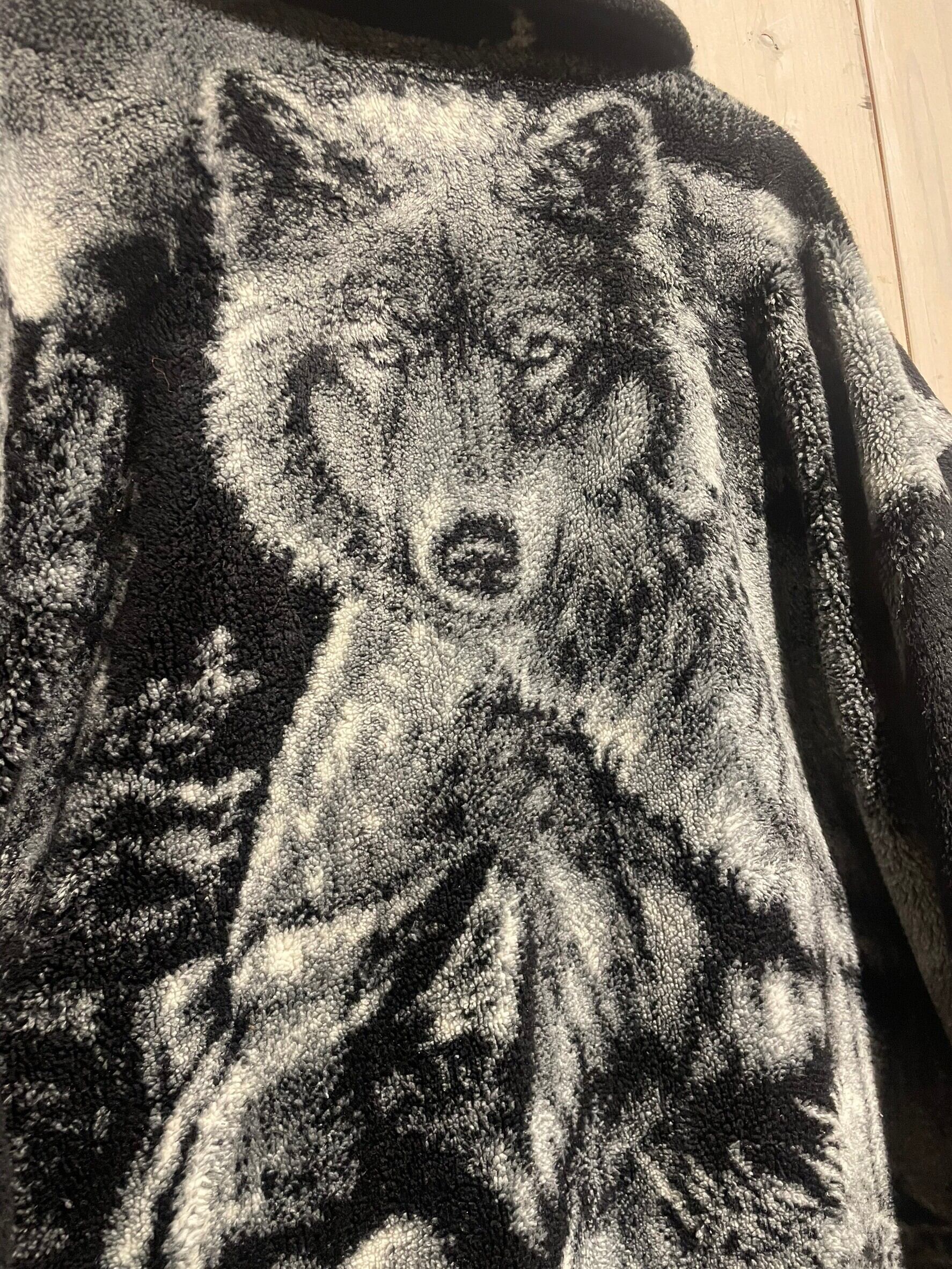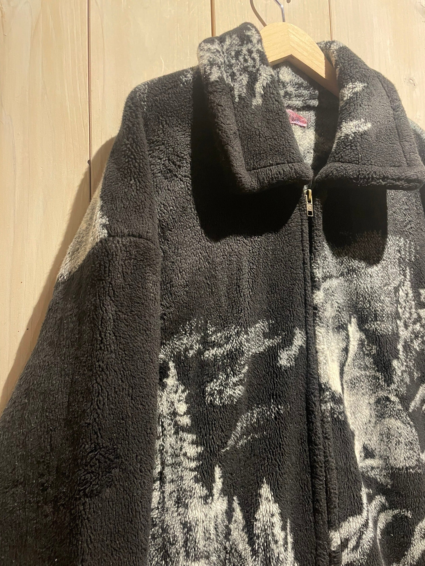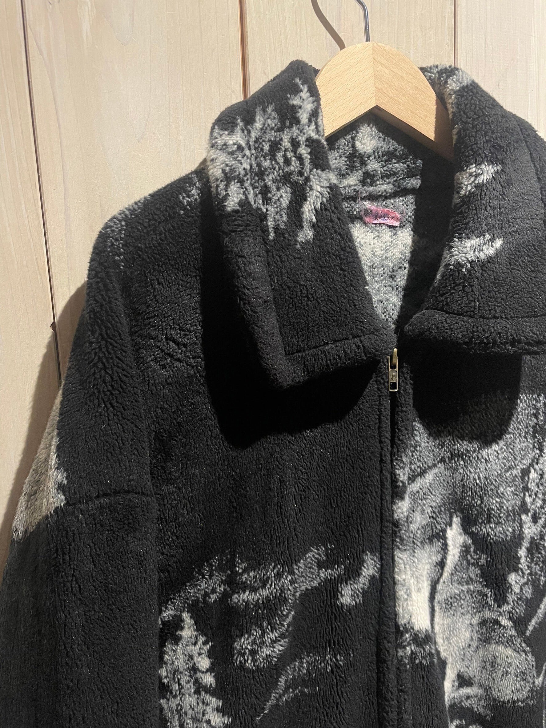 フワッと心地の良い軽く柔らかな毛足のボディに、フロント、バックにオオカミのデザインを載せ、モノトーンのカラーリングで仕上げたフリースジャケット。