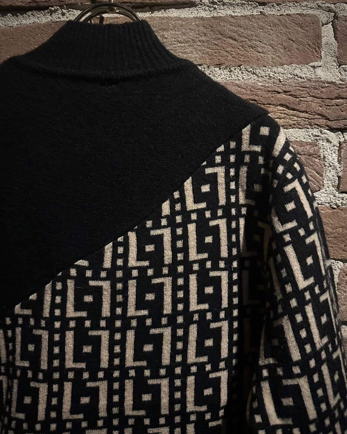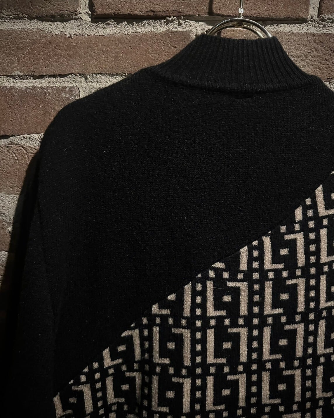 ブラックのボディをベースに、モノグラム調のデザインを切り替えたプルオーバーニット。