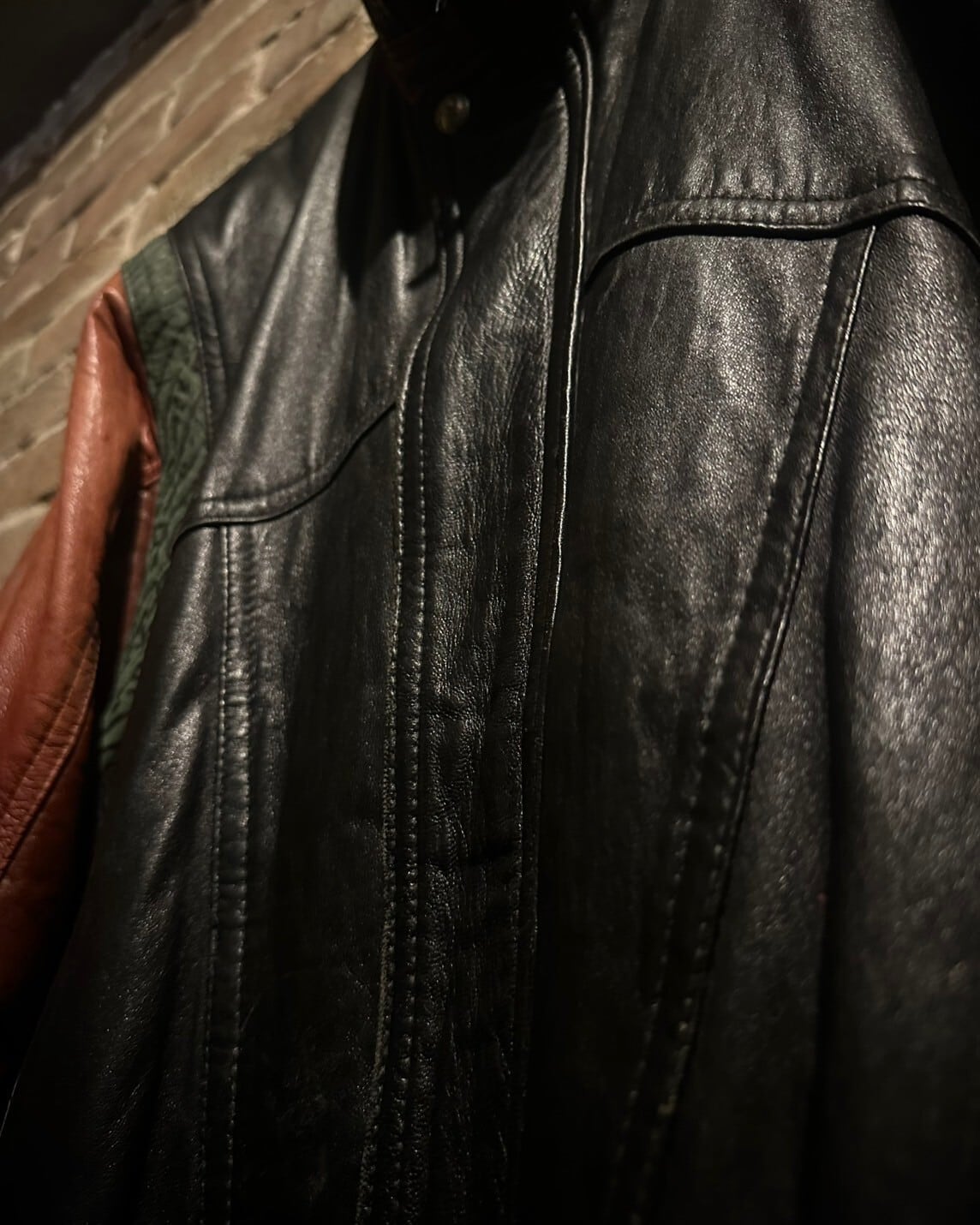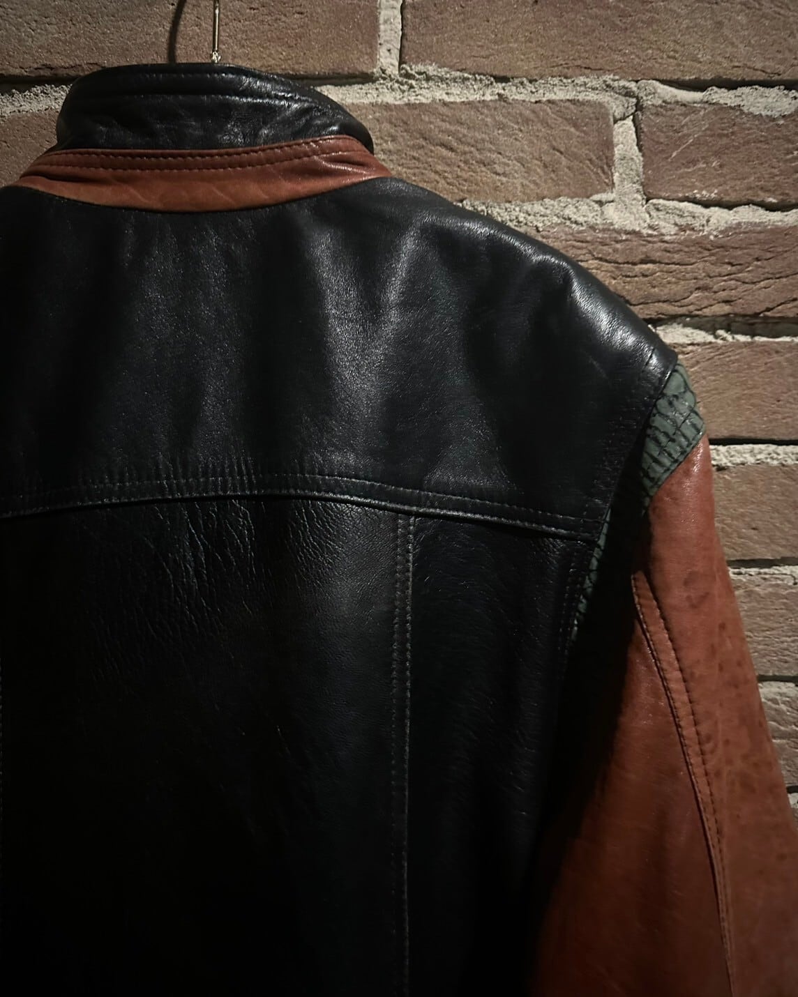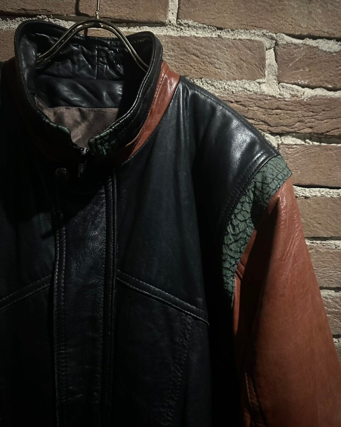 黒をベースに赤茶、柄入りのグリーンカラーレザーで切り替えを施したレザージャケット。