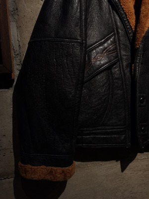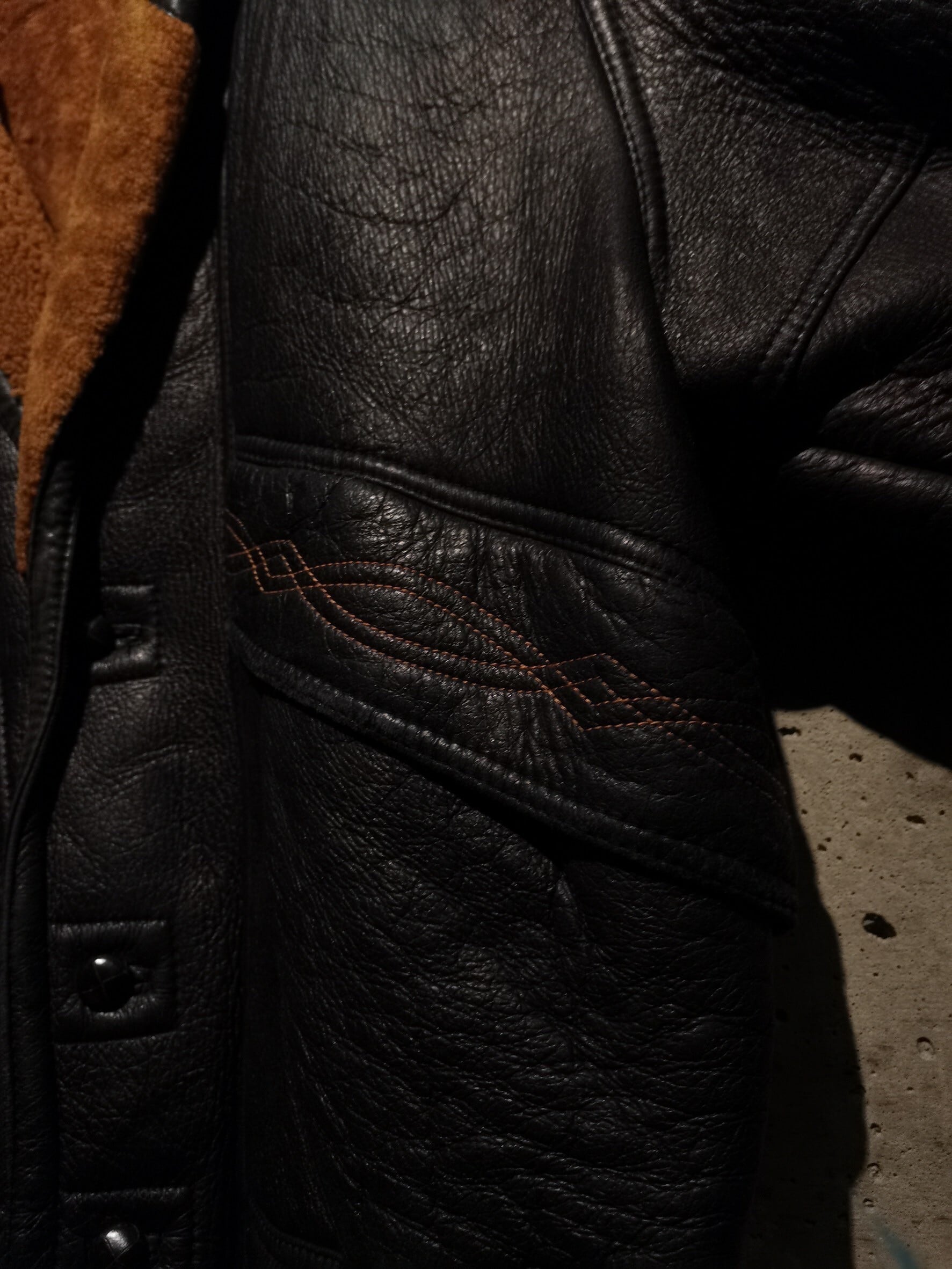 フロントのポケットにはウエスタン調の刺繍、肩にはエポレット、ショールカラーの中程にはレザークラフトの施し。ムートンの質のみならず、デザインの作り込みも素晴らしい、、、
