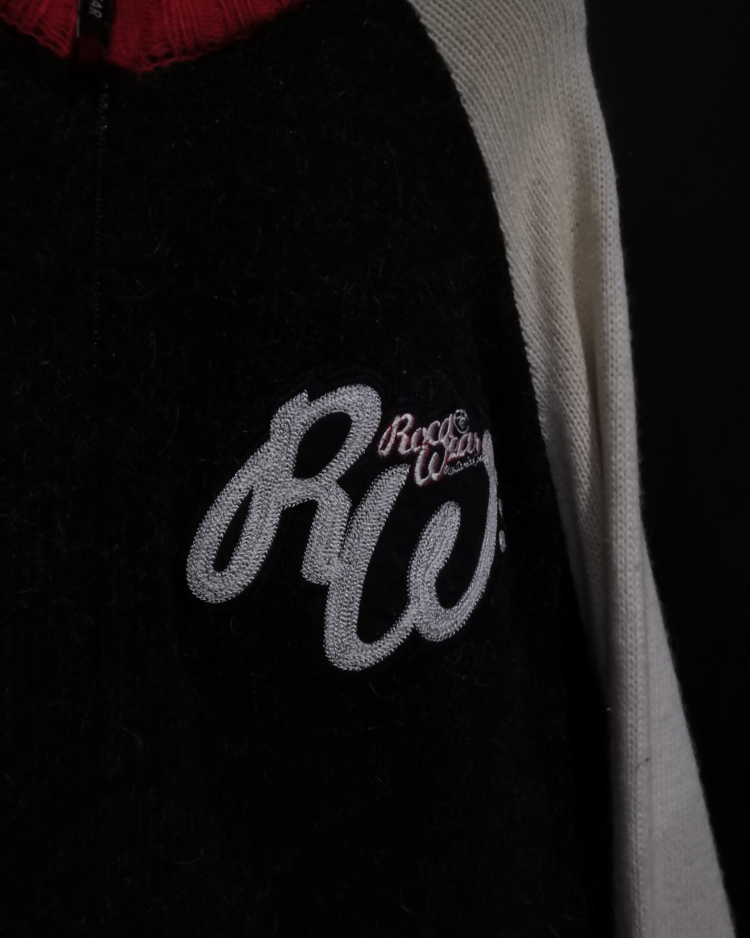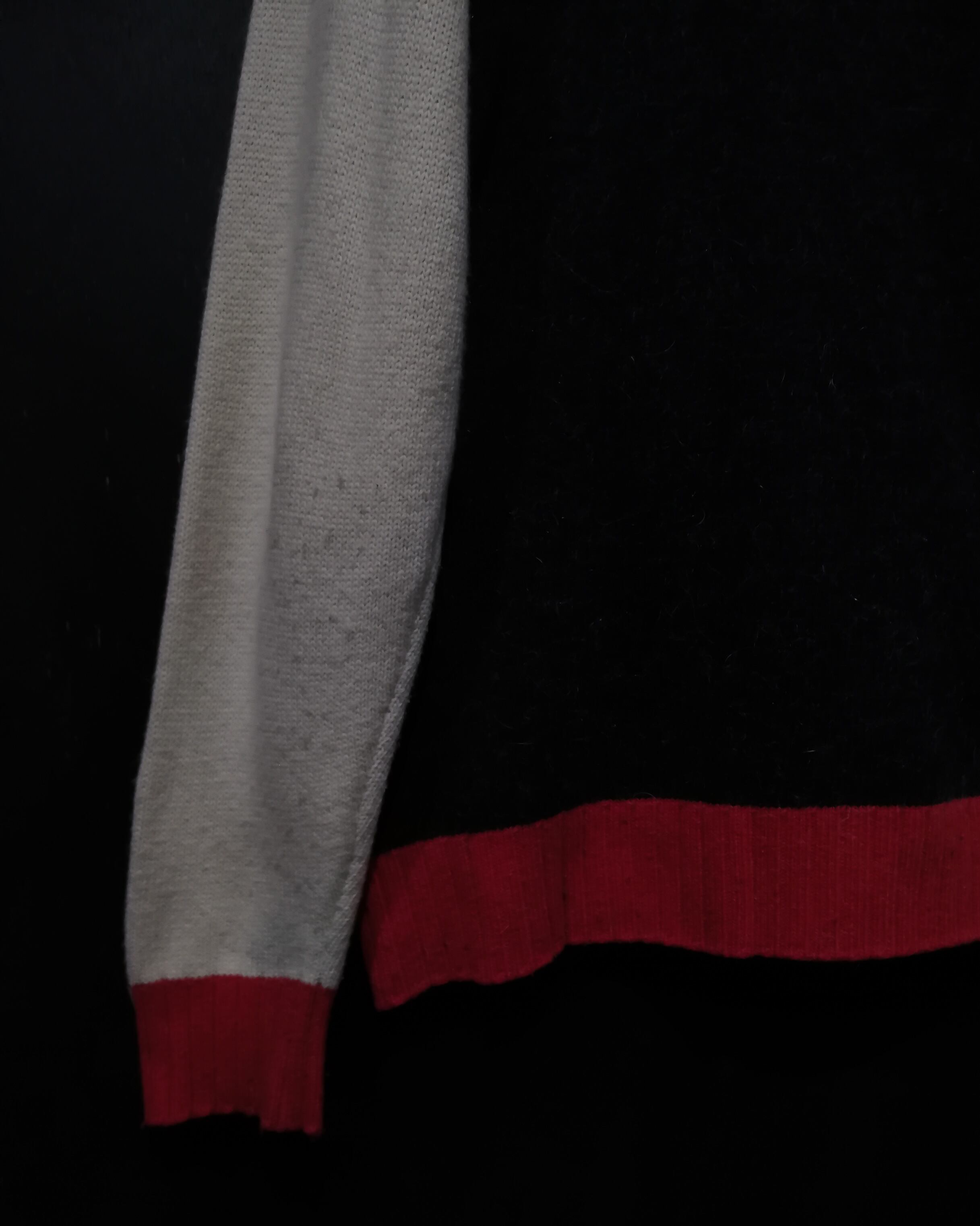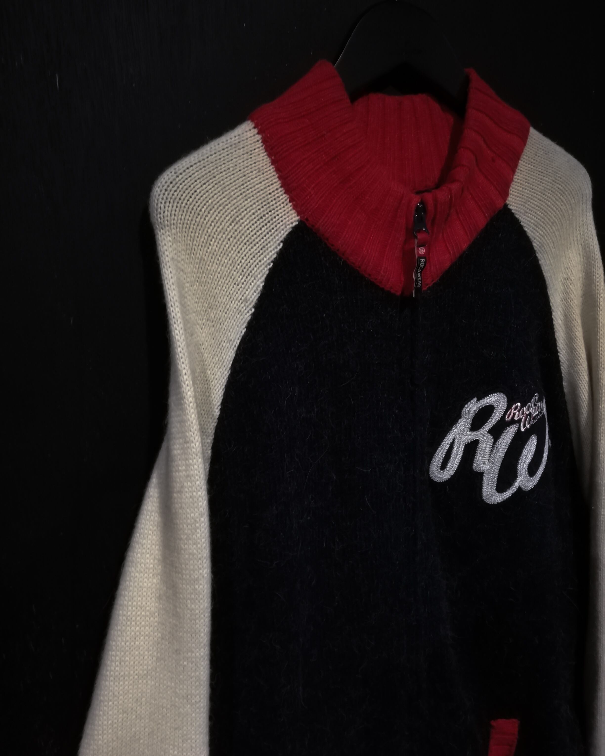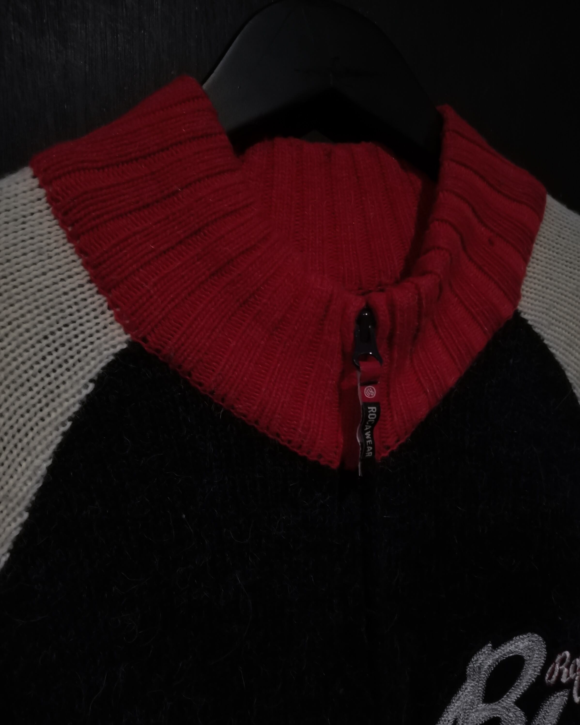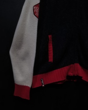 グレーのボディをベースに、アーム、リブなど随所にビビットな赤色を切り替えたニットジャケット。