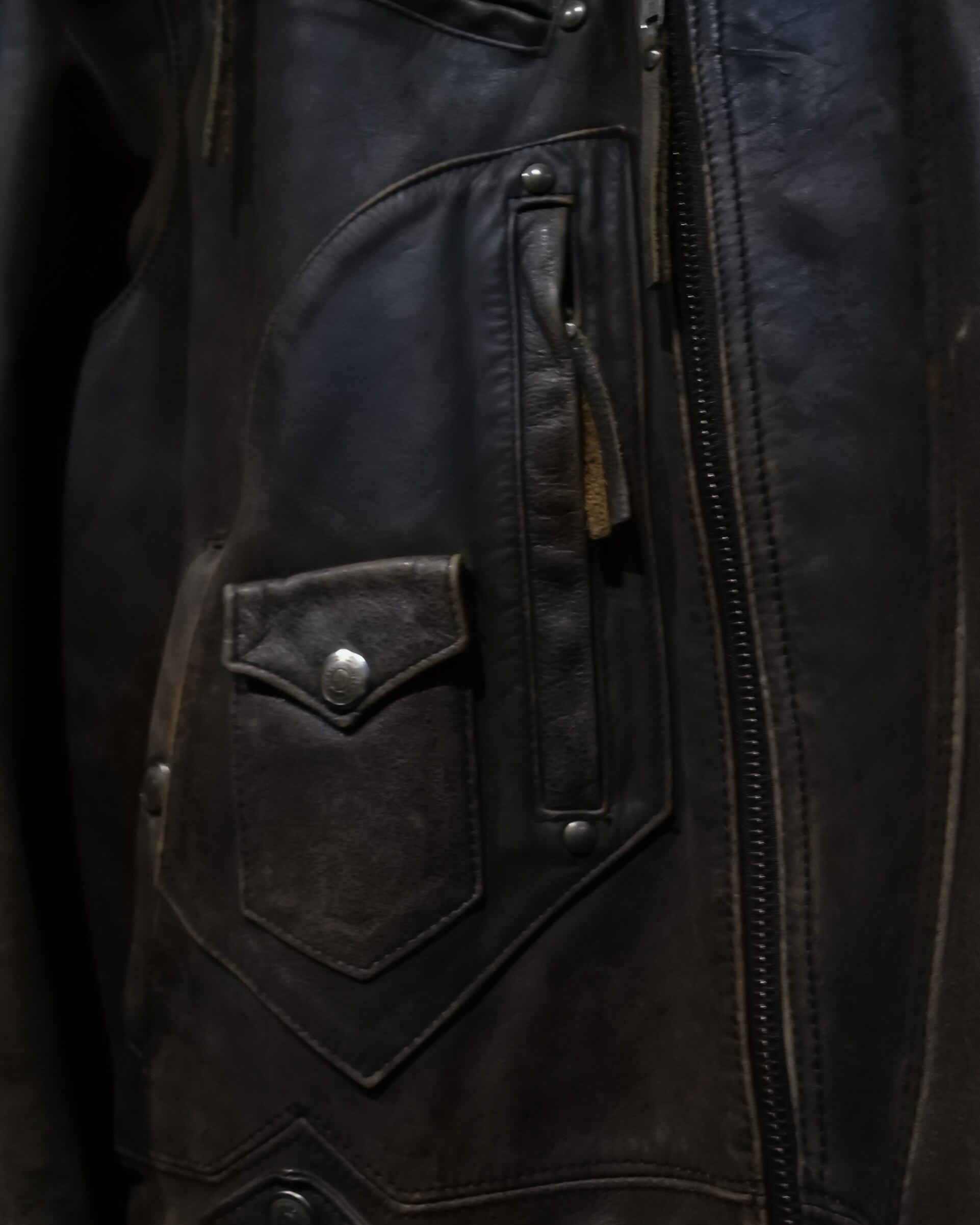 ボディ本体が醸し出す渋い雰囲気はさる事ながら、フロントのジップポケットやコインポケット、エポレットの大ぶりなボタン、レザークラフトによる背面のブランドロゴと、作り込みも素晴らしいんです。