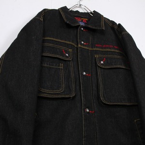 ブラックデニムのボディ前後に刺繍によってブランドロゴとデザインを載せたデニムジャケット。