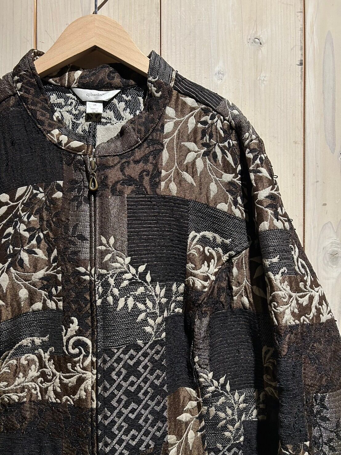 上品なブラウンカラーをベースとし、ゴブラン織りとシェニール織りを所々で使い分け、それらをパッチワーク状に繋ぎ合わせたジップアップジャケット。