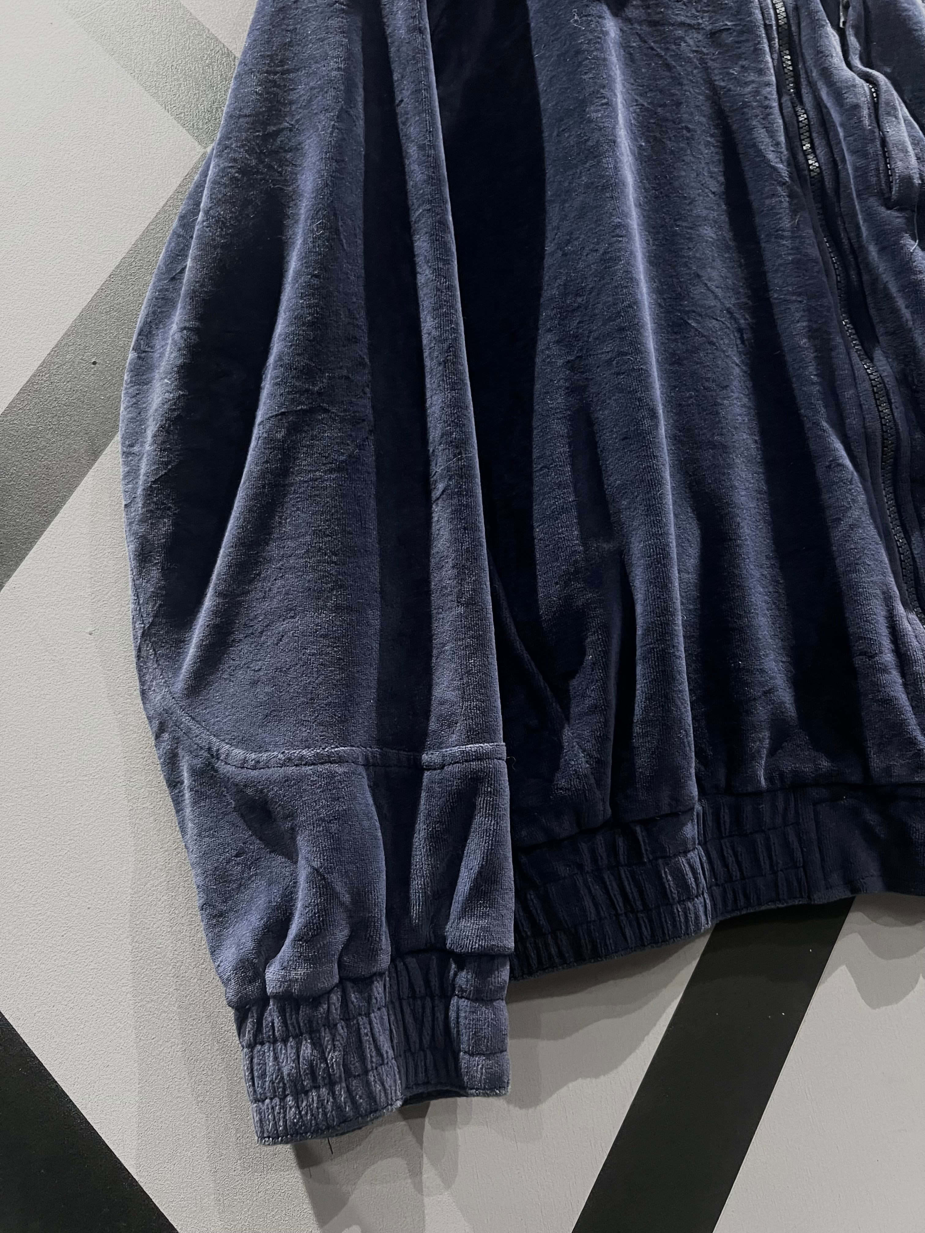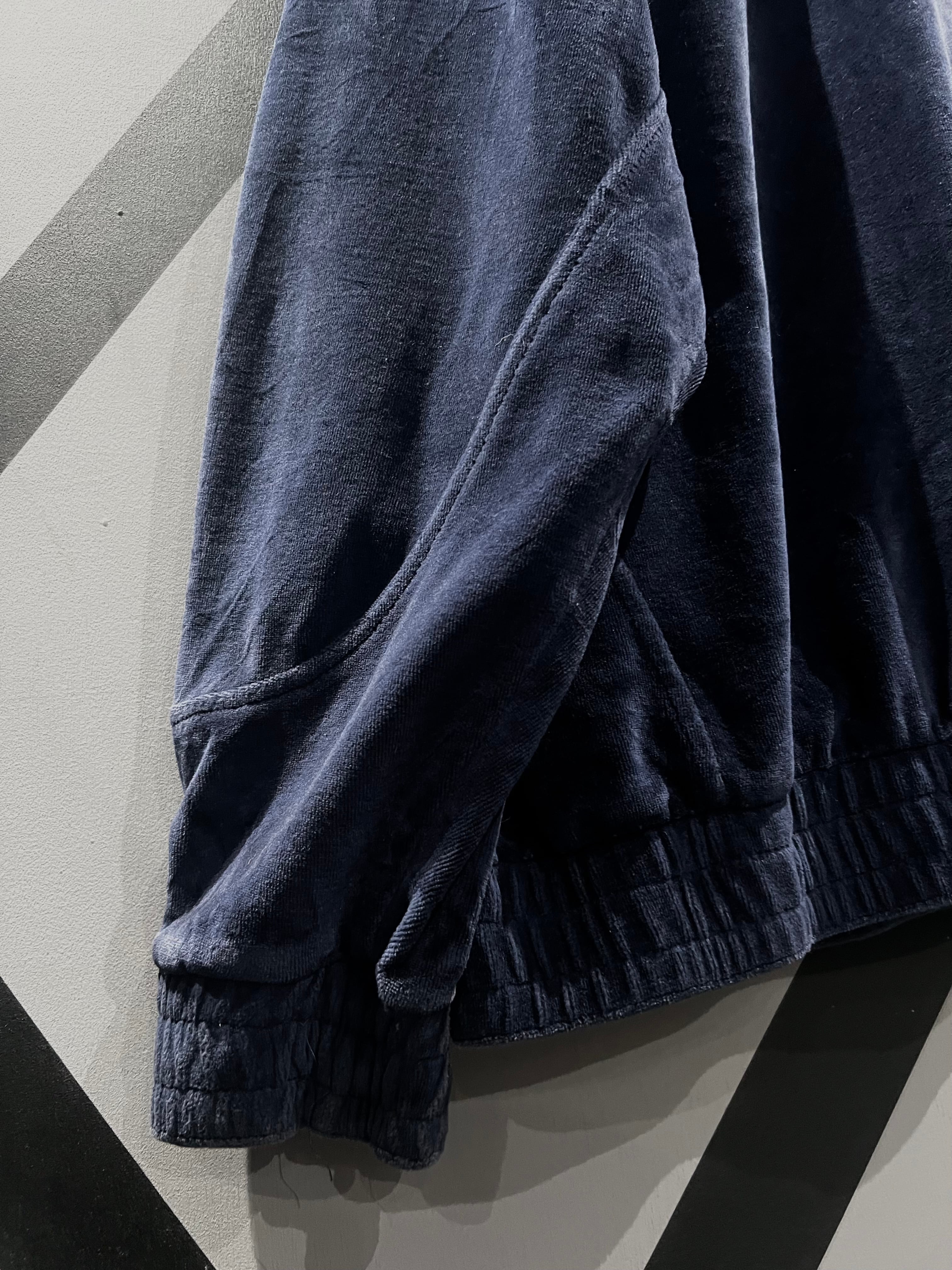 鈍く光沢を放つ滑らかなネイビーのベロアを用いて、トラックジャケットに落とし込んだ1着。