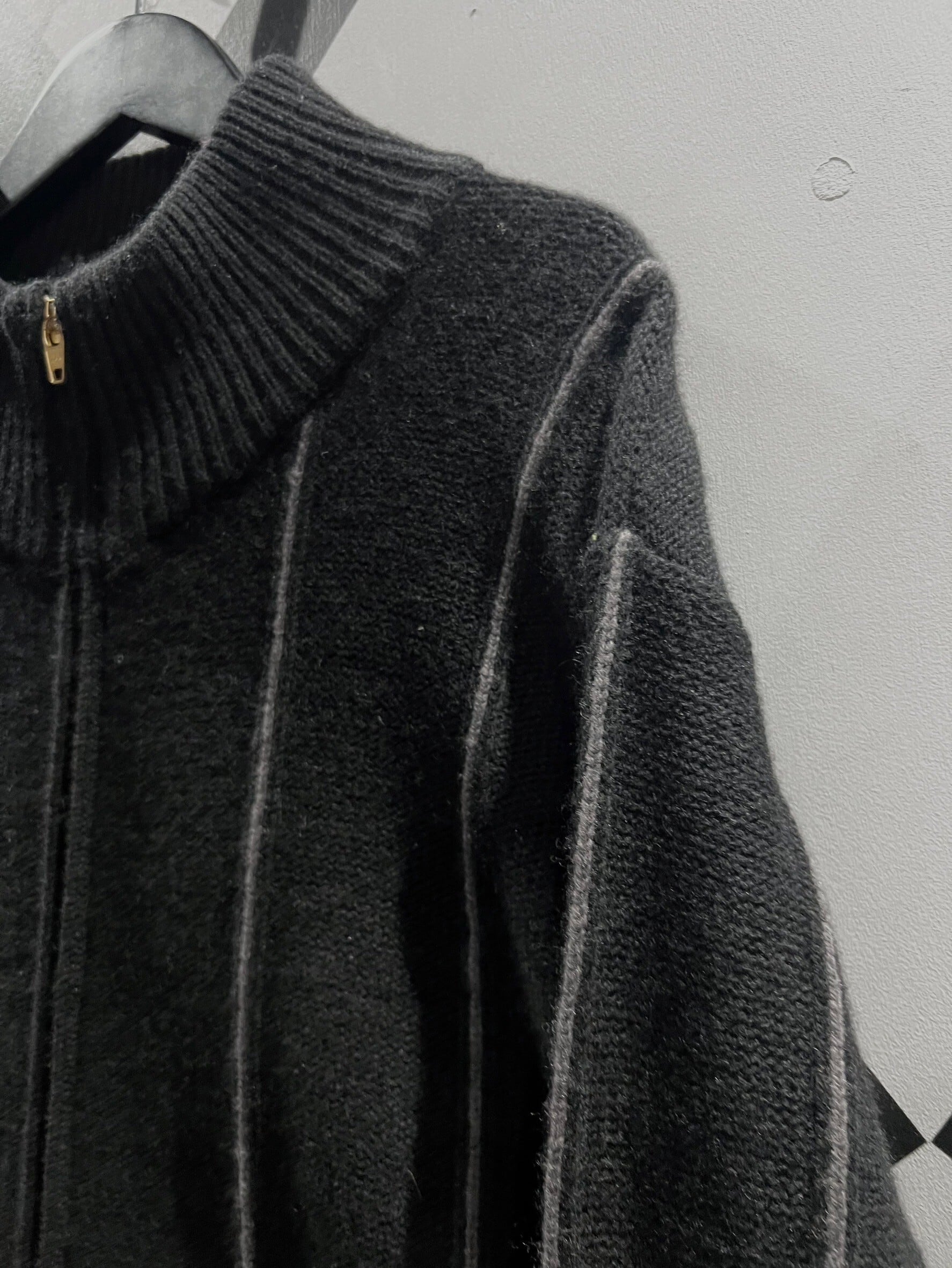 伸縮性のある黒のリブニットを用いて、いわゆるドライバーズ型に落とし込まれたジップアップニットジャケット。