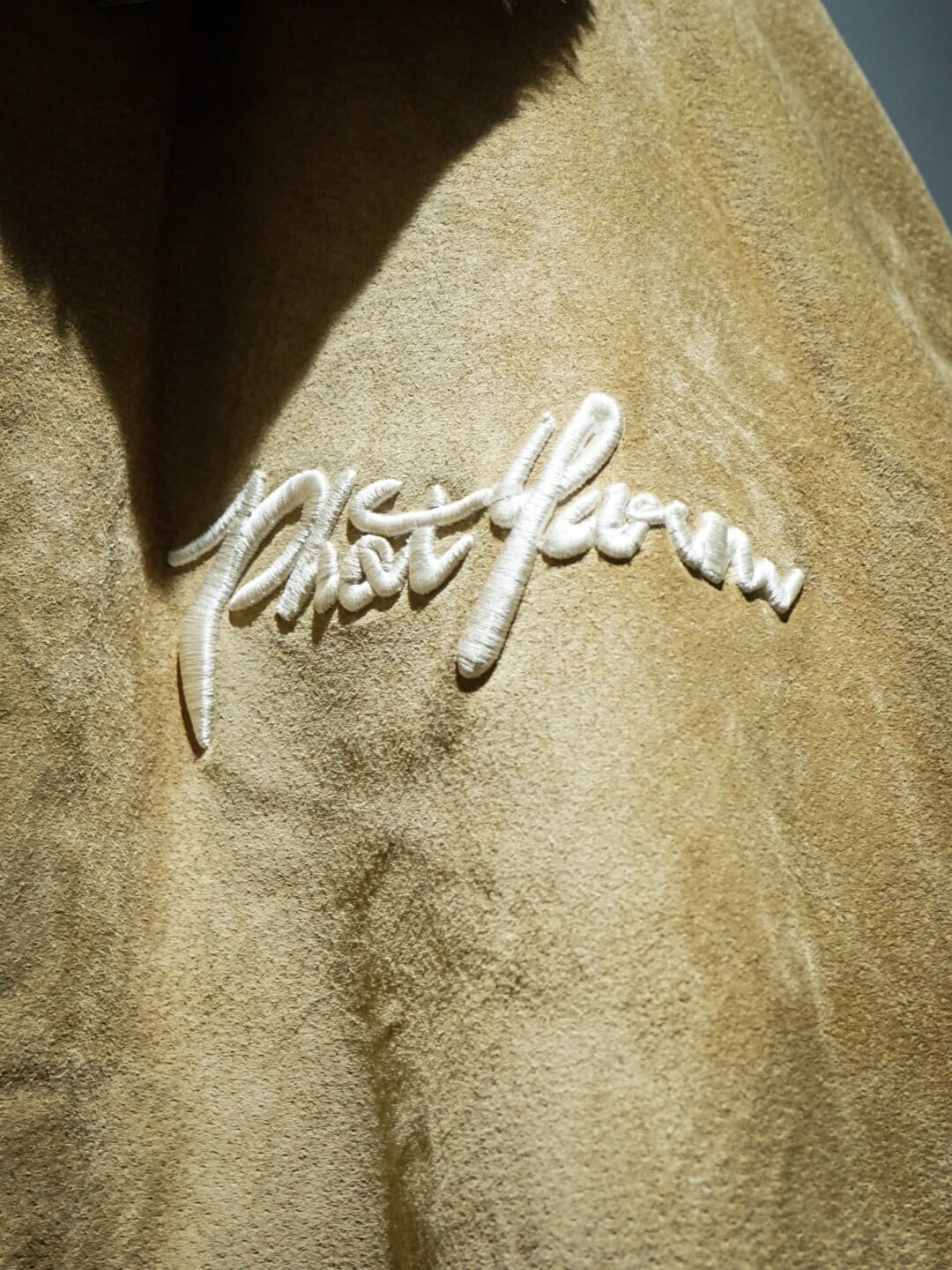 マットな質感のリアルスエードを使用したボディに、左胸にはブランドネームの刺繍をON。薄いベージュのカラーリングの柔らかい雰囲気も◎