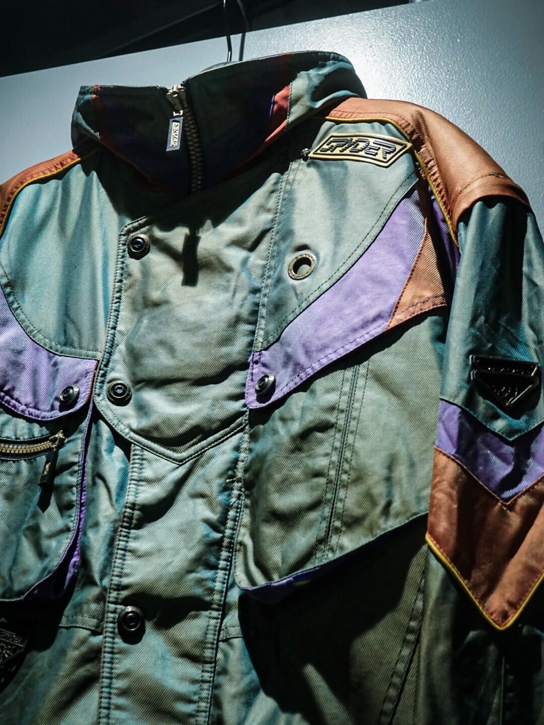 美しい光沢を帯びたナイロン素材のボディに稀有なカラーリングの切り替えを施し、当ブランドらしいテクニカルなギミックを施したナイロンギアジャケット。