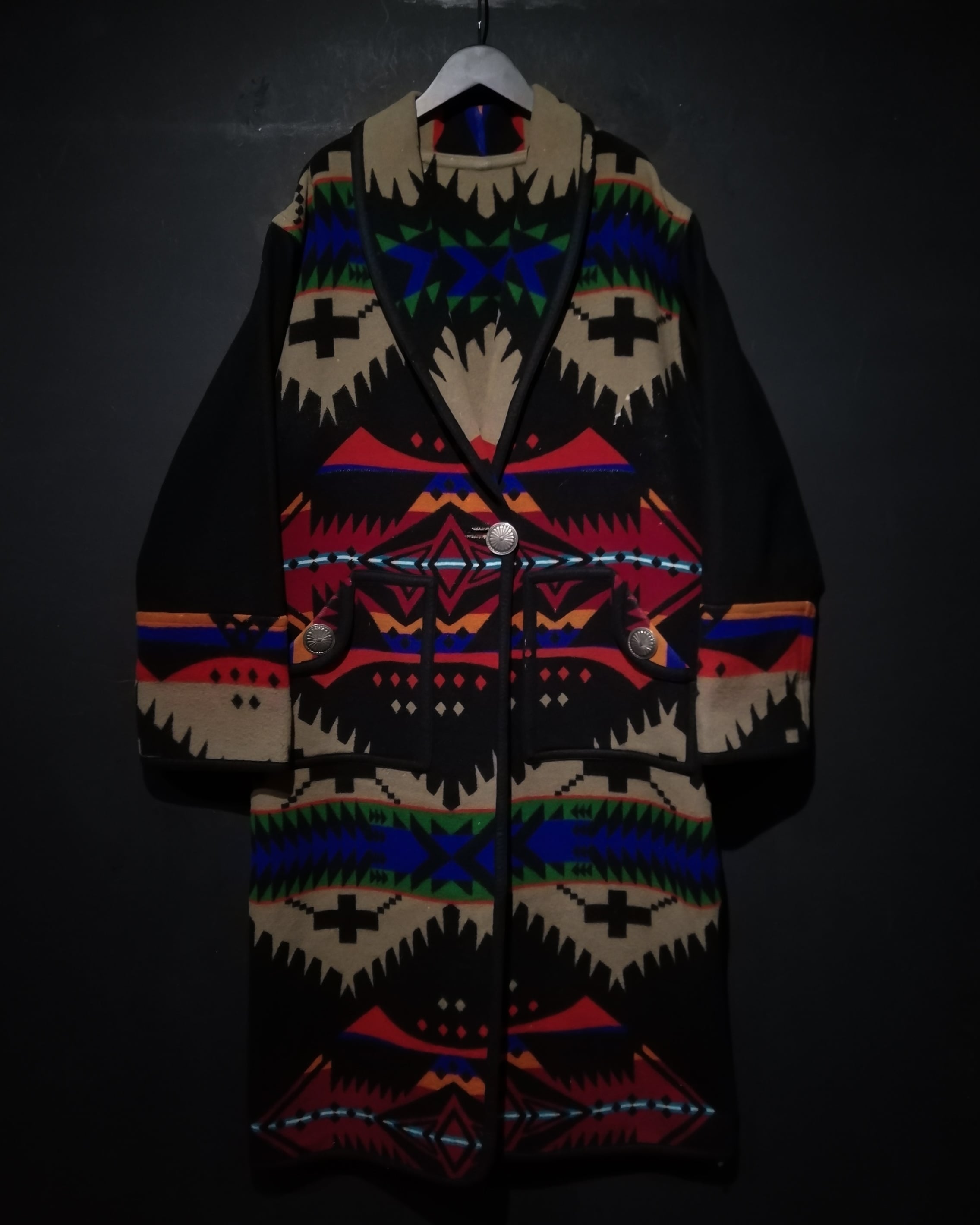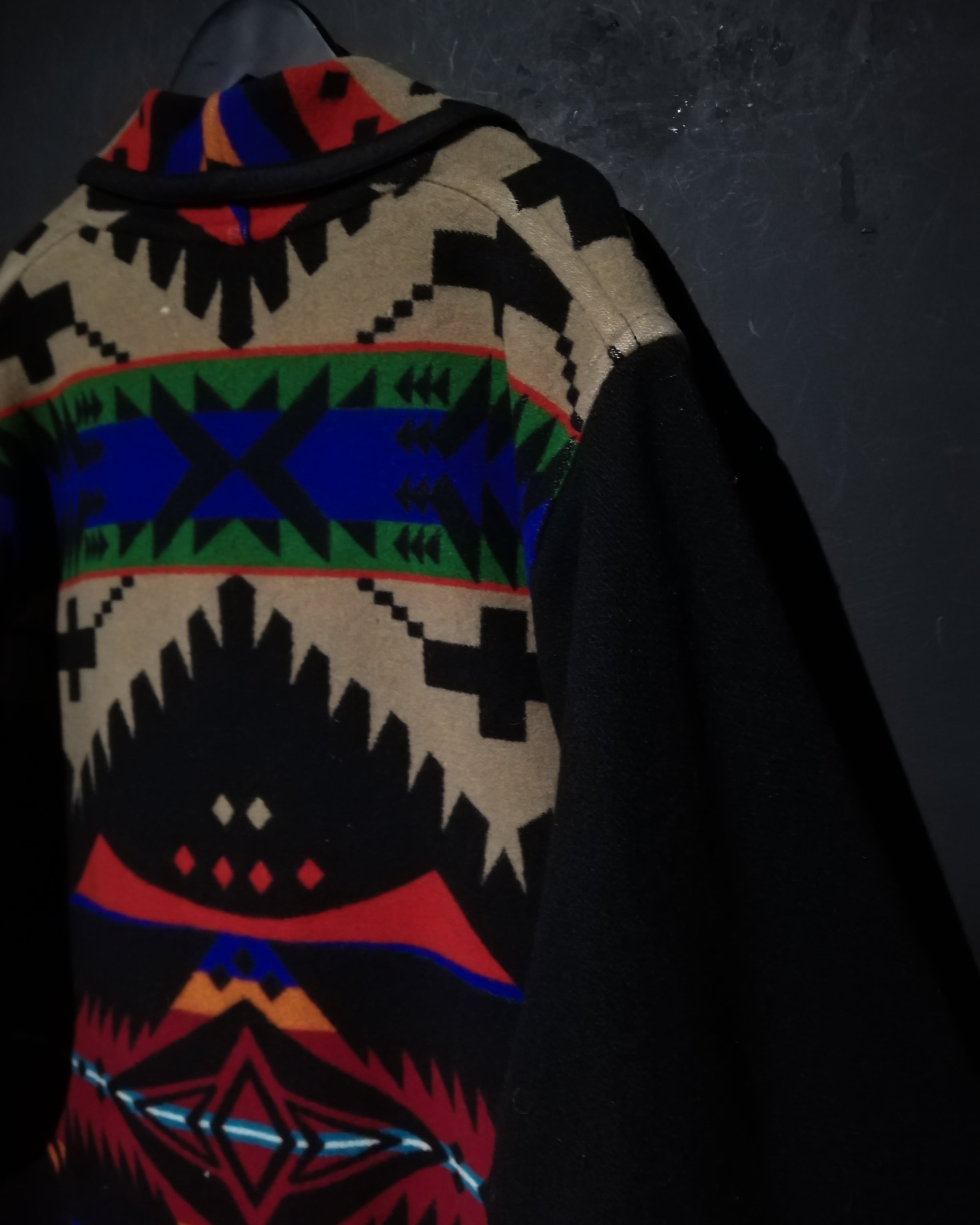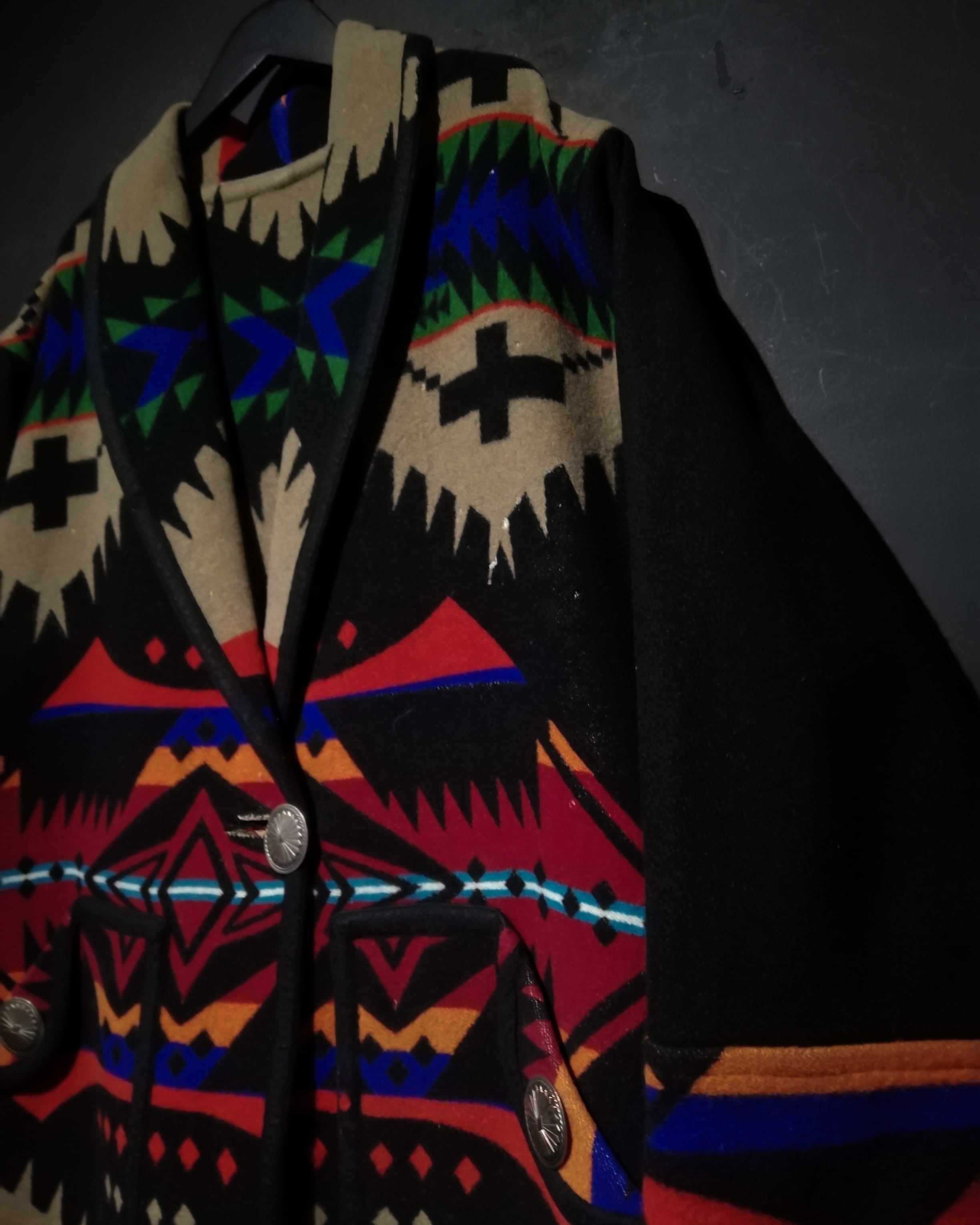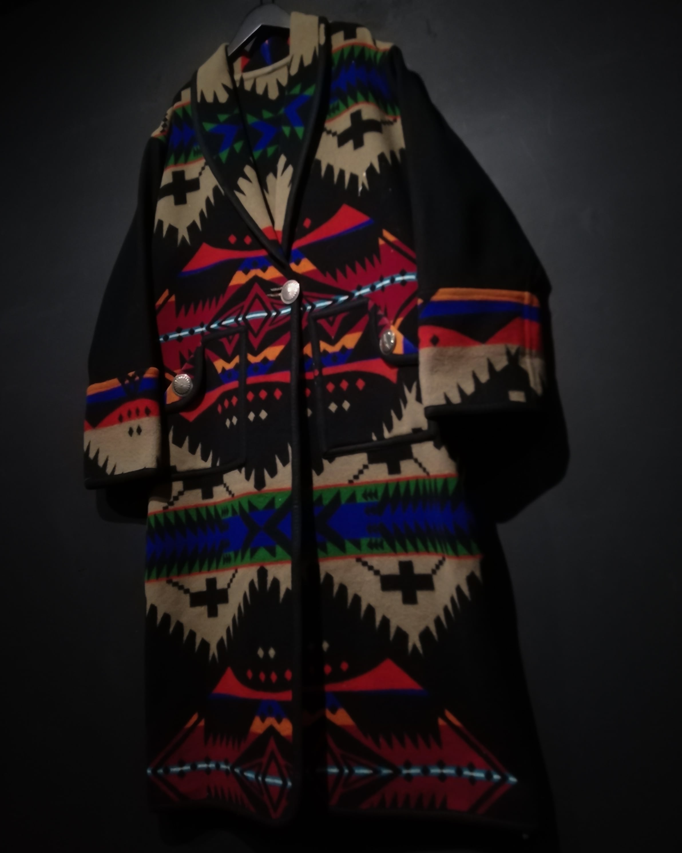 冷え込みが激しくなる今時期、実店舗でもお探しの方が非常に多いコートアイテム。本日ご紹介致しますのは、柄にコンチョボタンの装飾などネイティブアメリカというカルチャーを含め、当店らしいデザインに装飾、唯一無二なオーラをムンムンに放つリバーシブルの逸品。