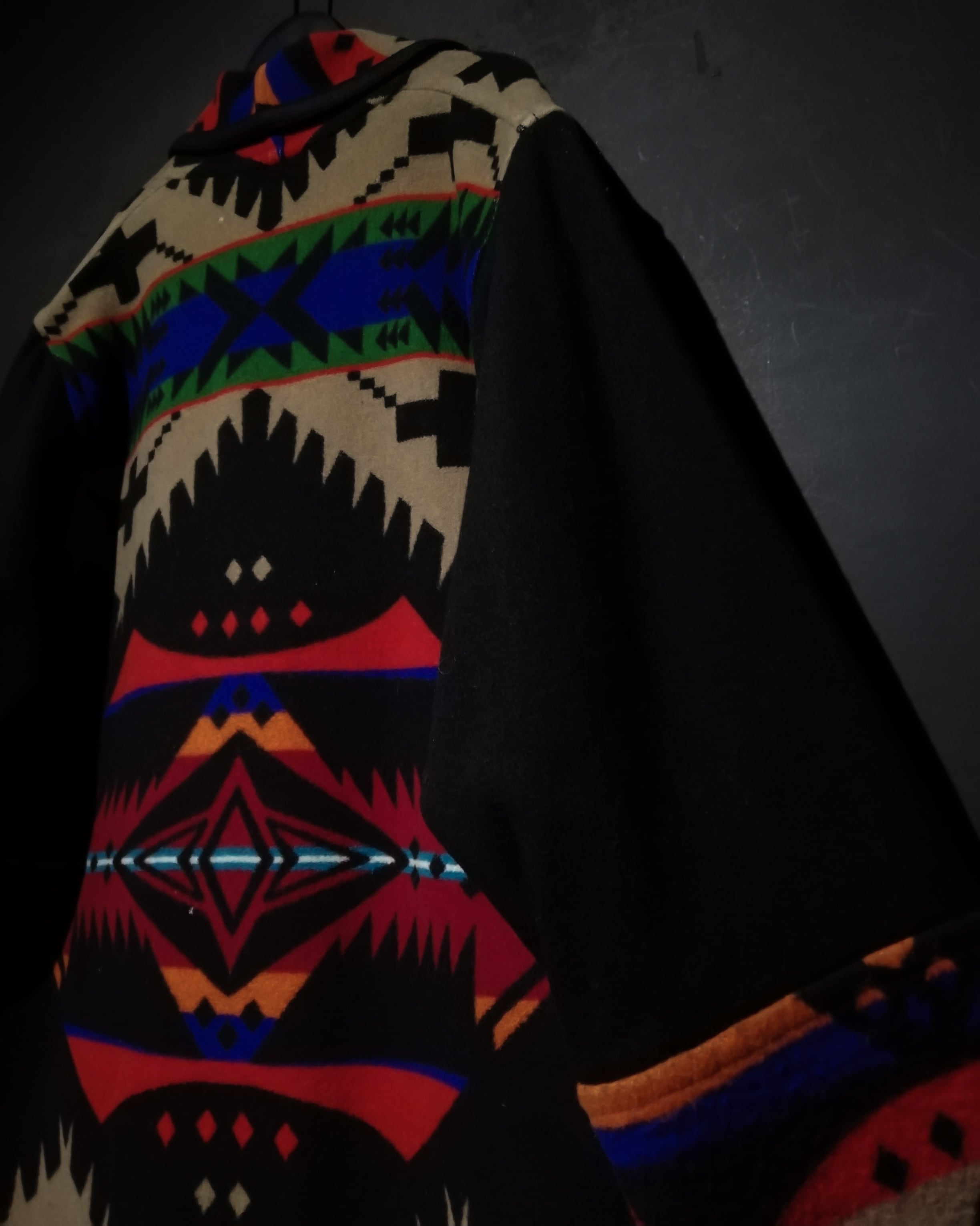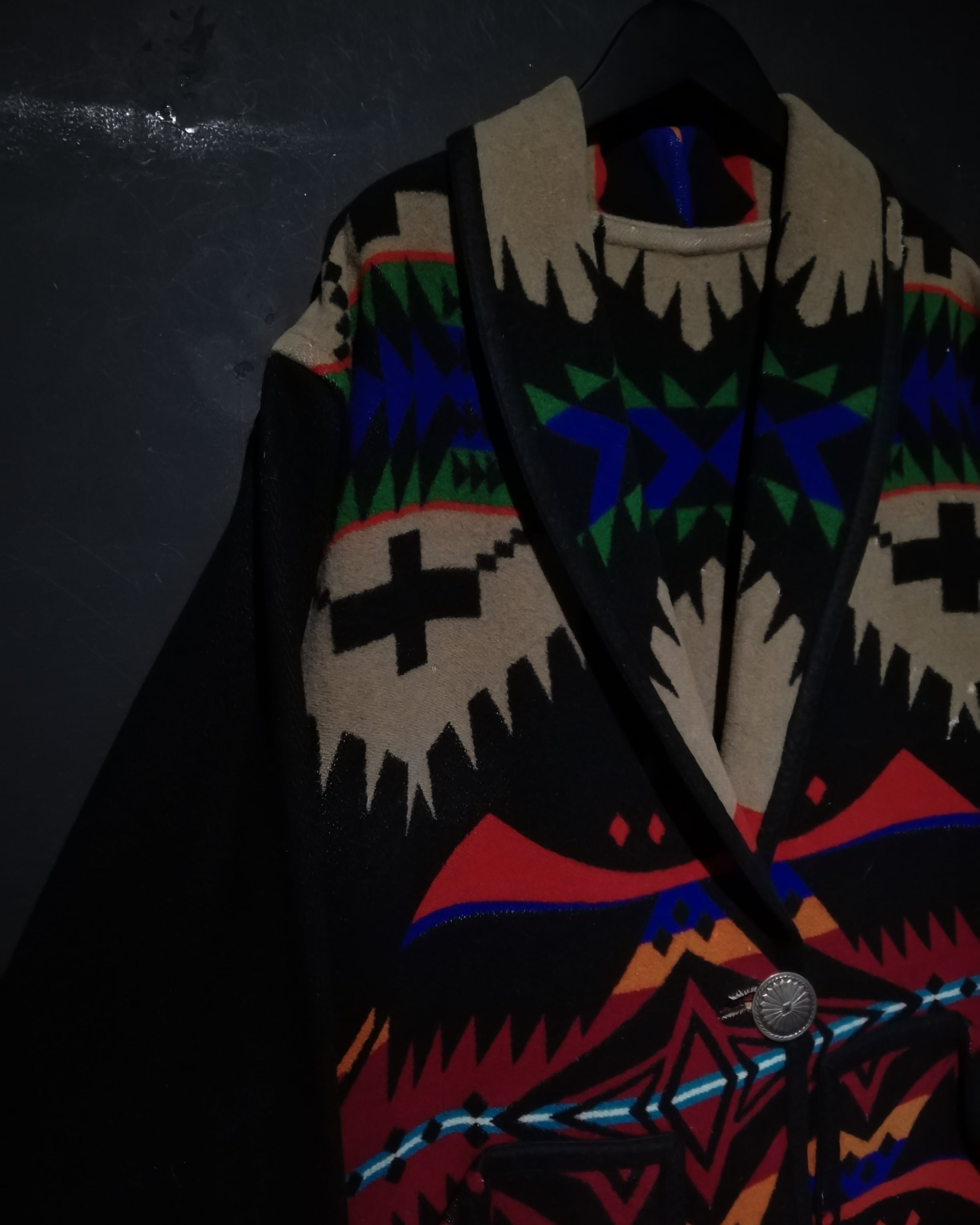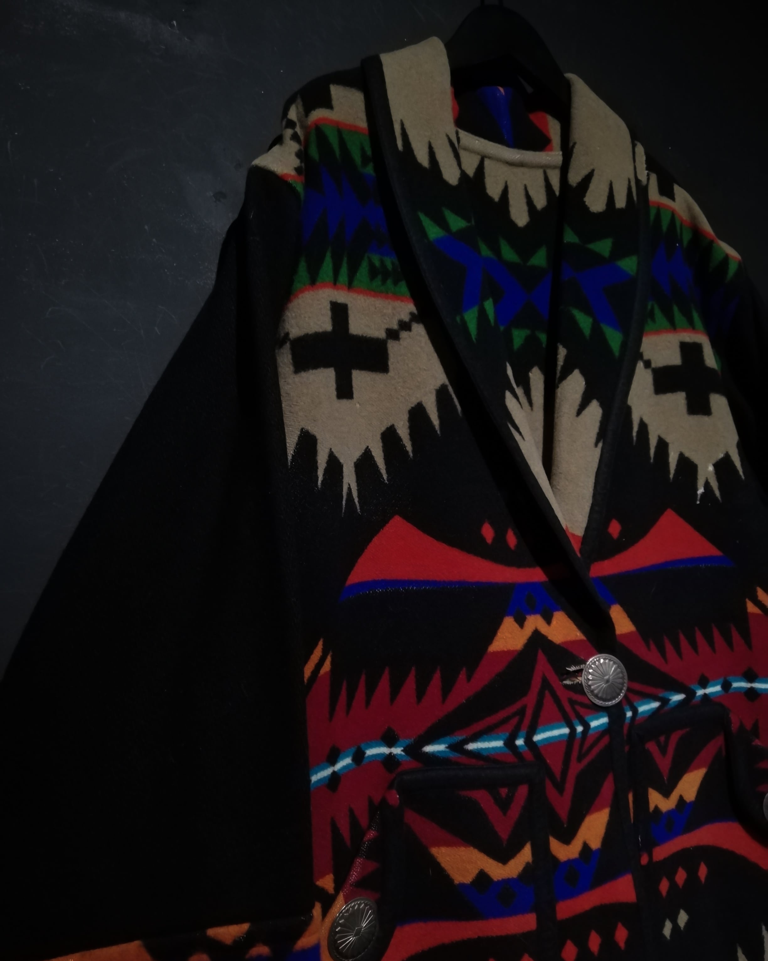 冷え込みが激しくなる今時期、実店舗でもお探しの方が非常に多いコートアイテム。本日ご紹介致しますのは、柄にコンチョボタンの装飾などネイティブアメリカというカルチャーを含め、当店らしいデザインに装飾、唯一無二なオーラをムンムンに放つリバーシブルの逸品。