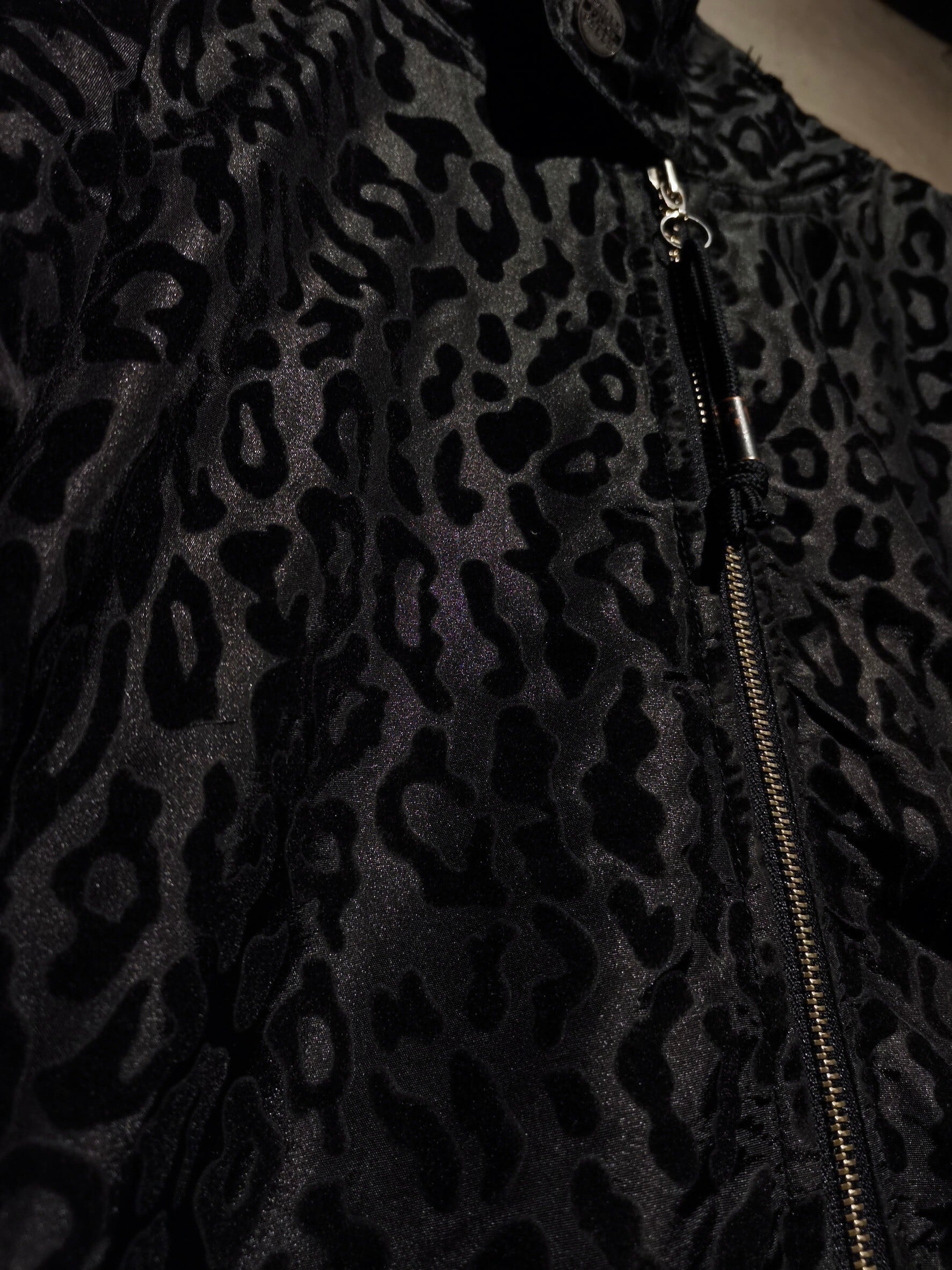 光沢を帯びた、ハリのあるブラックナイロンのボディに、ベロア調のフロッキープリントによって、全体にレオパードパターンを載せたナイロンジャケット。
