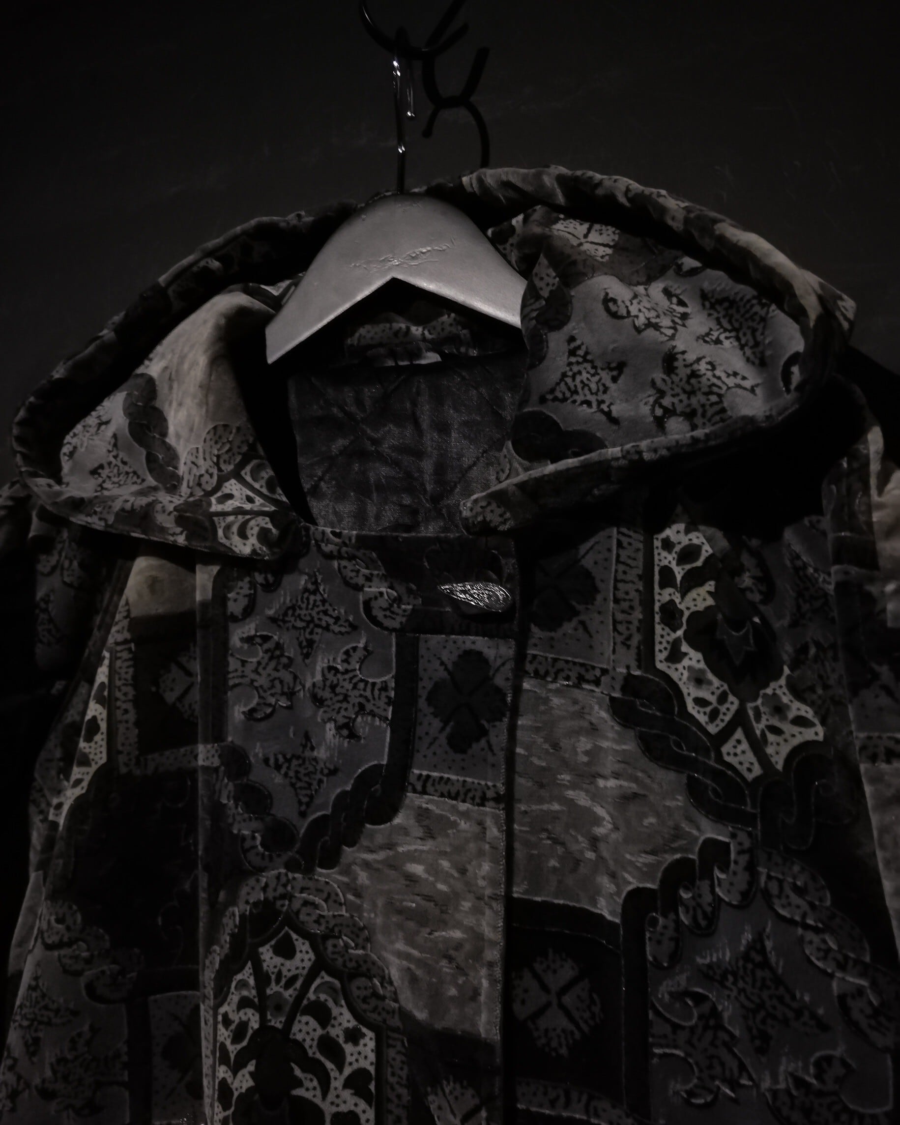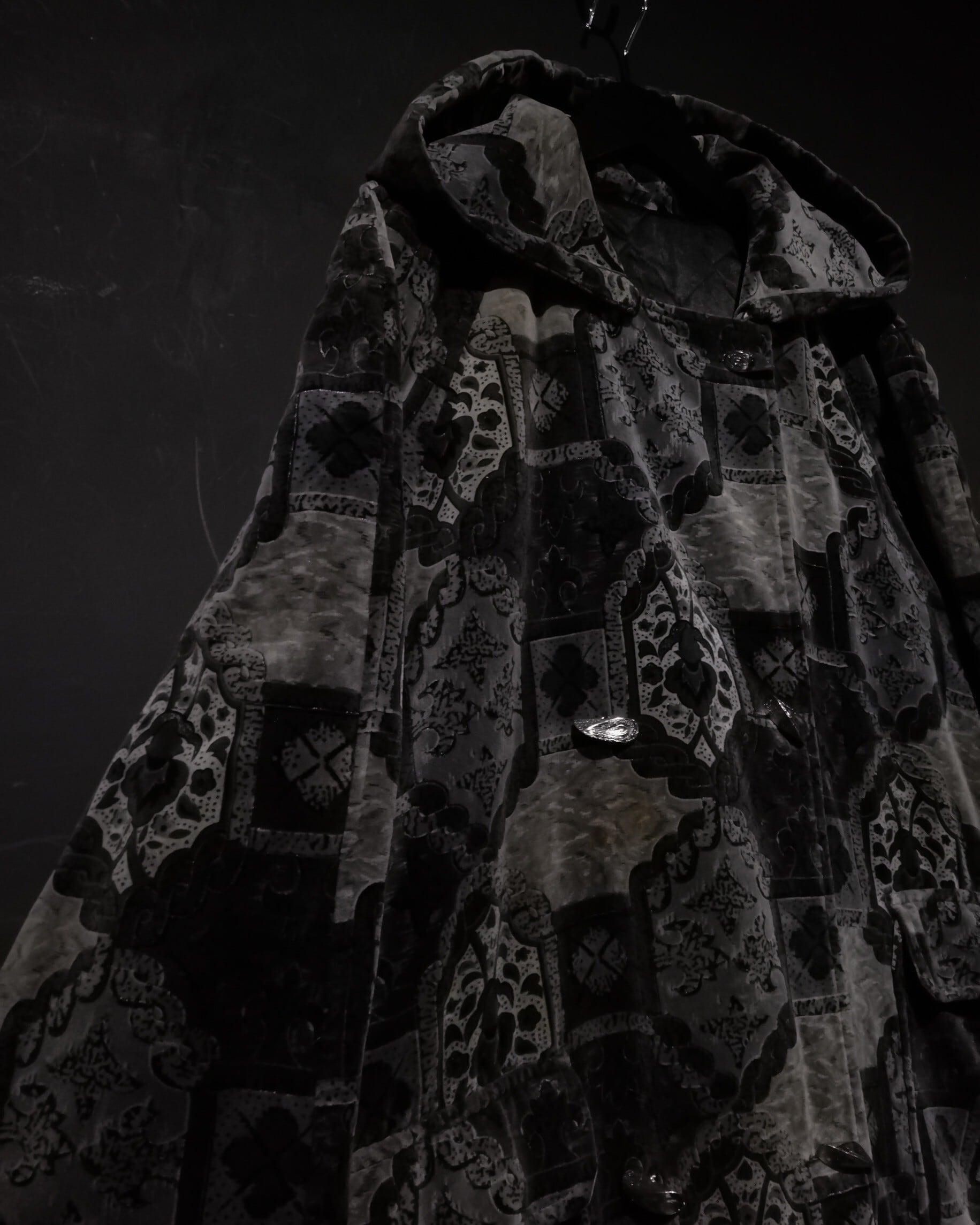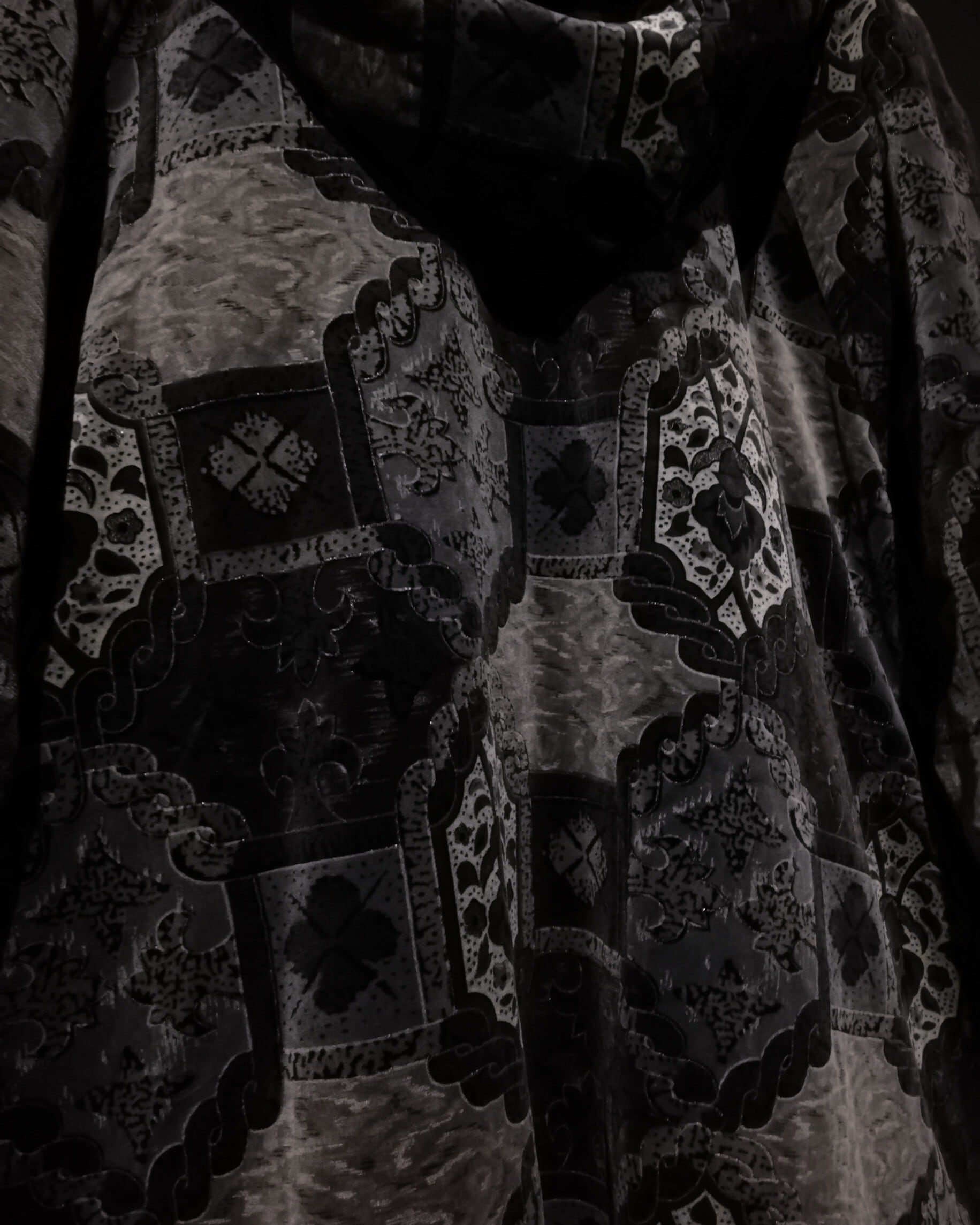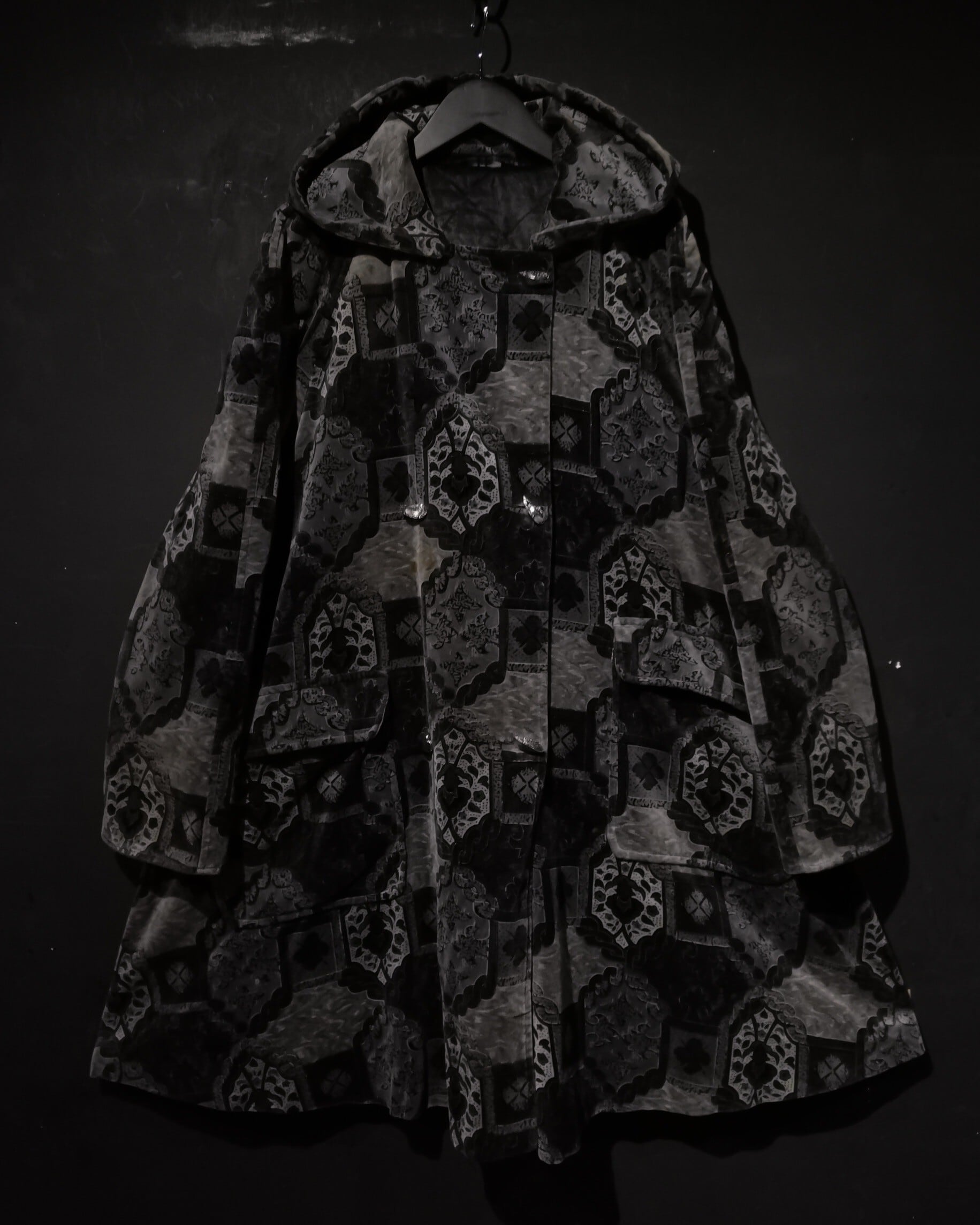 上品な鈍い光沢を帯びたベロア素材のボディに、グレーをベースとしたモノトーンのカラーリングで、エスニックな雰囲気を漂わせる美しい柄を載せたフード付きのロングコート。