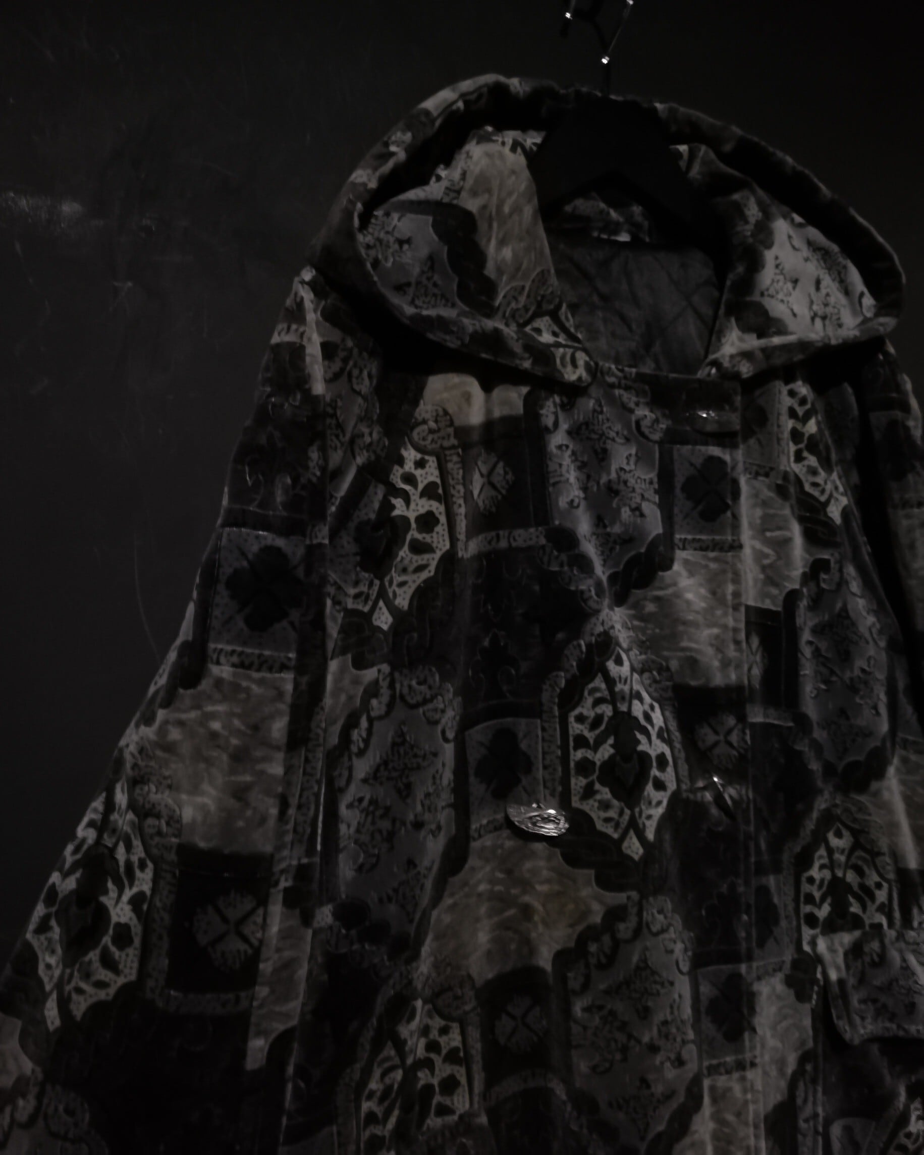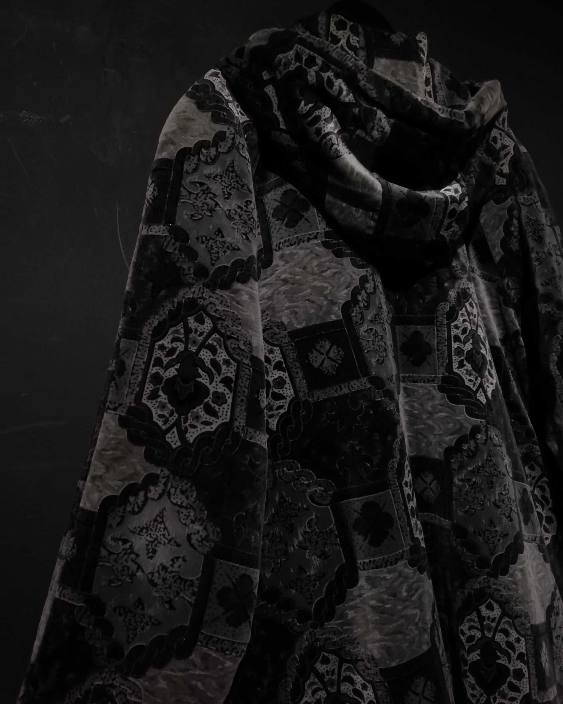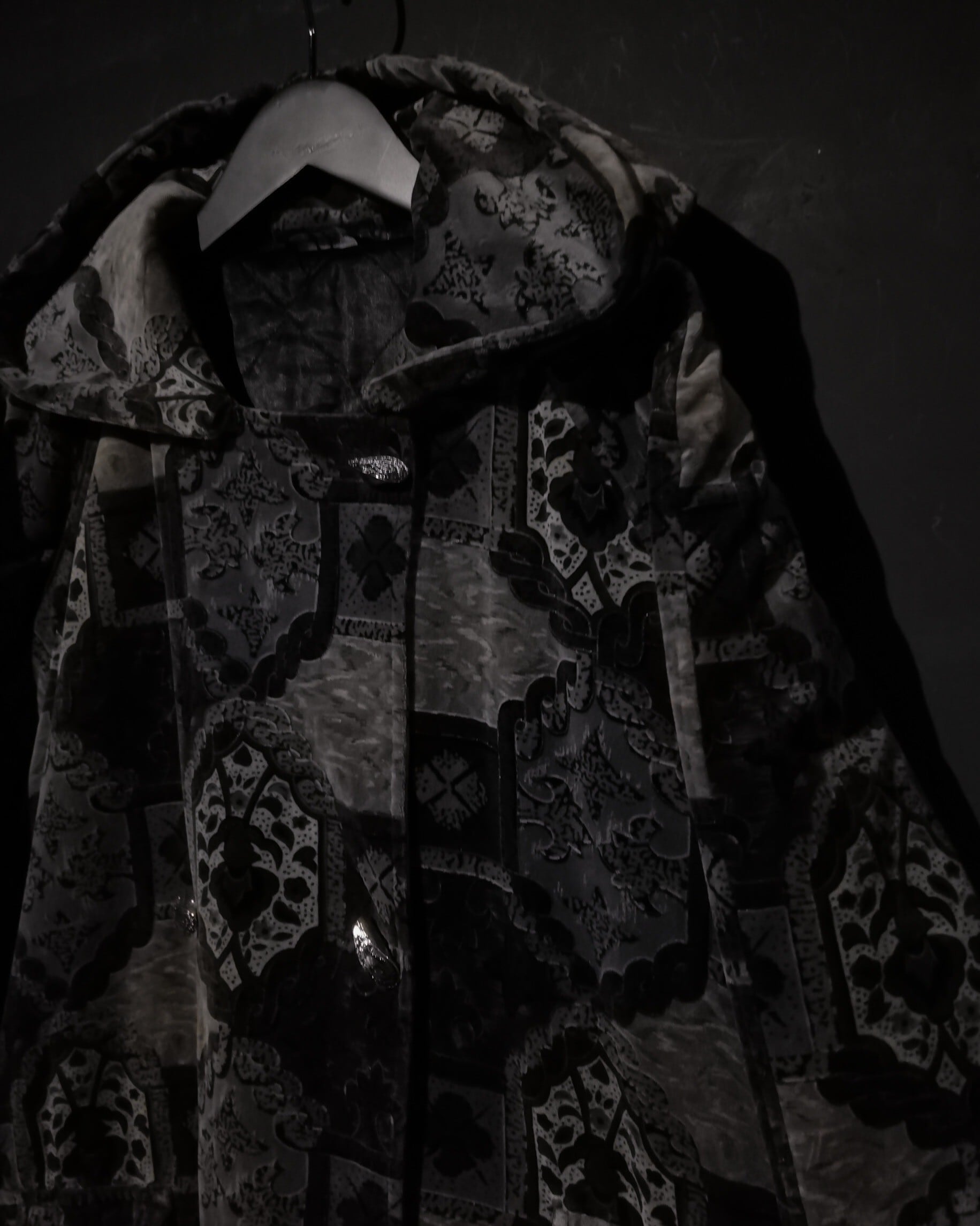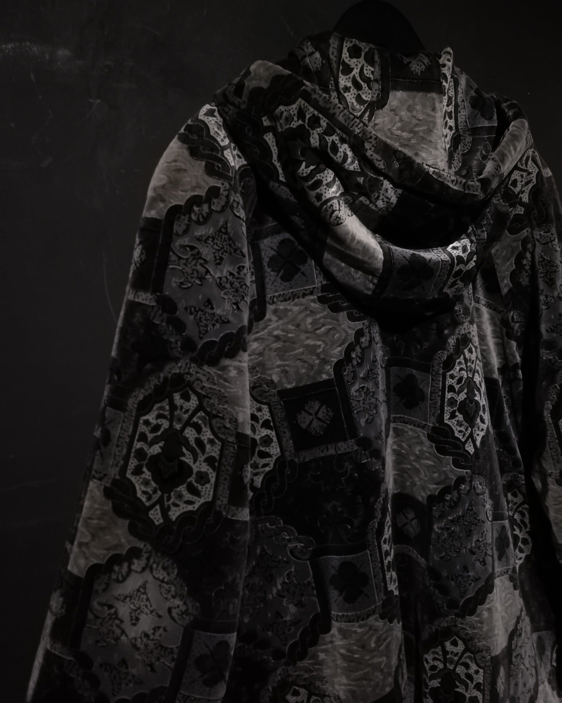 上品な鈍い光沢を帯びたベロア素材のボディに、グレーをベースとしたモノトーンのカラーリングで、エスニックな雰囲気を漂わせる美しい柄を載せたフード付きのロングコート。
