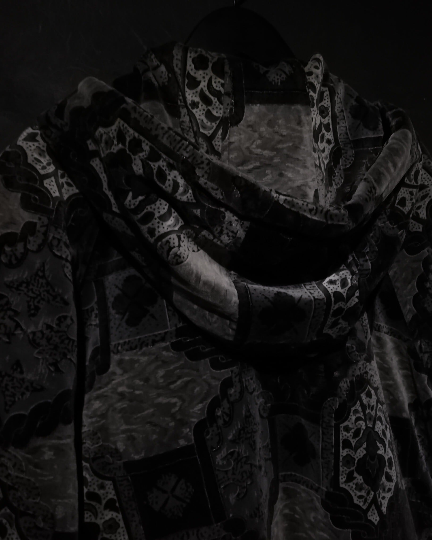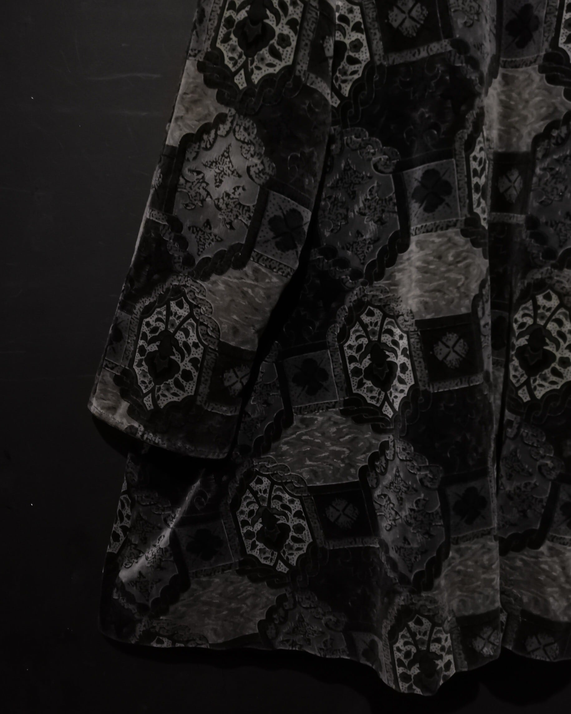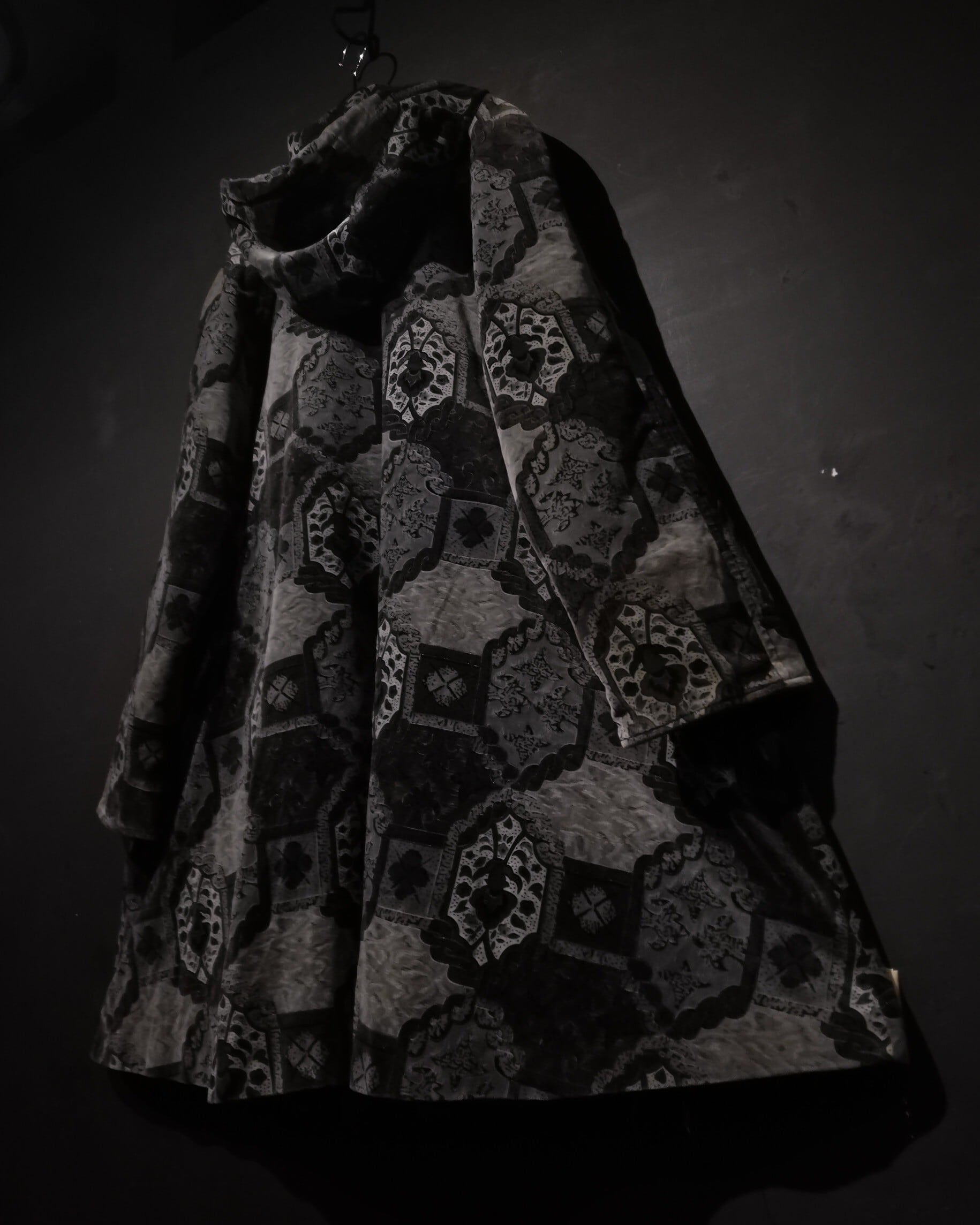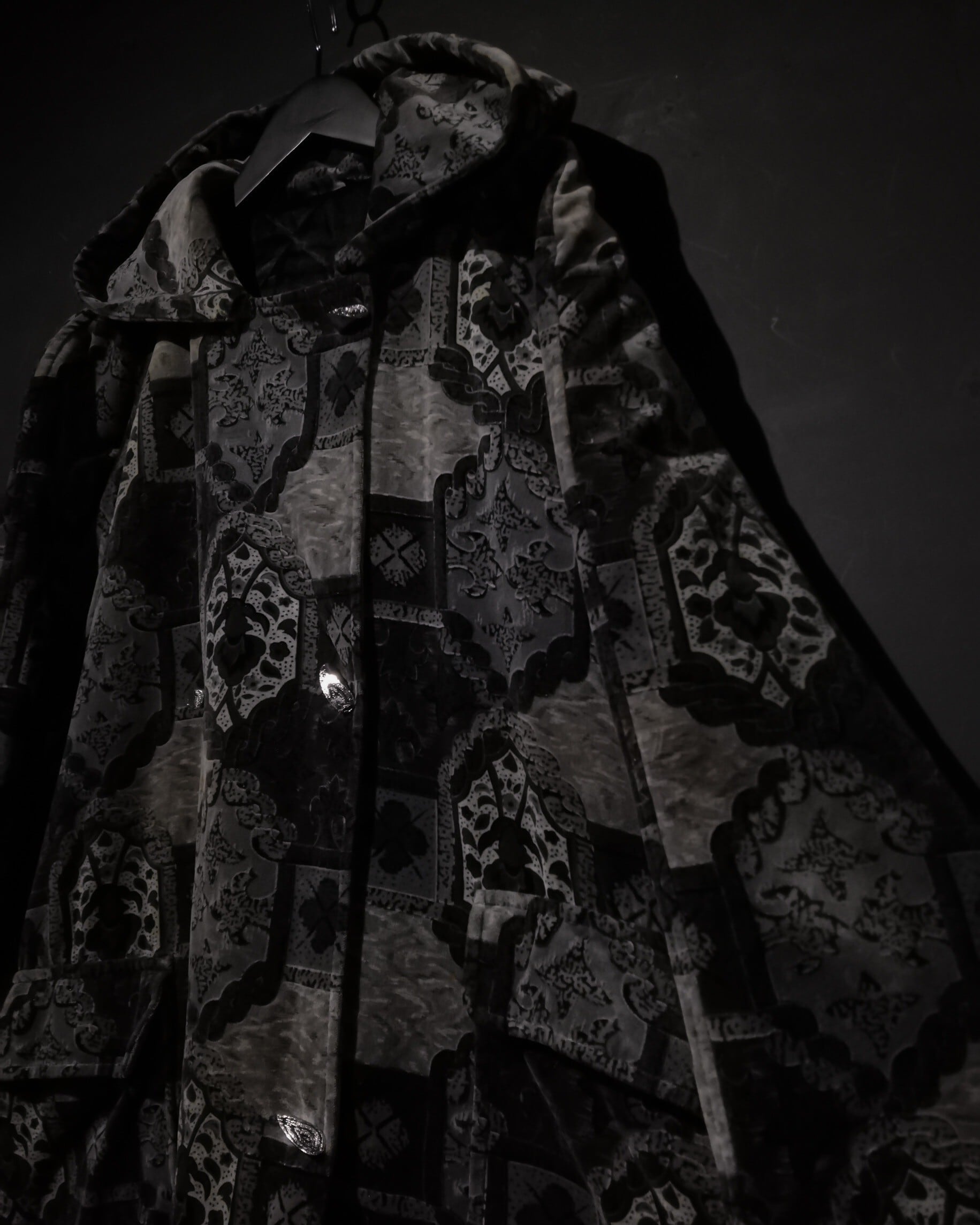 上品な鈍い光沢を帯びたベロア素材のボディに、グレーをベースとしたモノトーンのカラーリングで、エスニックな雰囲気を漂わせる美しい柄を載せたフード付きのロングコート。