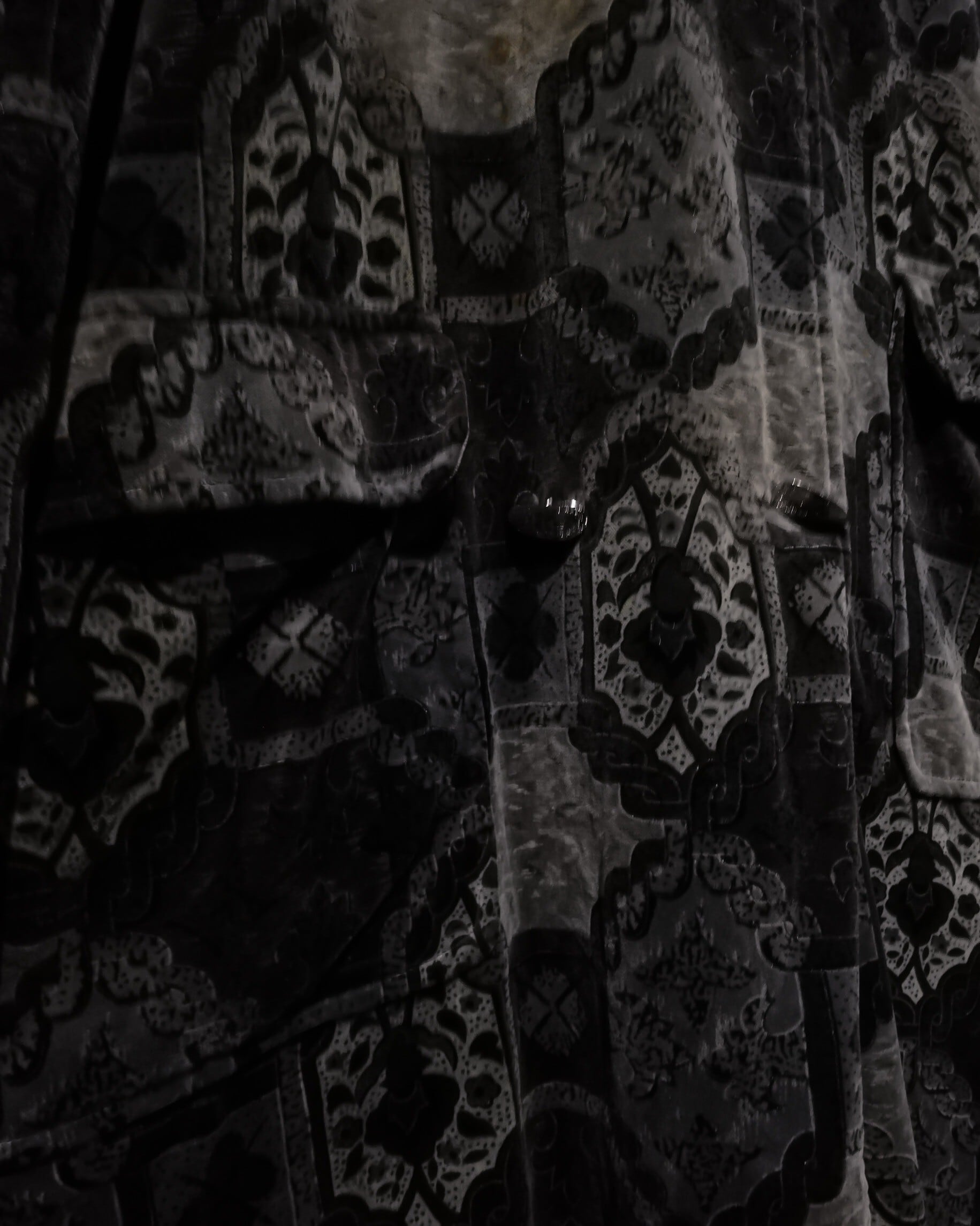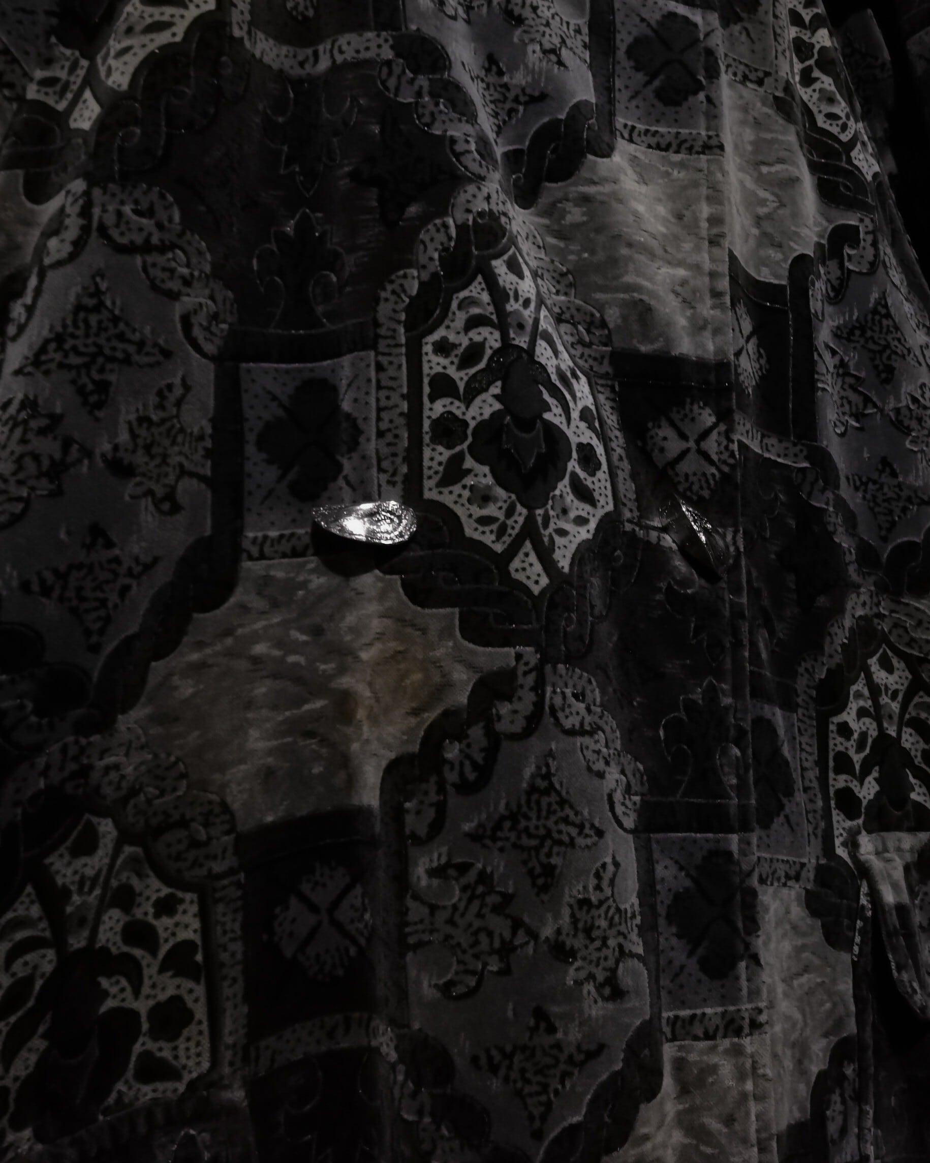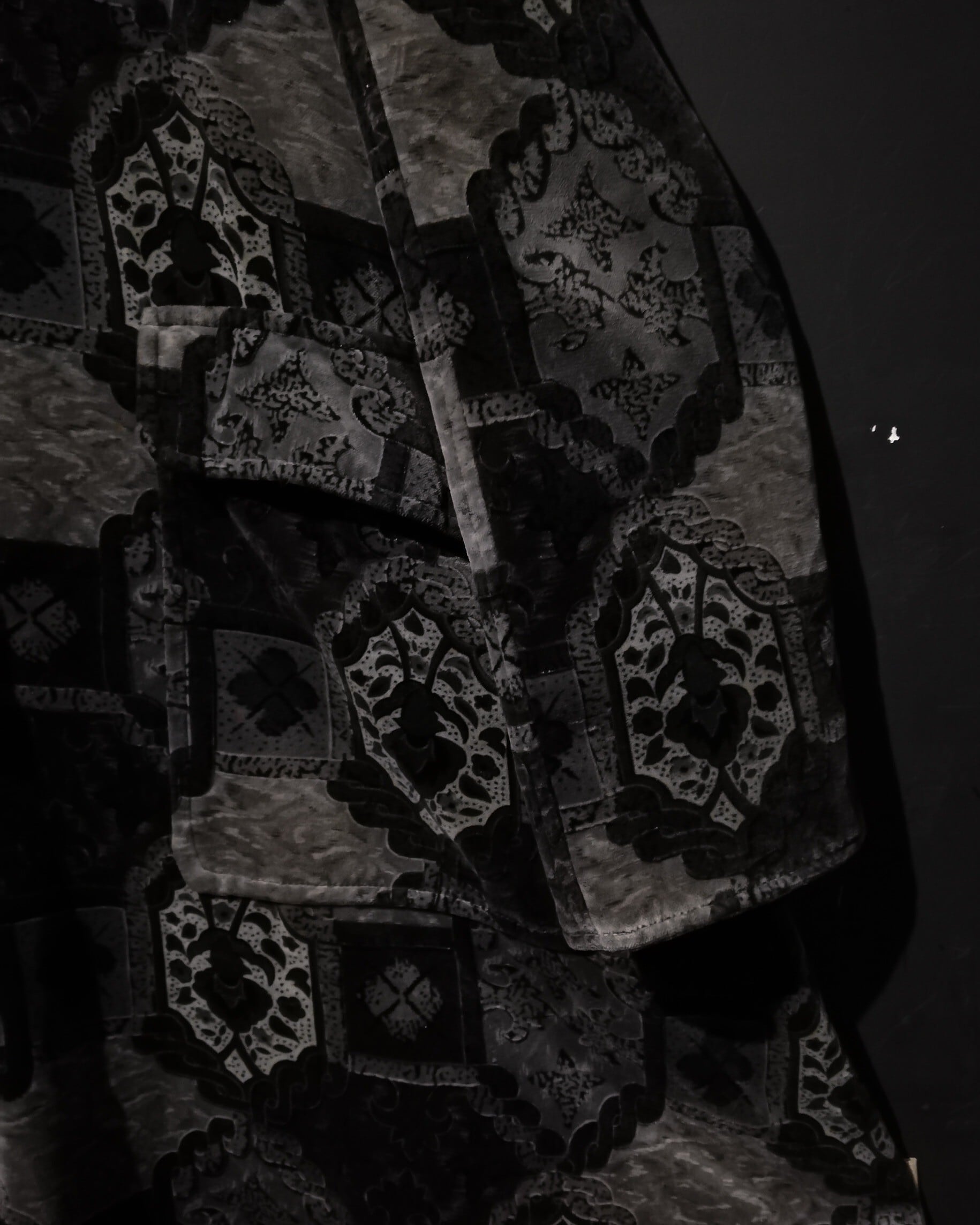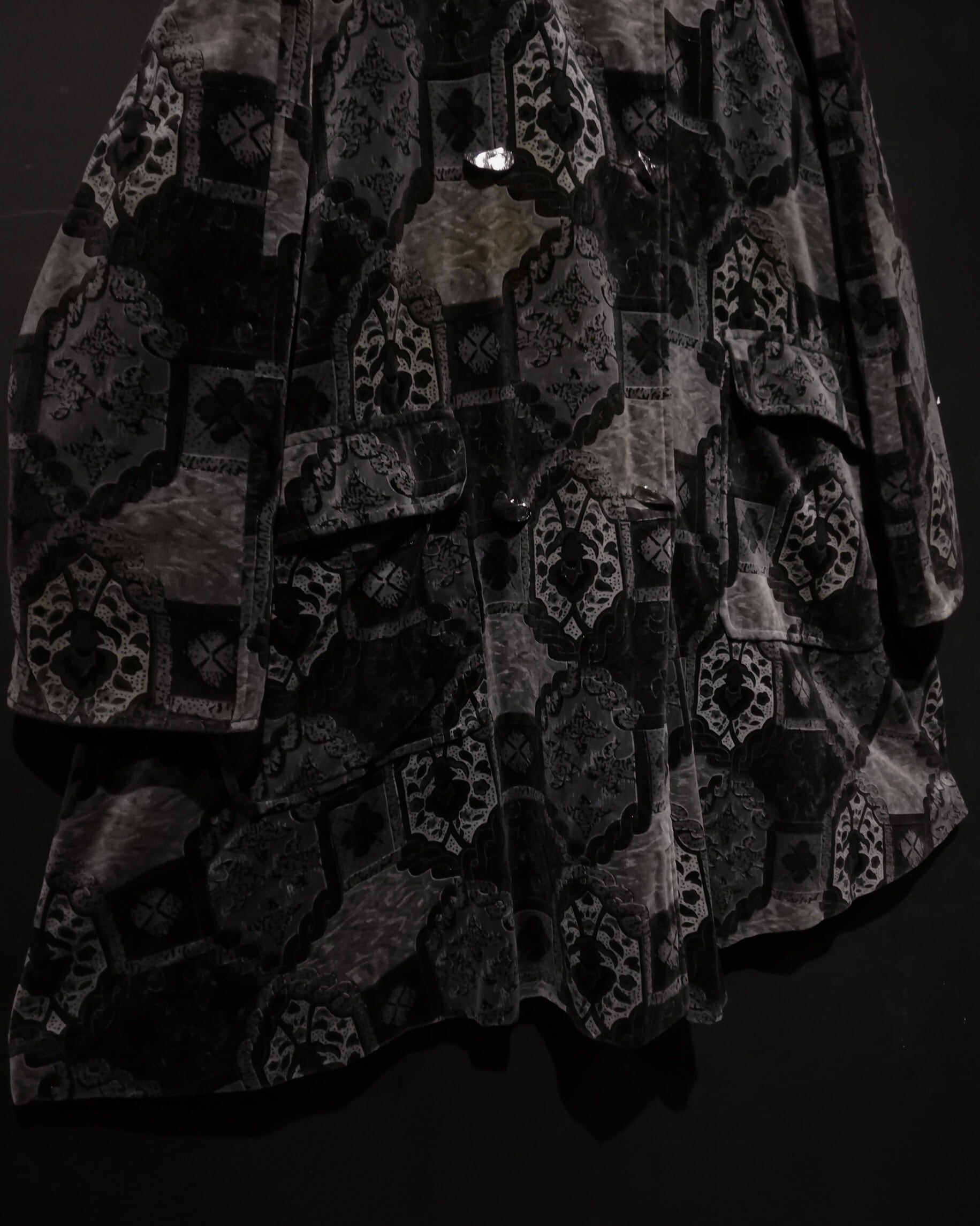 上品な鈍い光沢を帯びたベロア素材のボディに、グレーをベースとしたモノトーンのカラーリングで、エスニックな雰囲気を漂わせる美しい柄を載せたフード付きのロングコート。