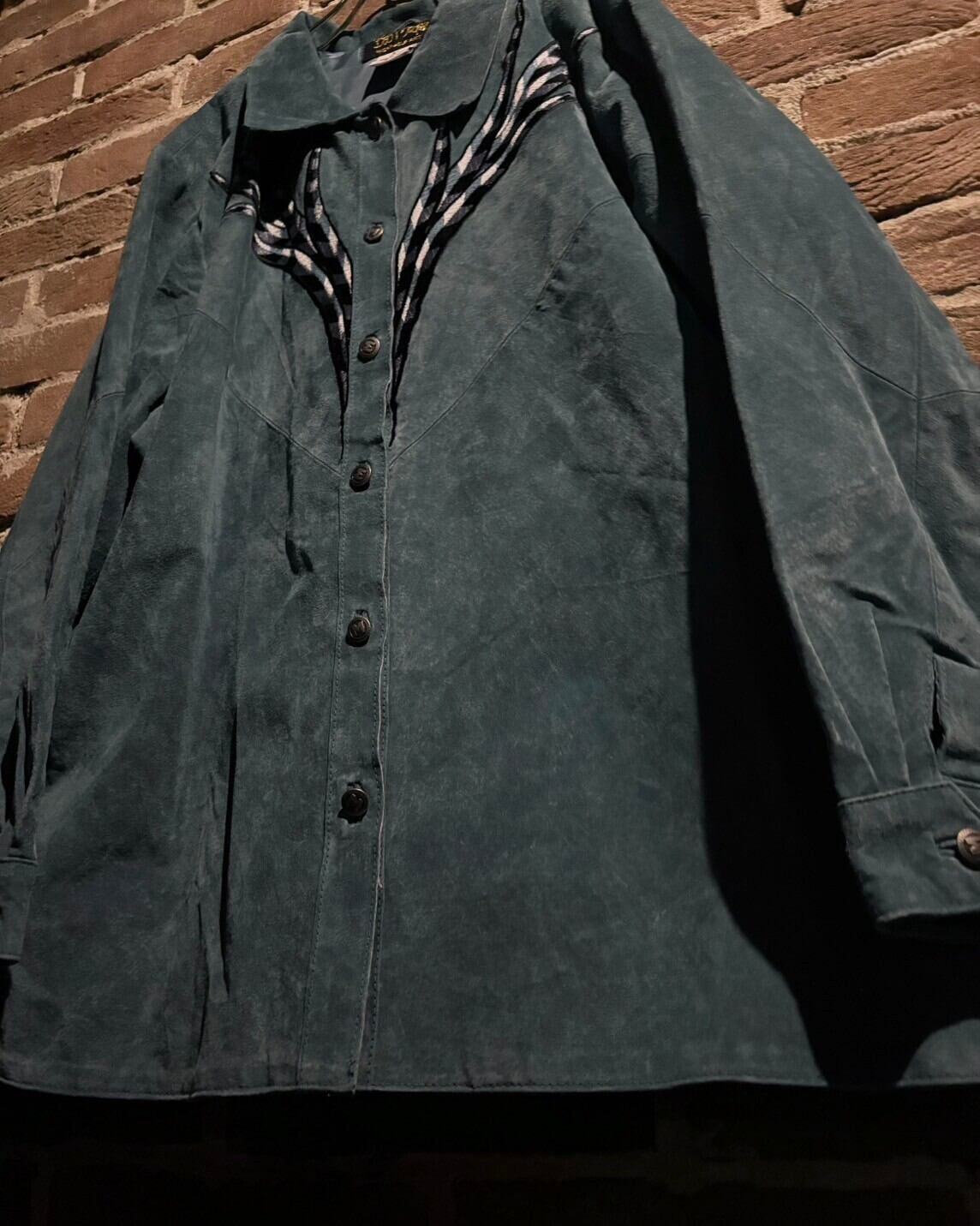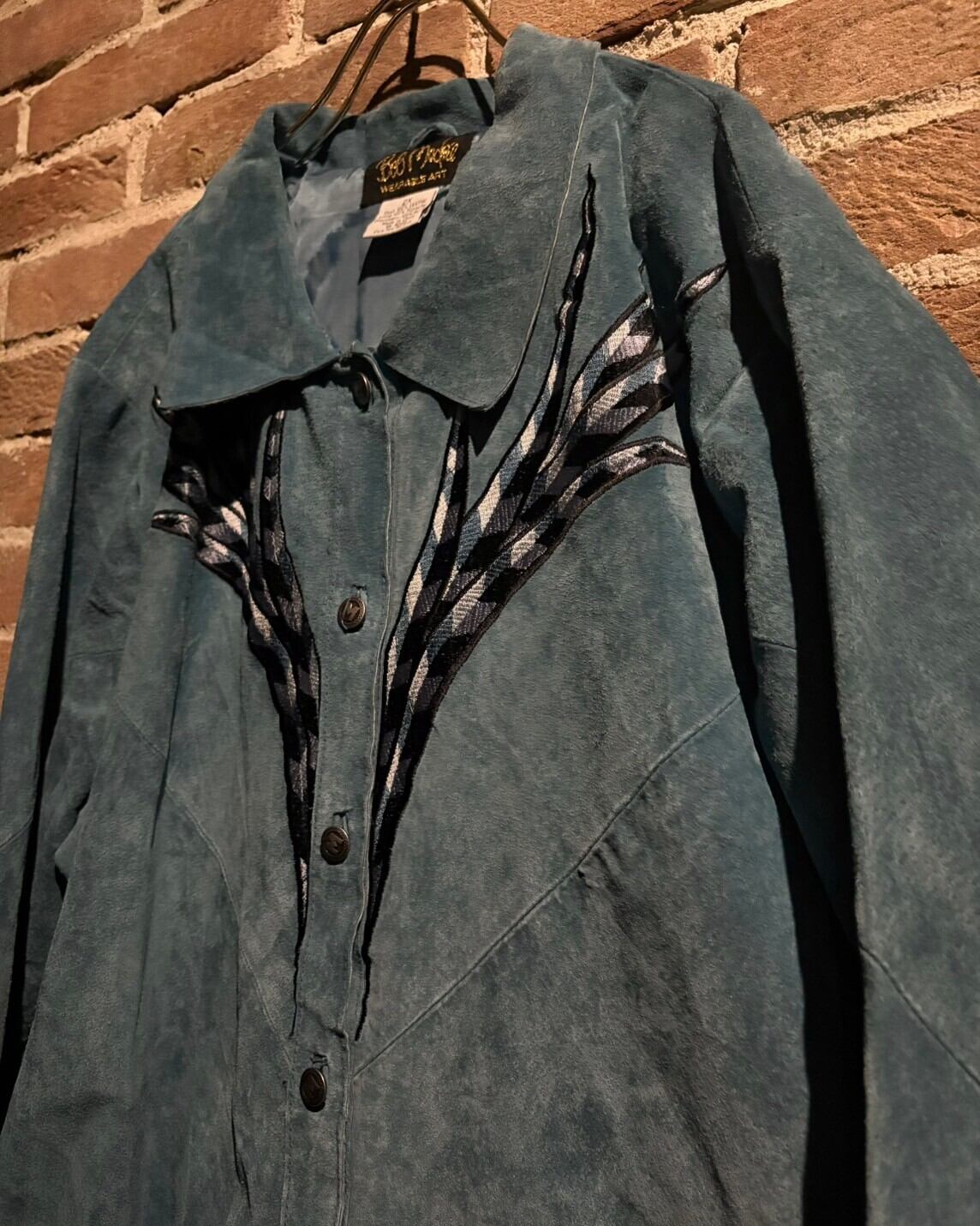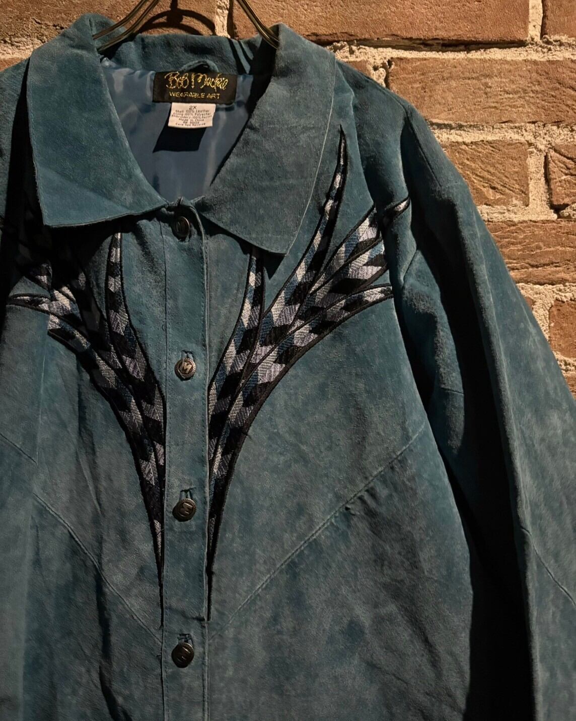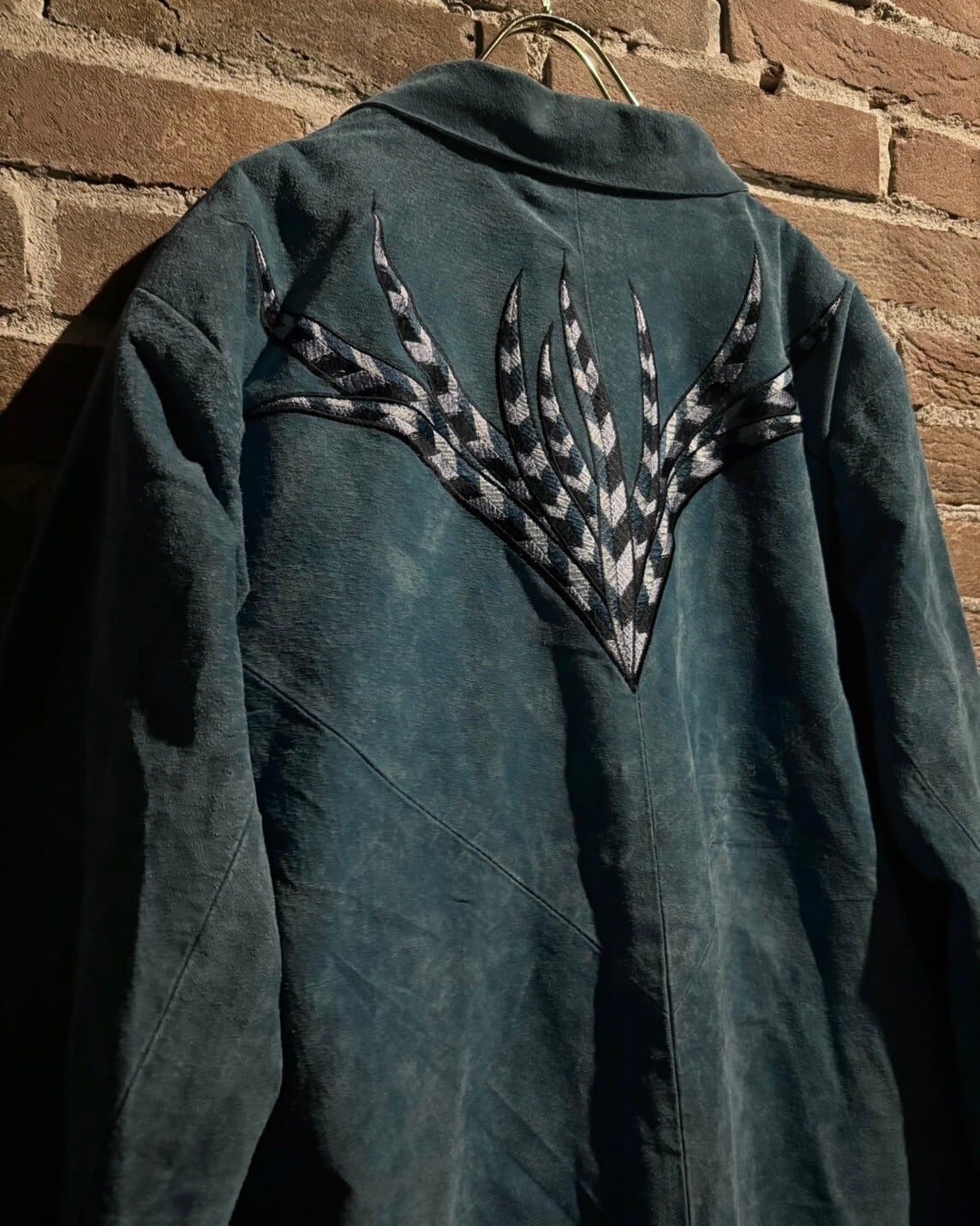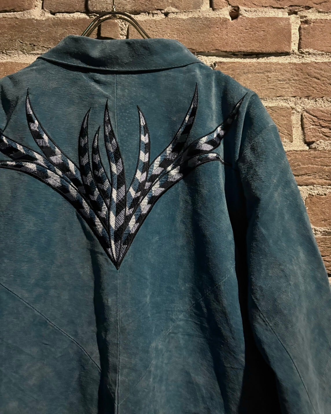 しっとりと柔らかく上質なライトブルーのスエードレザーのボディに、ヨークにアーティスティックな刺繍を刻んだレザージャケット。