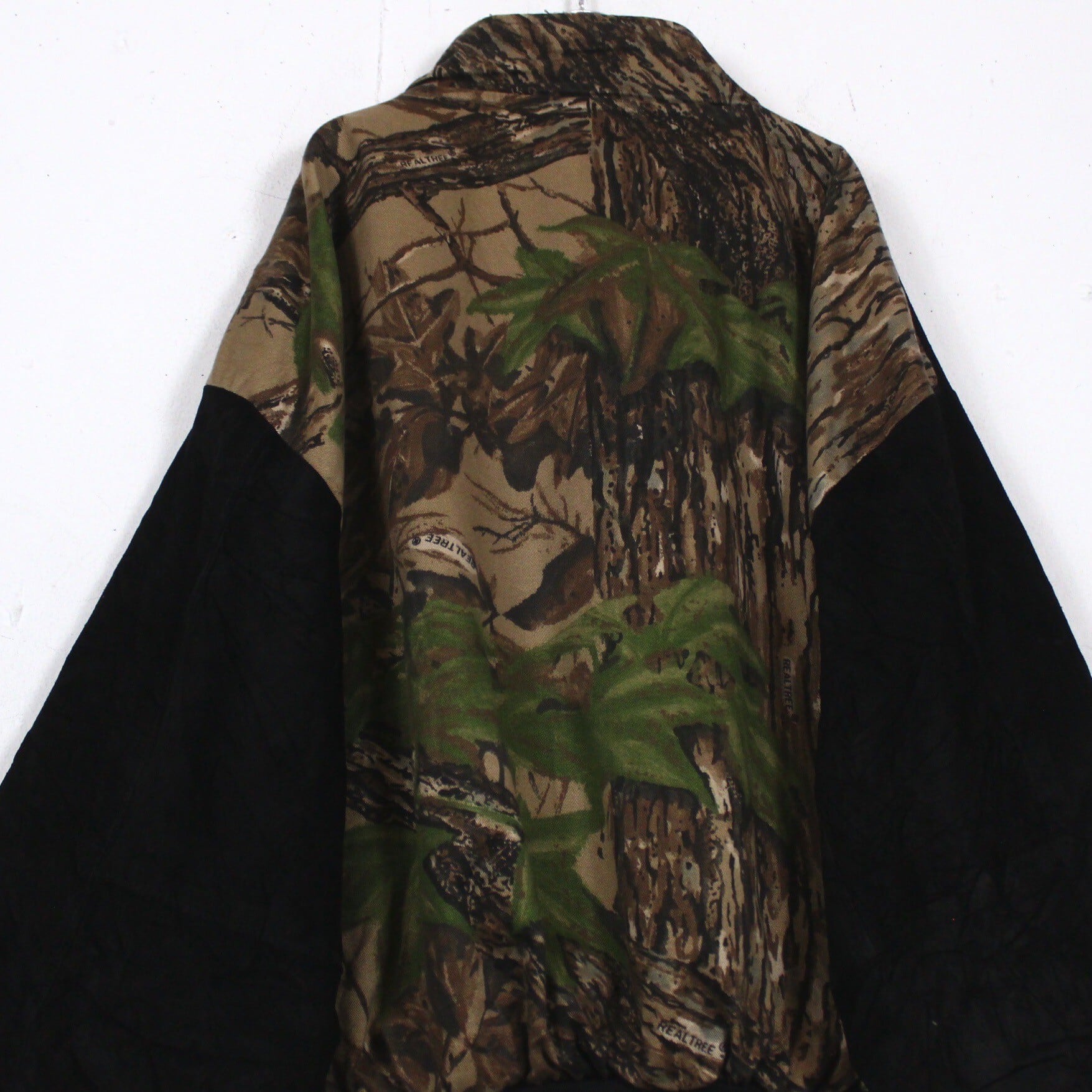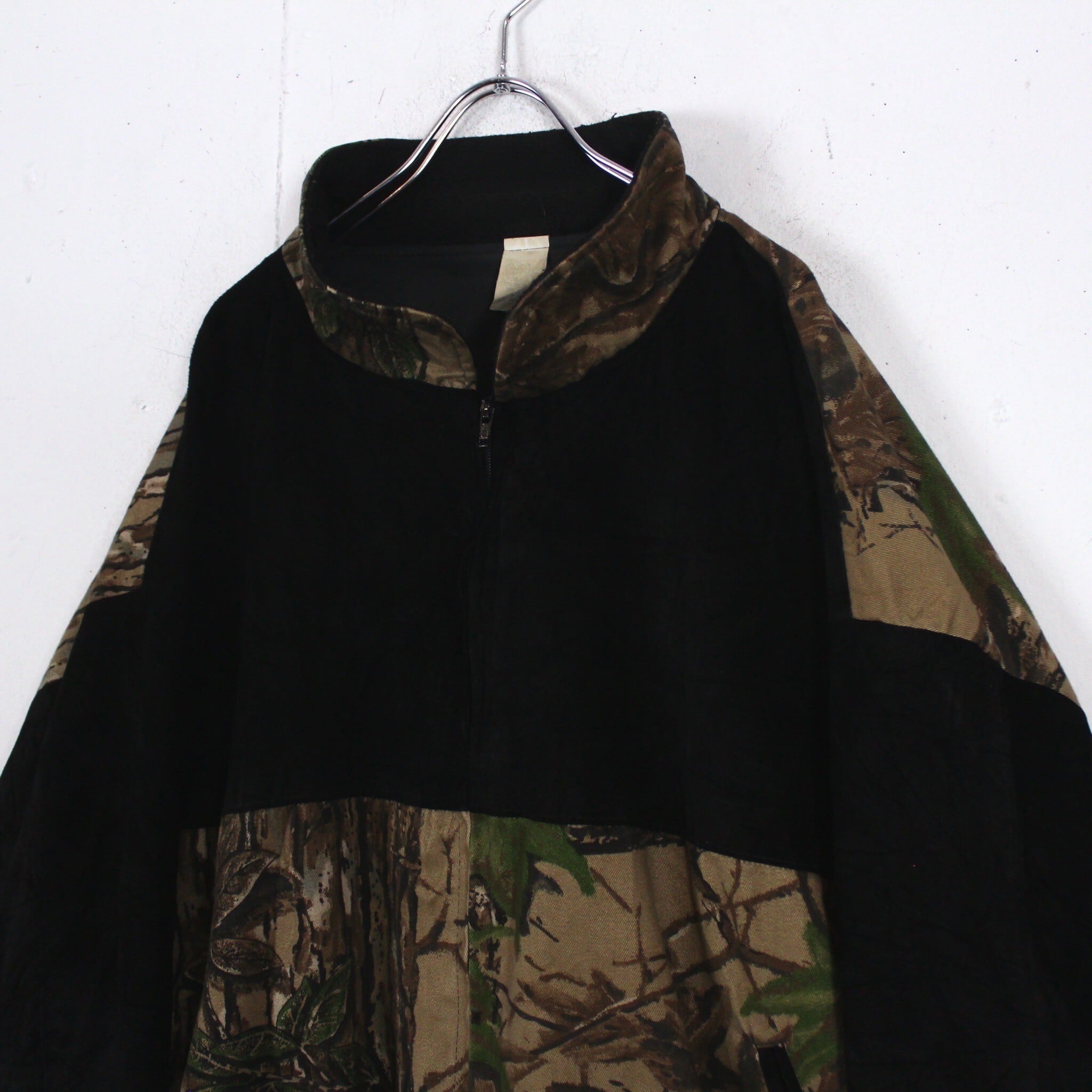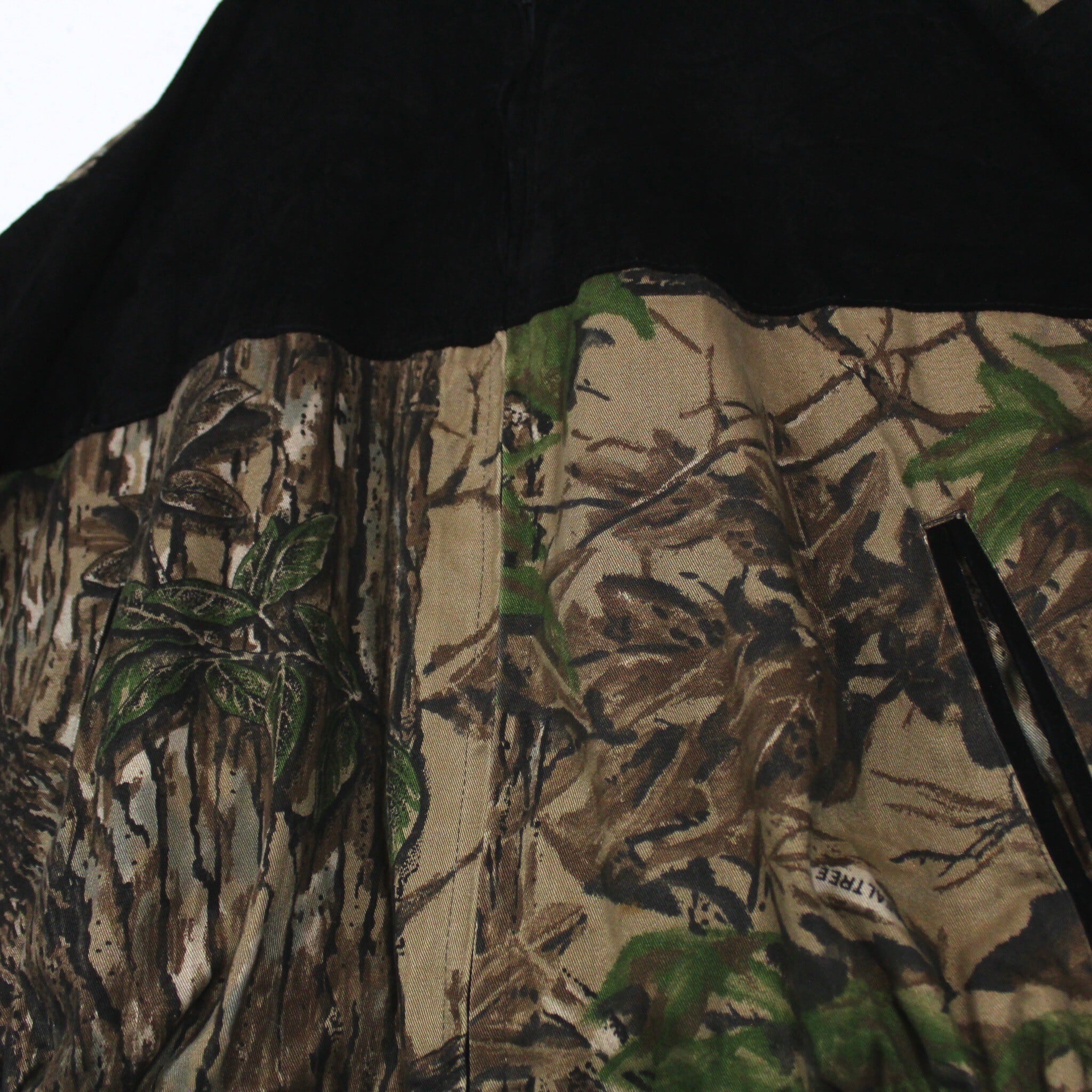 ブラックのフェイクスエードのボディをベースに、昨今のトレンドでもあるリアルツリーカモ柄を切り替えたジャケット。