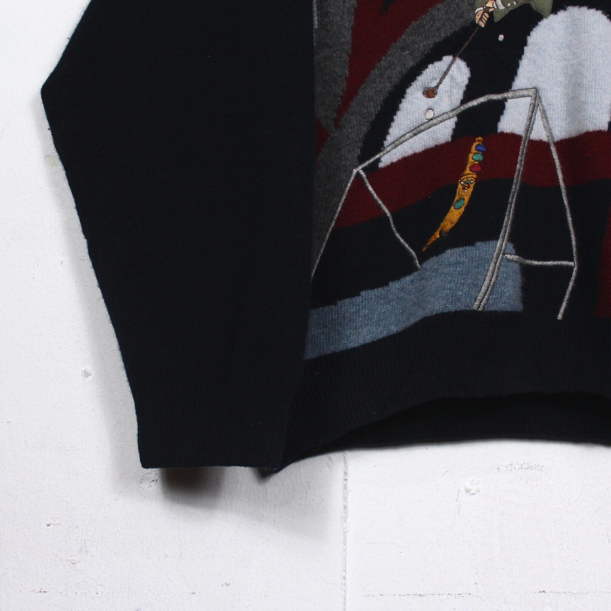 柔らかく肌触りの良いウールを用いて、男性がボールを探す途中にお宝を発見した、、、といシーンを繊細なニッティングで表現した、イタリーメイドのユニークな1着。