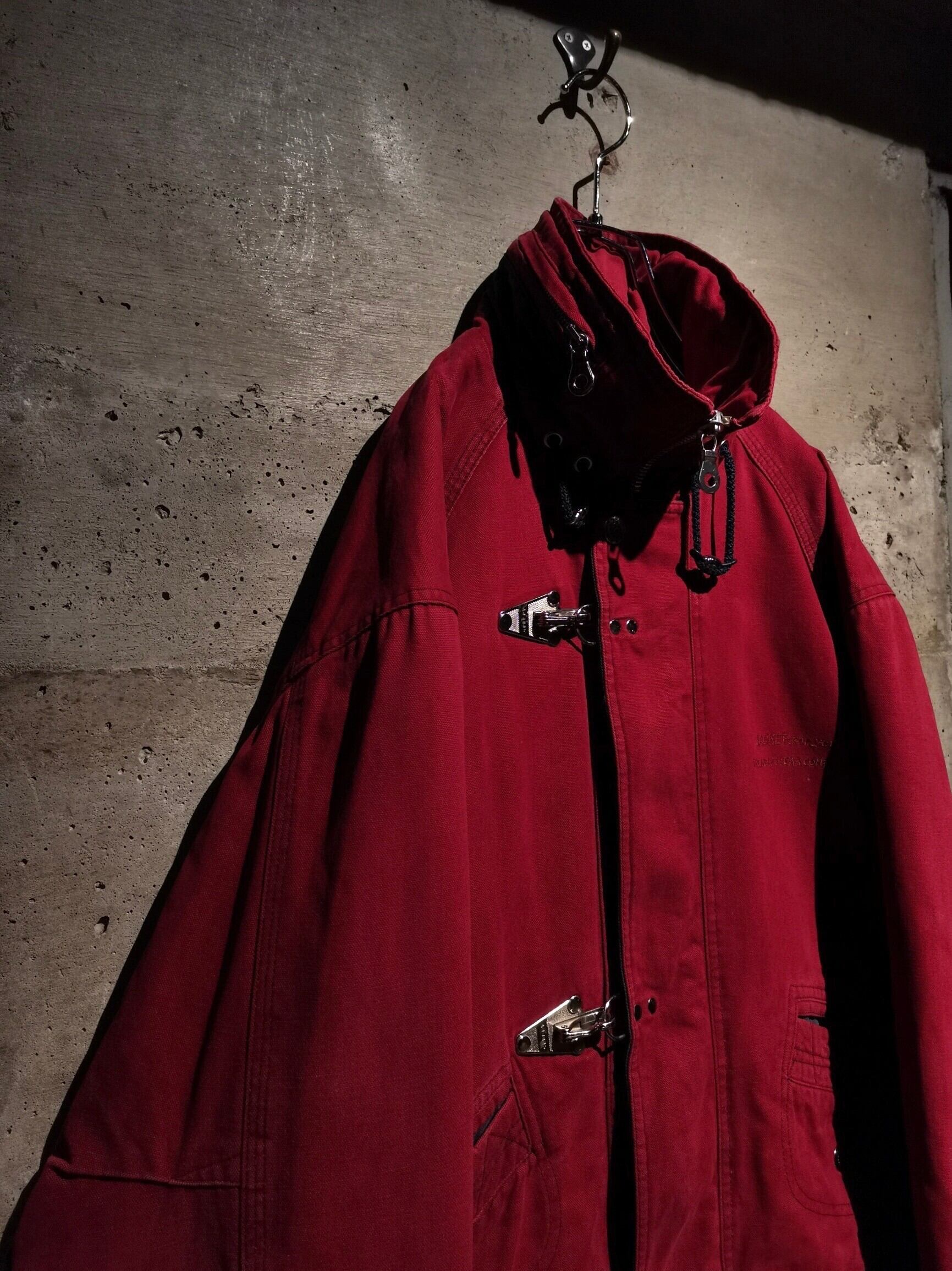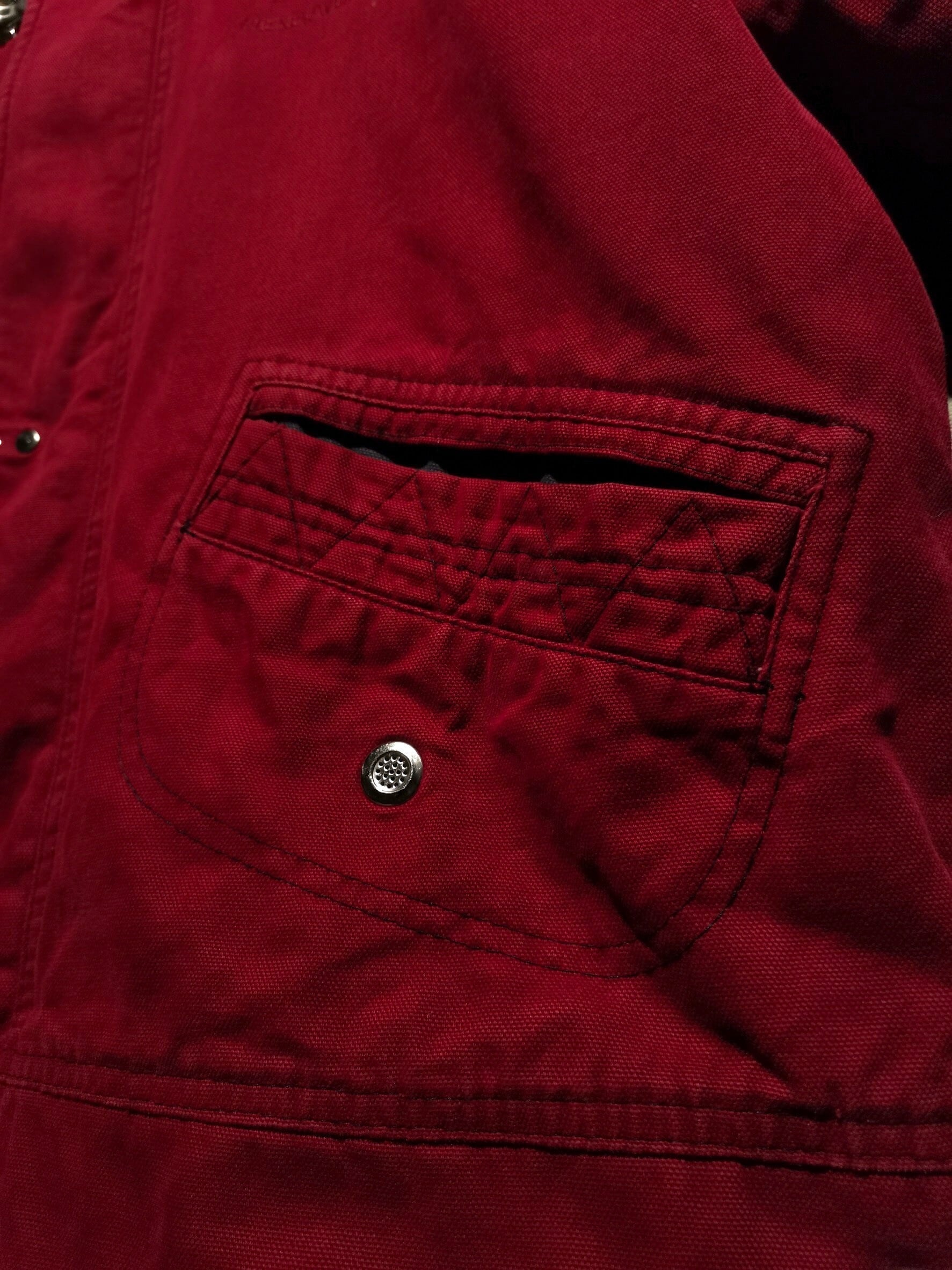 経年によるフェードが効いた赤のダック地のボディをボディに用い、フロントに重厚感のあるシルバーのファイアーマンバックルを施した1着。