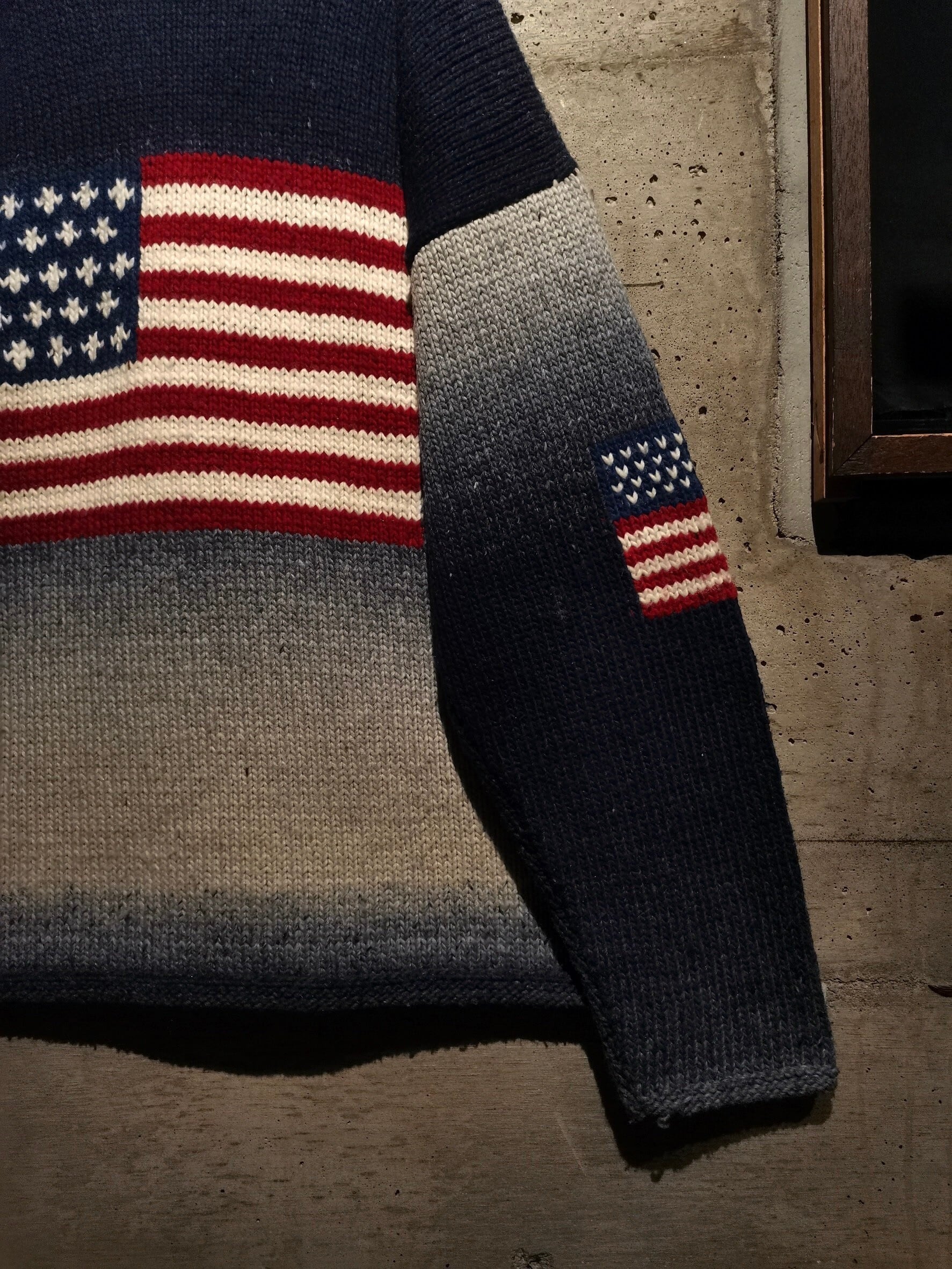 ネイビー×ホワイトをベースとした、ボーダー状のグラデーションをボディ全体に映し出し、星条旗を前背面&両袖に載せたエクアドルニット。