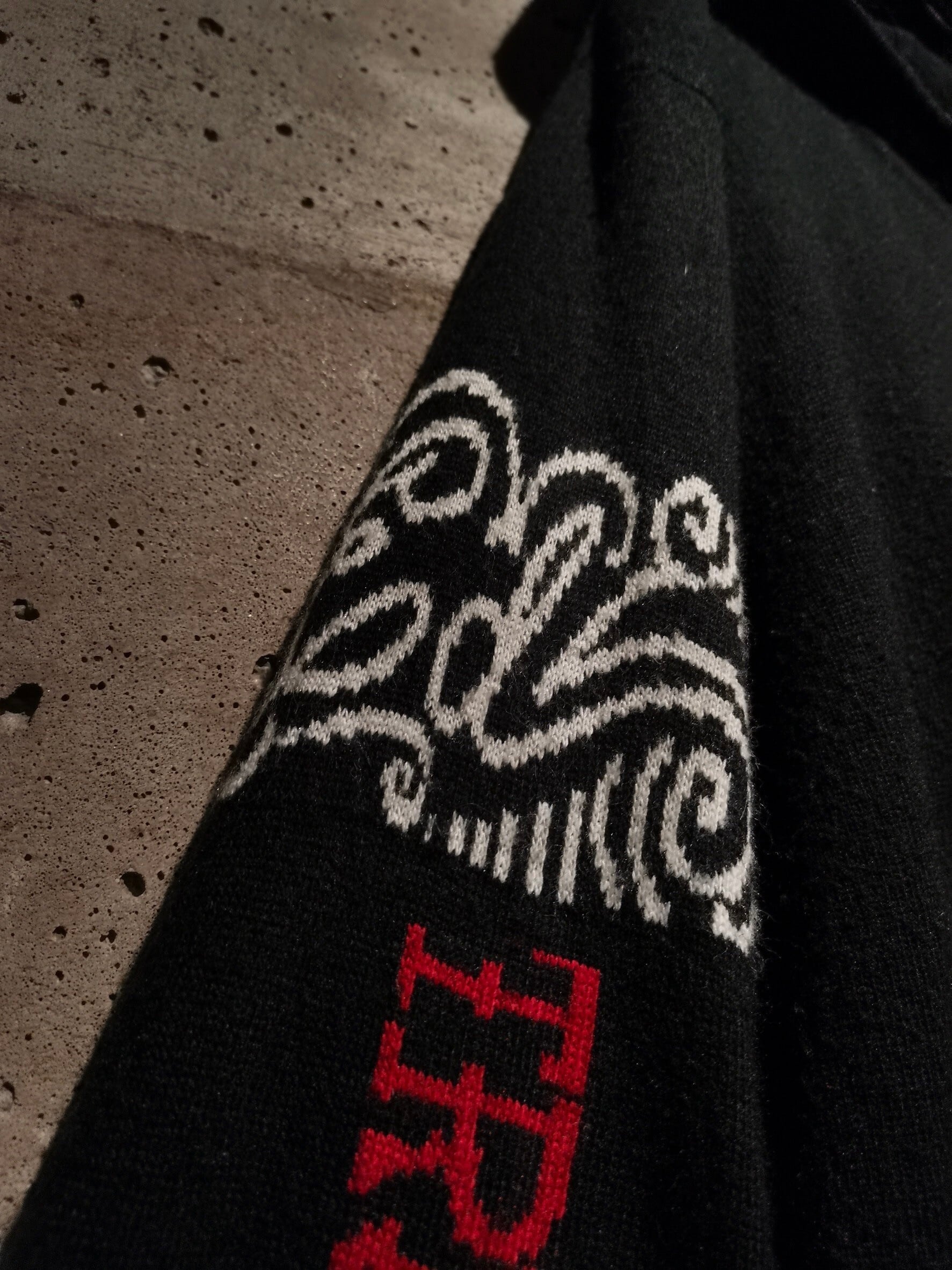 滑らかな手触りのニット生地をボディに用い、同ブランドではお馴染みのアメトラテイストのタトゥーデザインを載せたジップアップニットフーディー。
