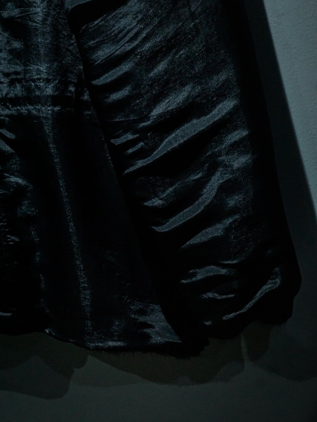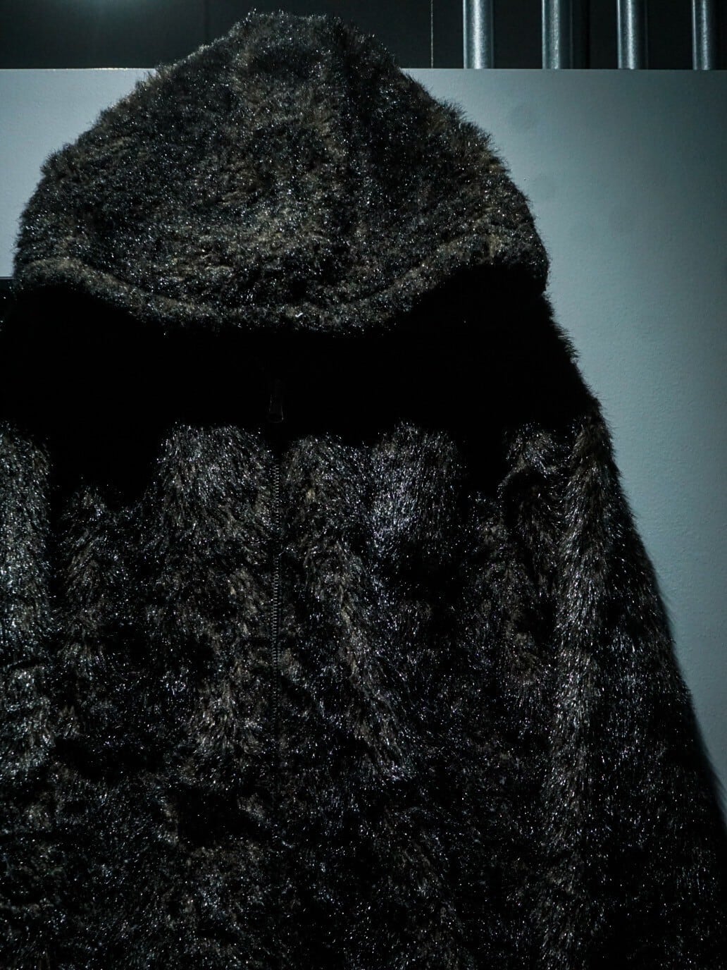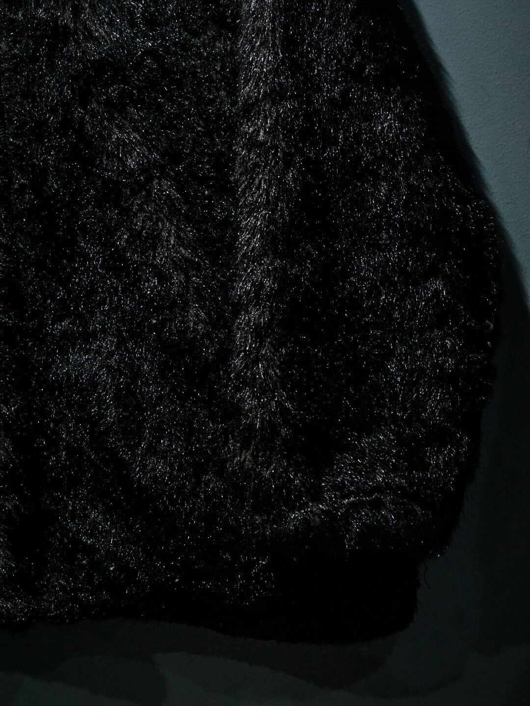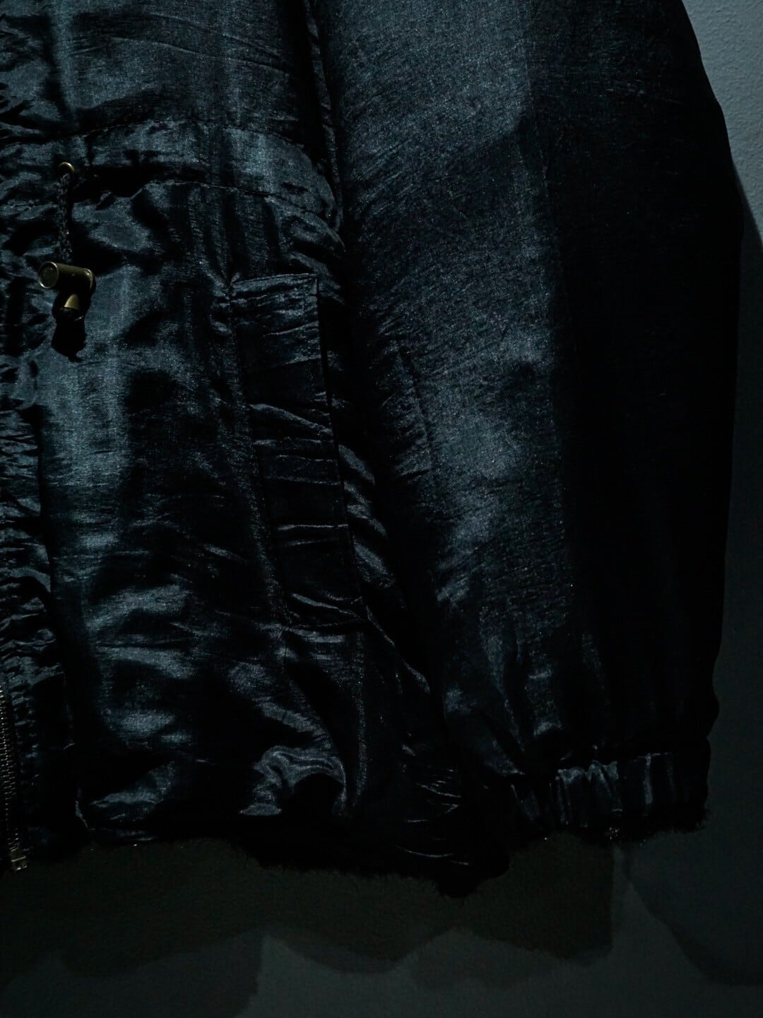 裏面は美しい光沢を帯びたシルク×ナイロンの混紡素材を使用したブラックカラーのボディ。ファー面とは異なる高級感を漂わせつつ、汎用性にも優れたデザインとなっており、両面で異なる存在感を見せる、非常にバランスの取れた仕上がりとなっております。