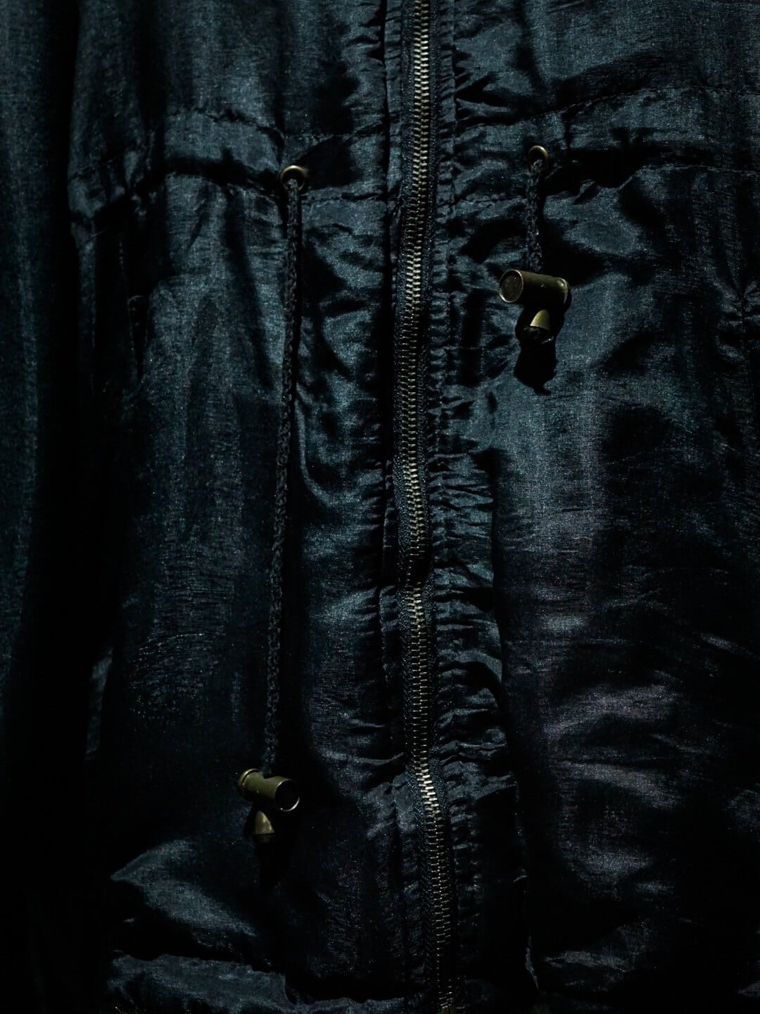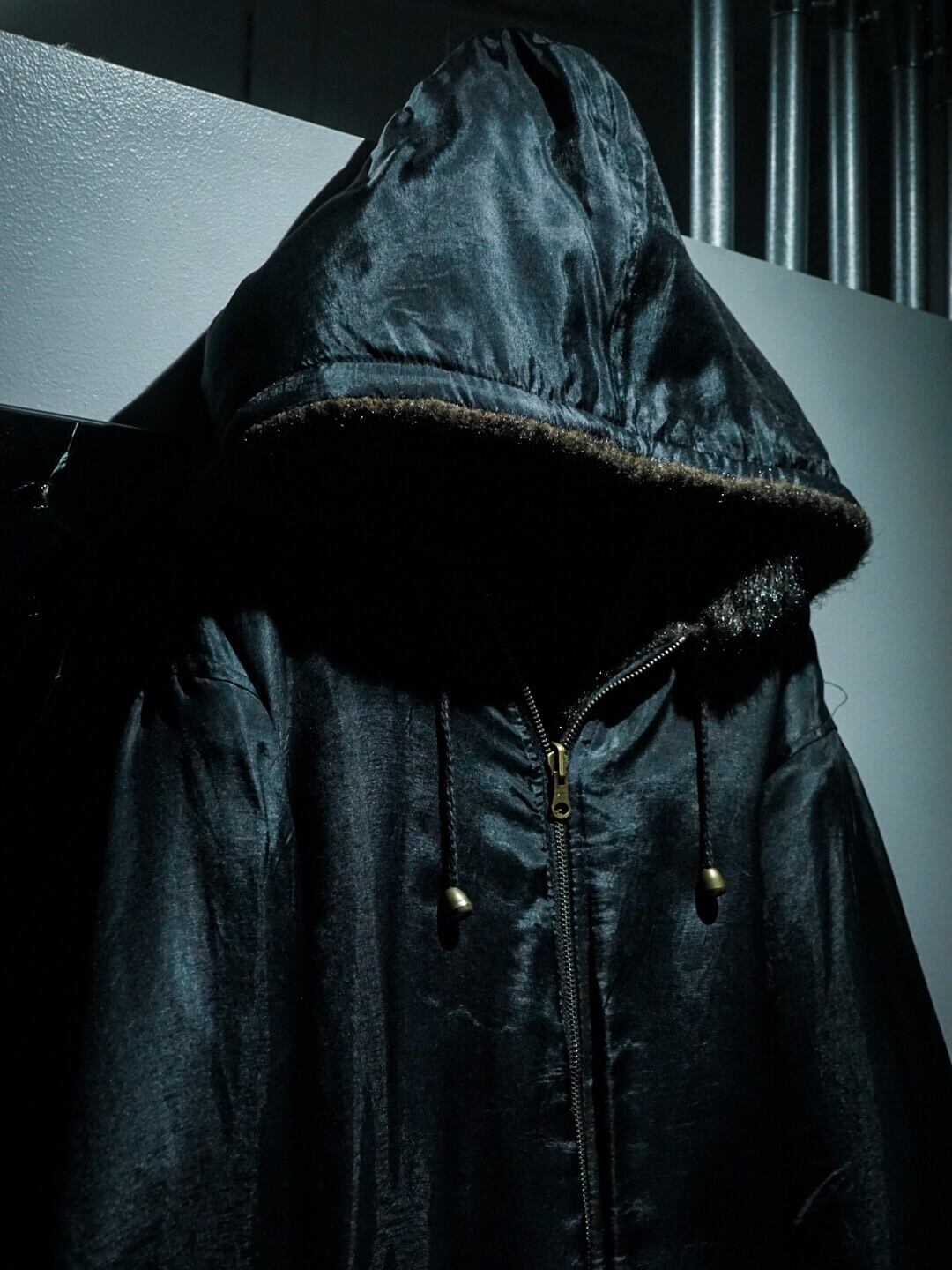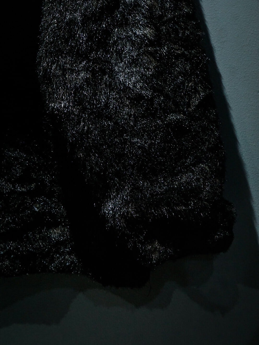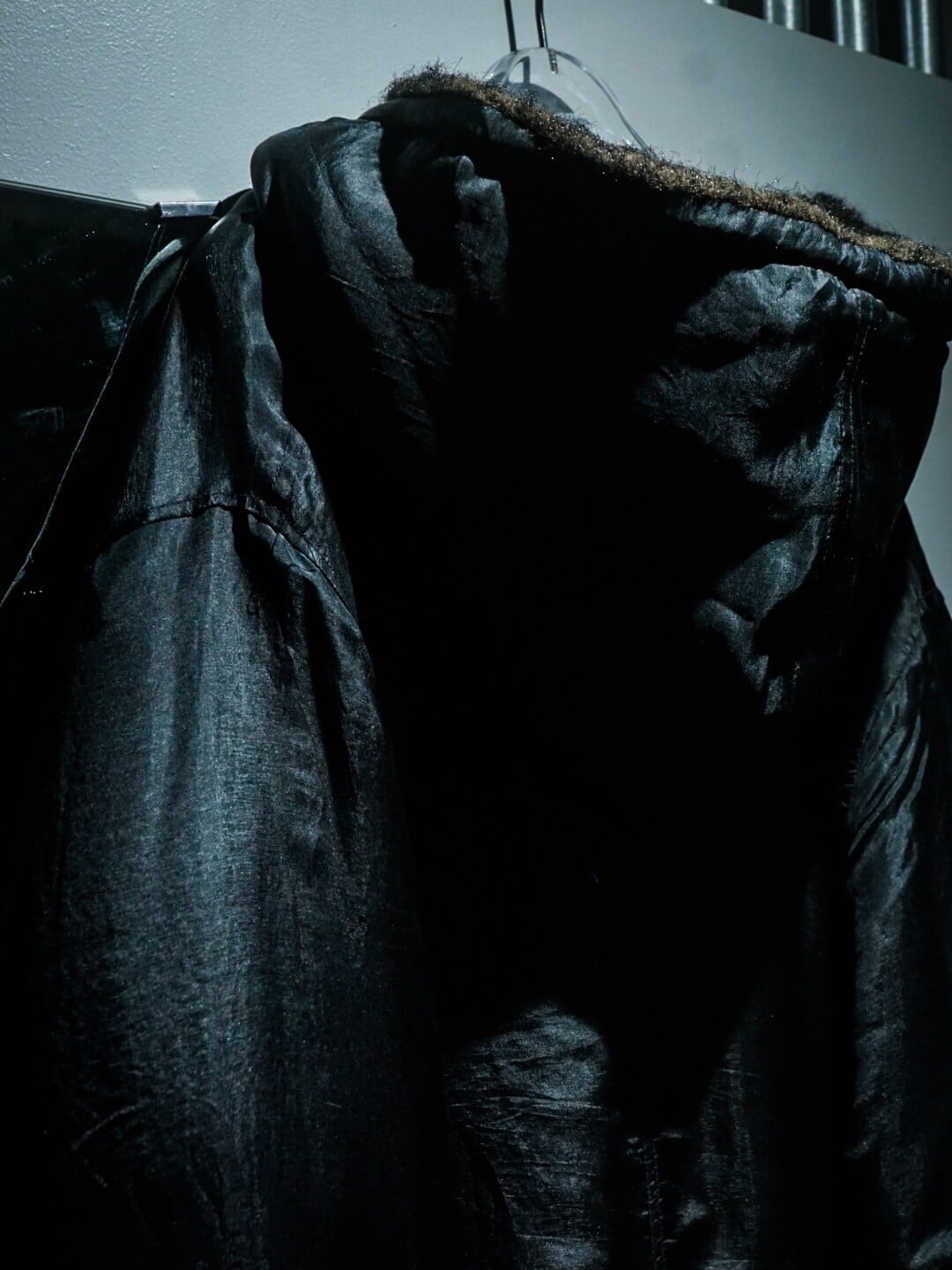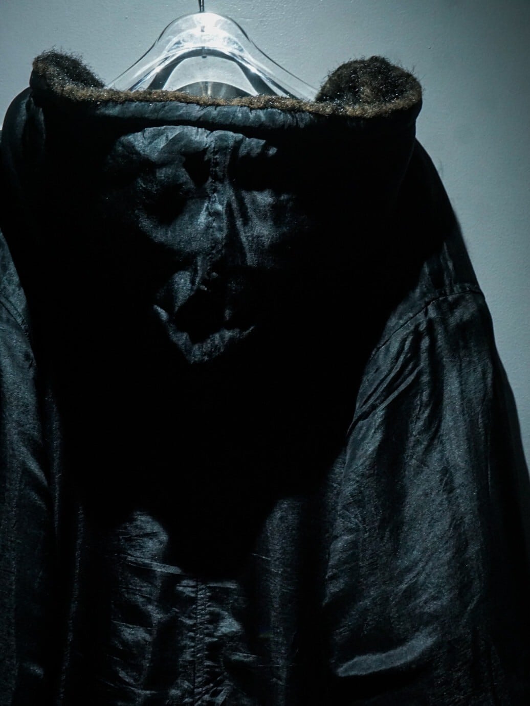 裏面は美しい光沢を帯びたシルク×ナイロンの混紡素材を使用したブラックカラーのボディ。ファー面とは異なる高級感を漂わせつつ、汎用性にも優れたデザインとなっており、両面で異なる存在感を見せる、非常にバランスの取れた仕上がりとなっております。