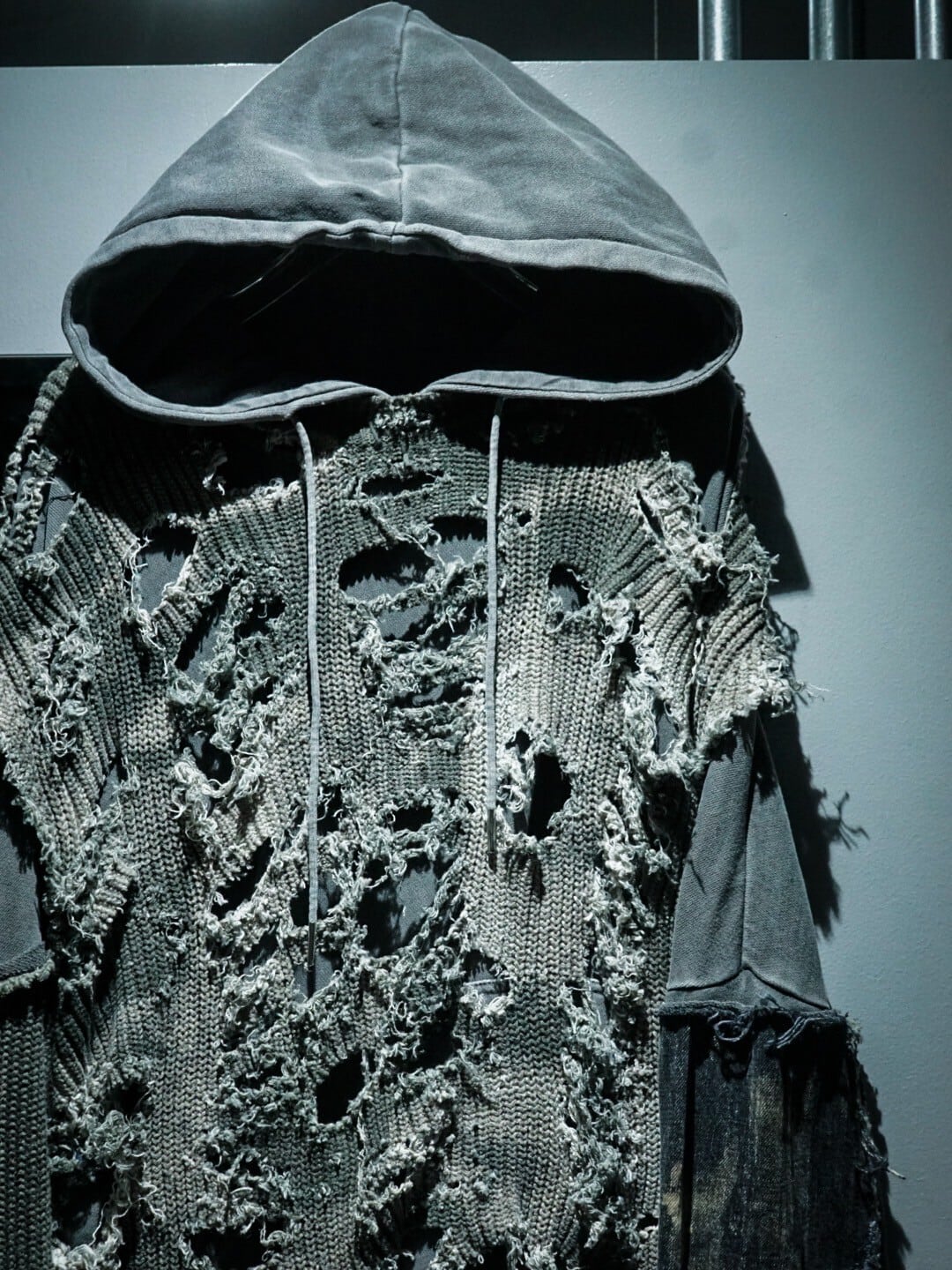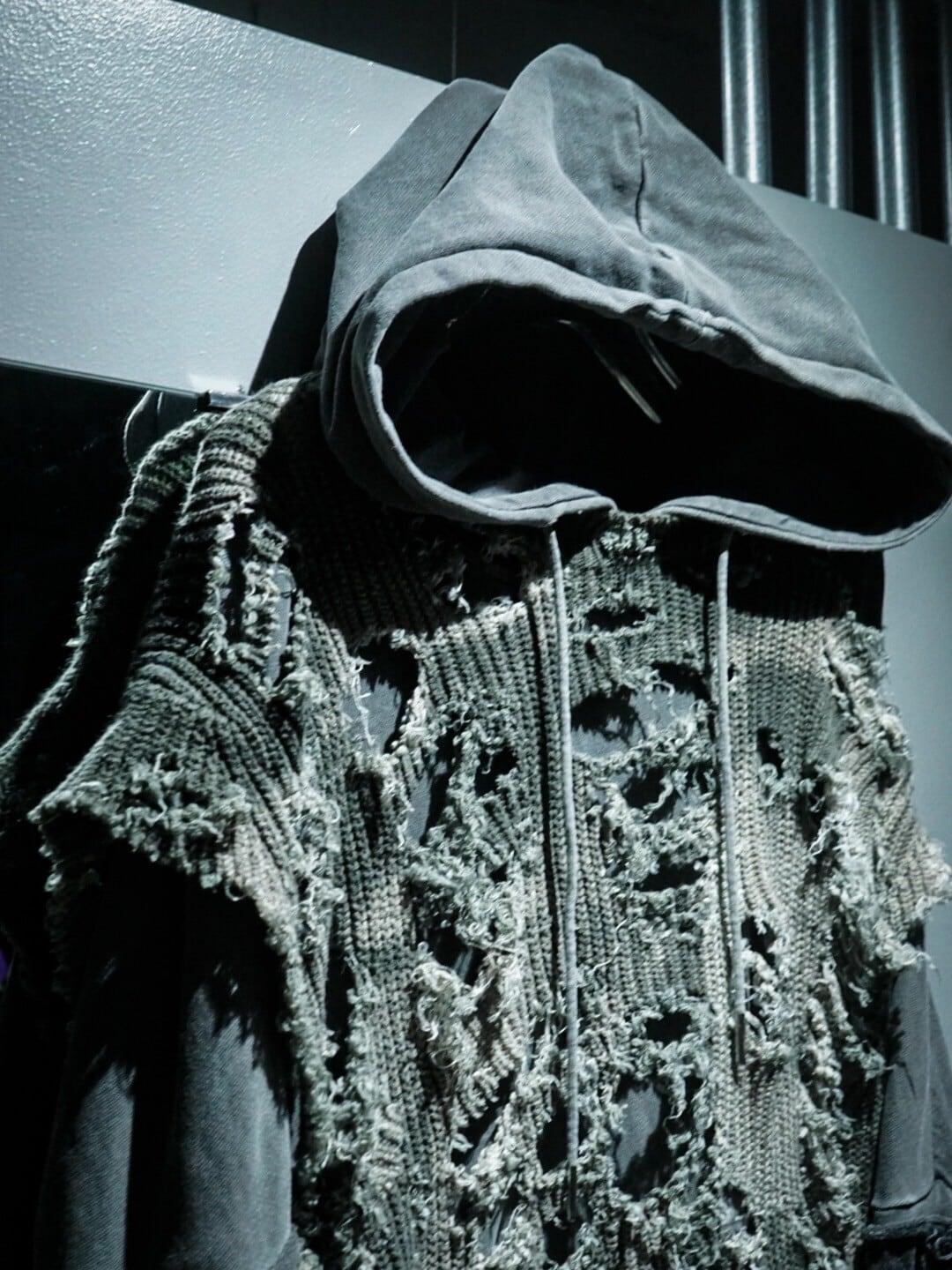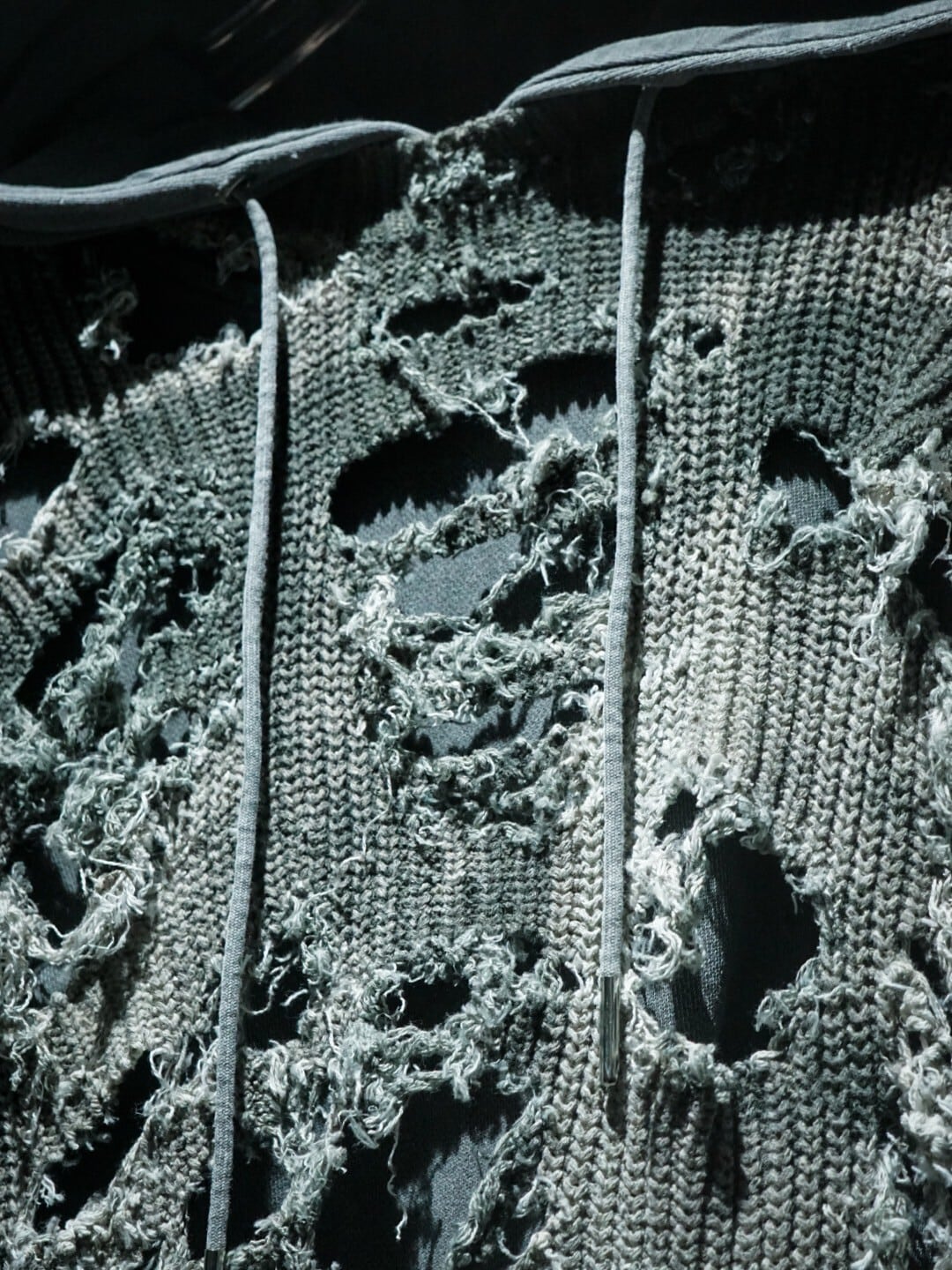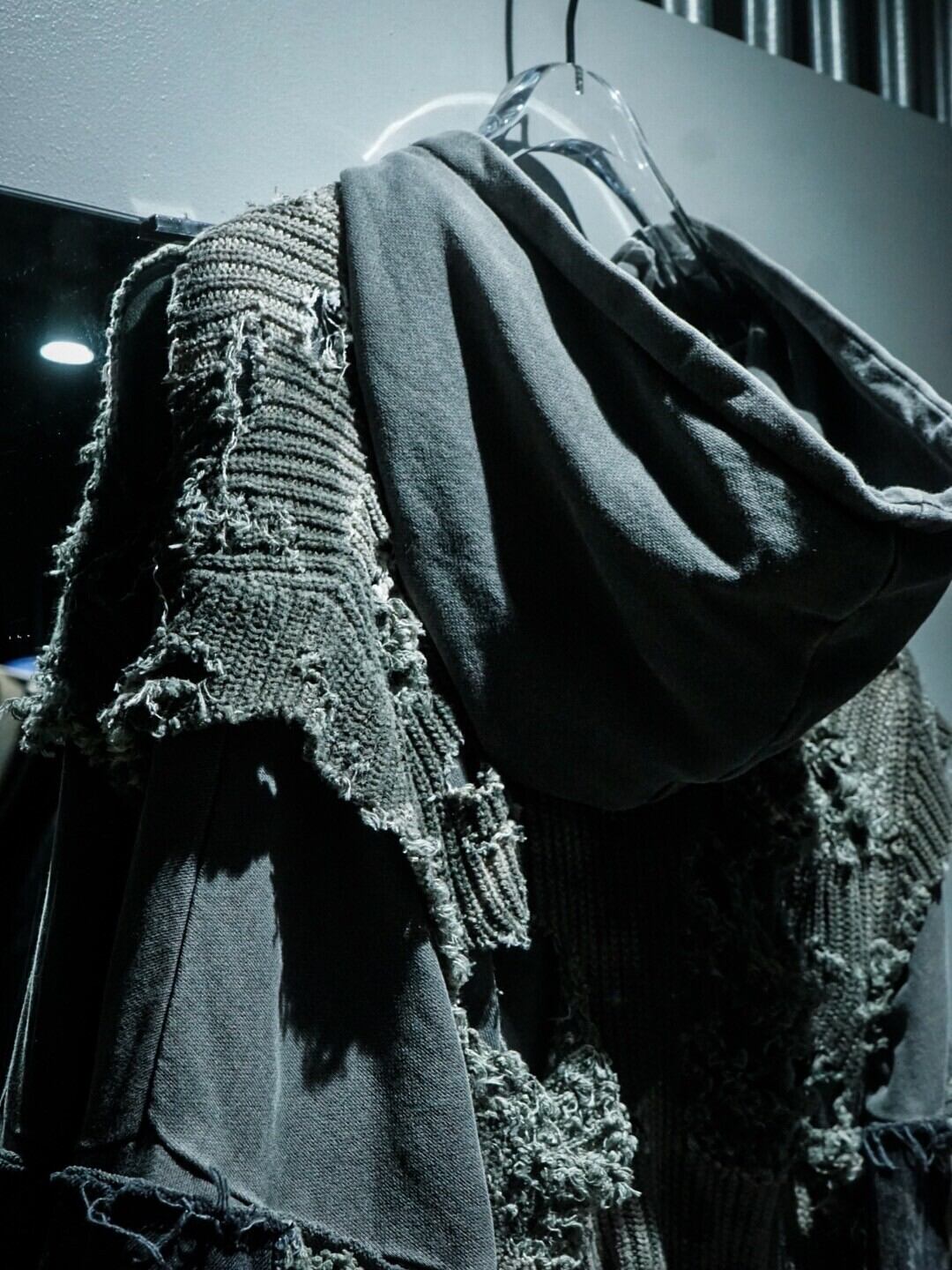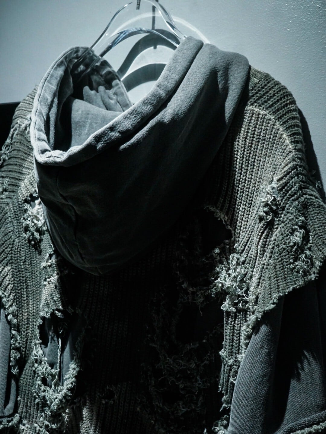 ニットのスリーブとパーカーのスリーブを解体しドッキングさせ、スーパーロングスリーブにしたスペシャルな1着。