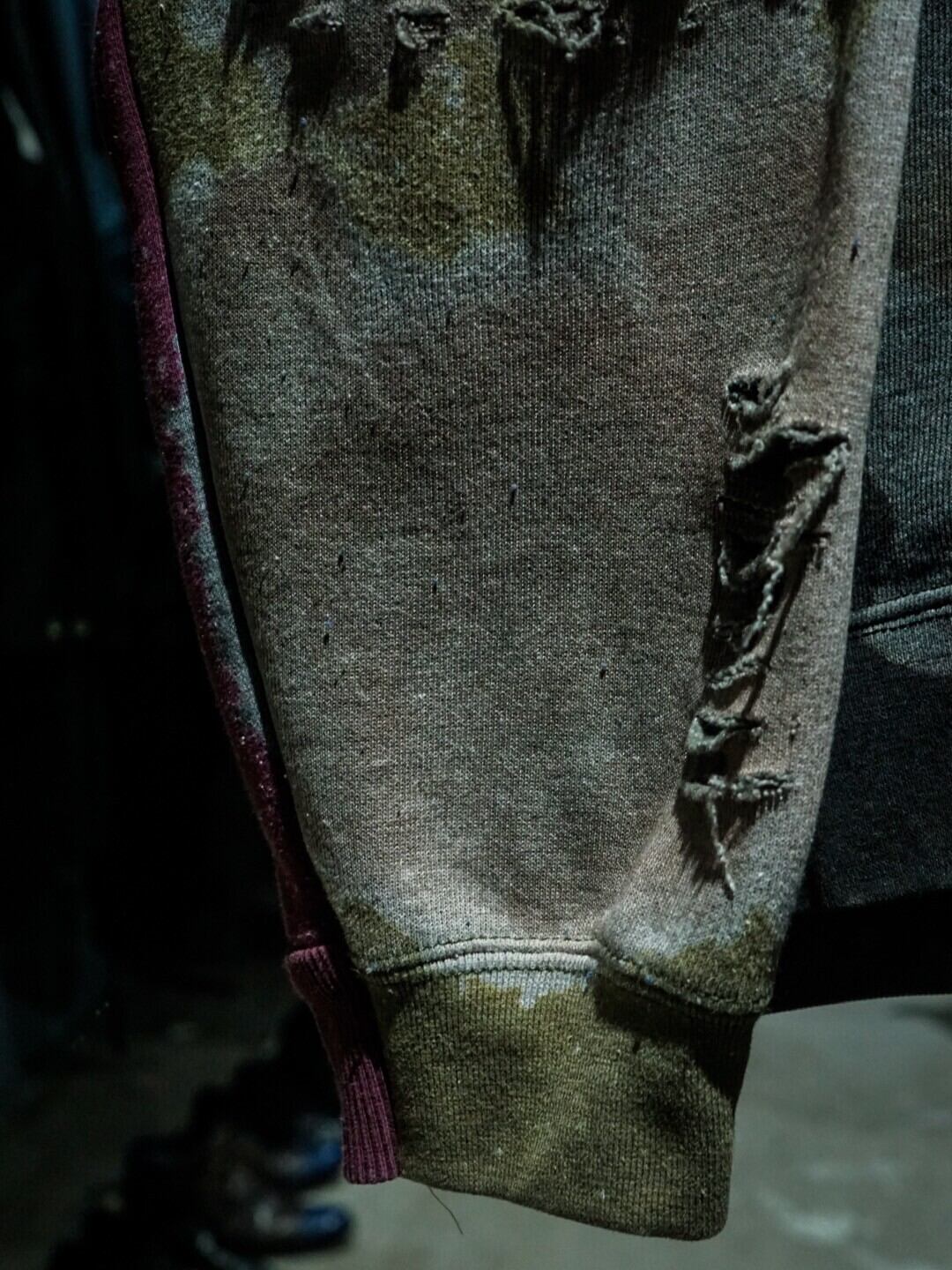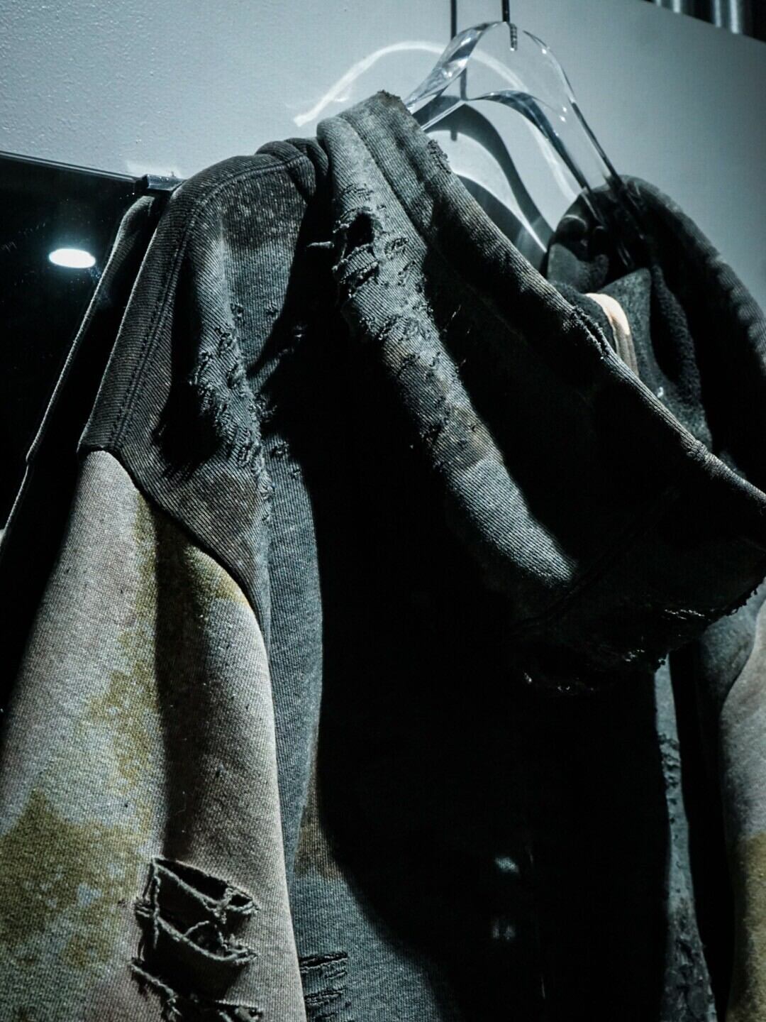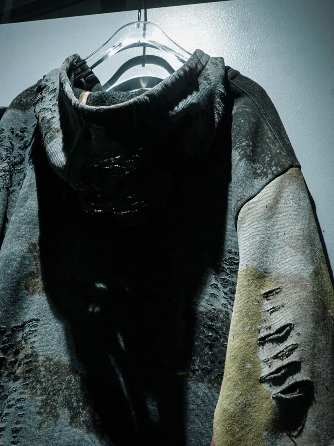 当店が誇る"Original Remake"シリーズより、ブリーチ、ボロ加工を施したフーディをベースに、パッチワークを幾つも施した、贅沢なデザインを重ねた非常に目を惹くスペシャルな1着をご紹介致します。