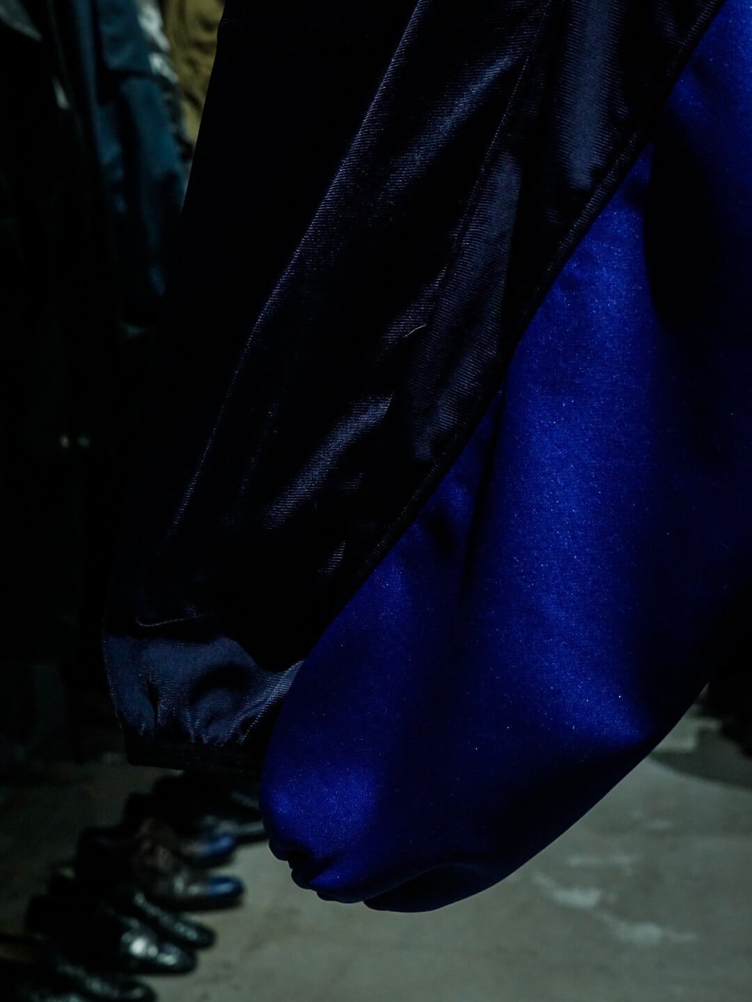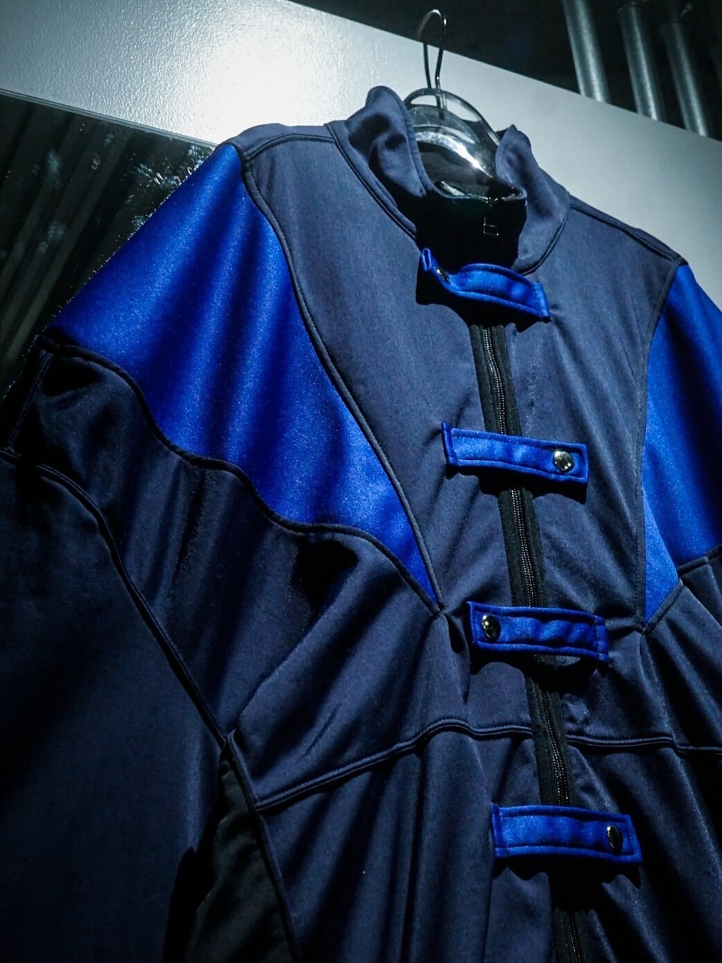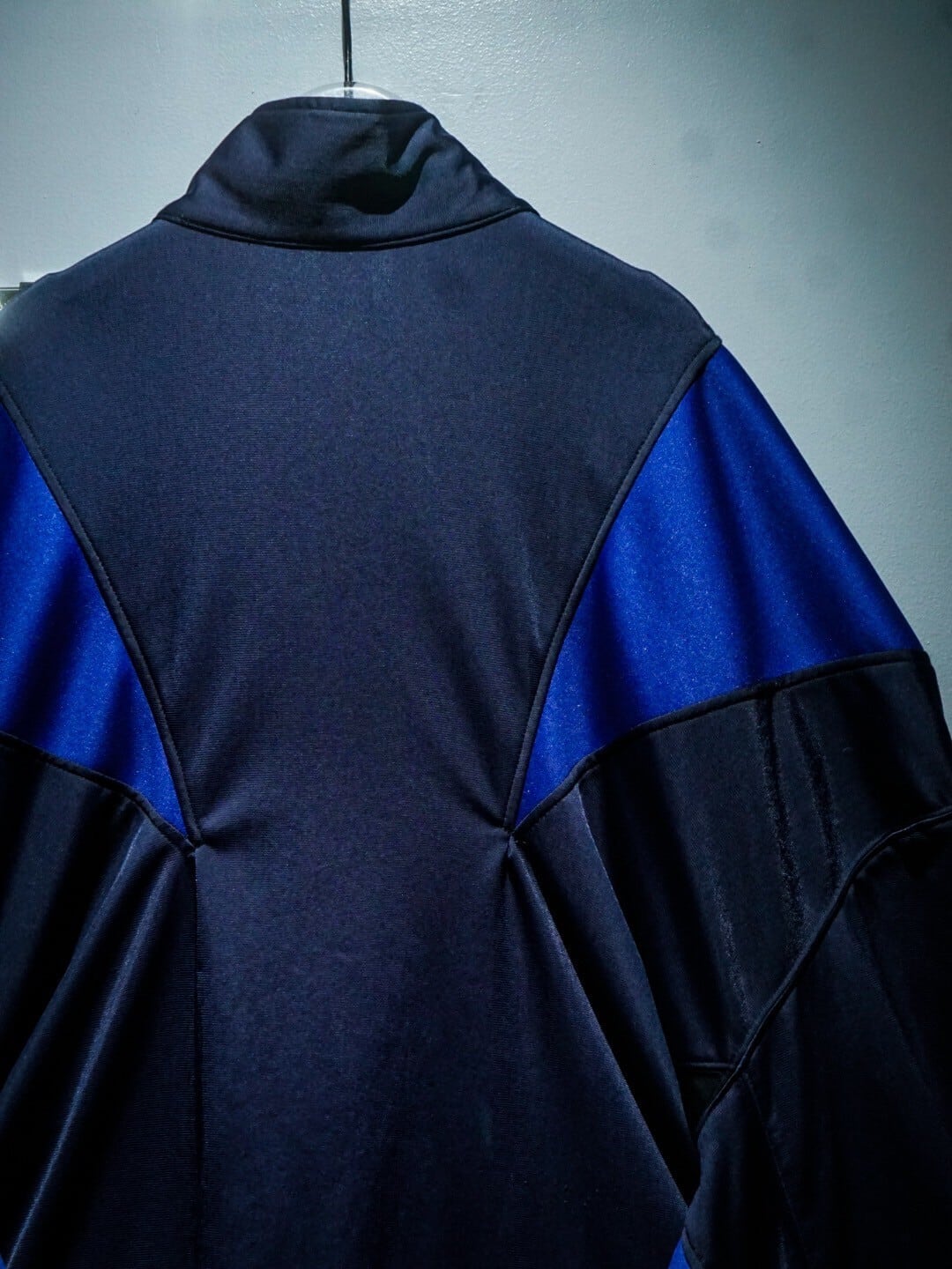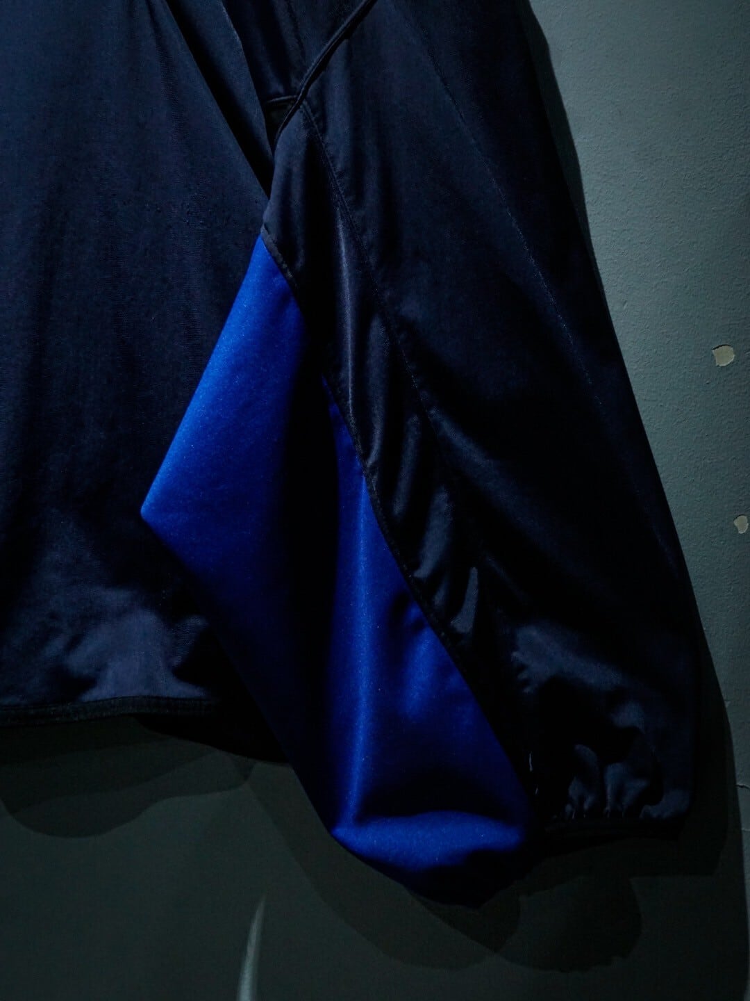 ネイビーのボディをベースに、鮮やかなブルーのトラックジャケットを巧みにドッキング、ワイドにリサイズした逸品。フロントには印象的なベルトのギミックを載せた、リメイクならではの表情が堪りませんね。