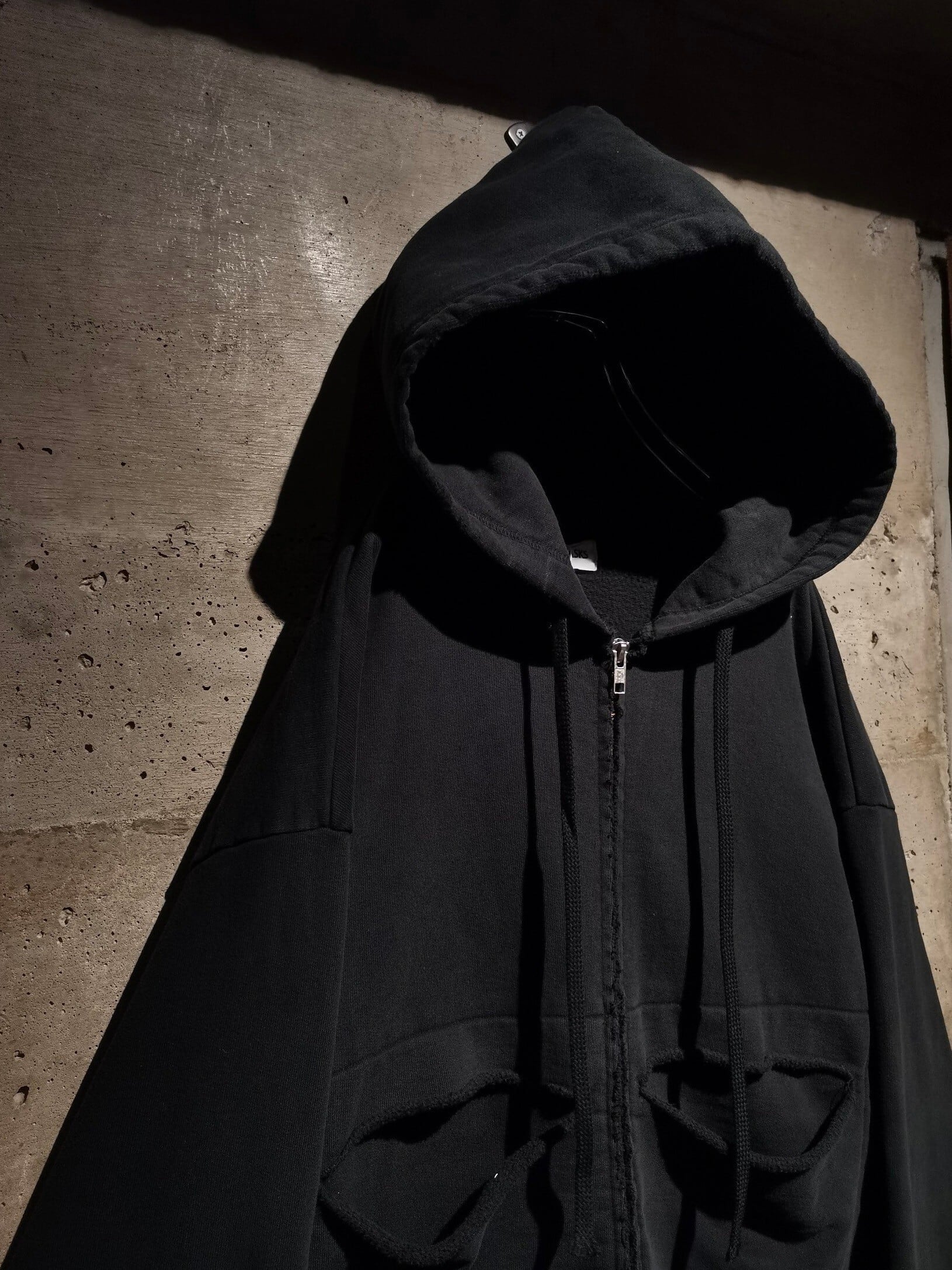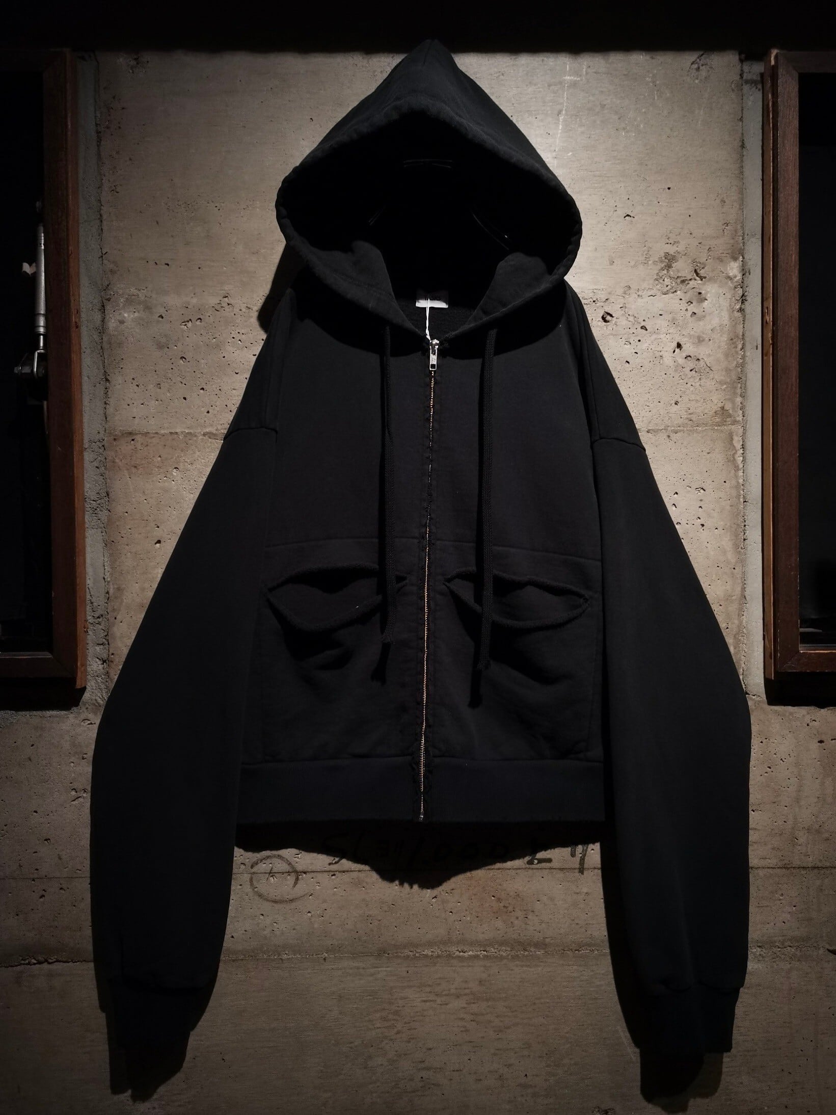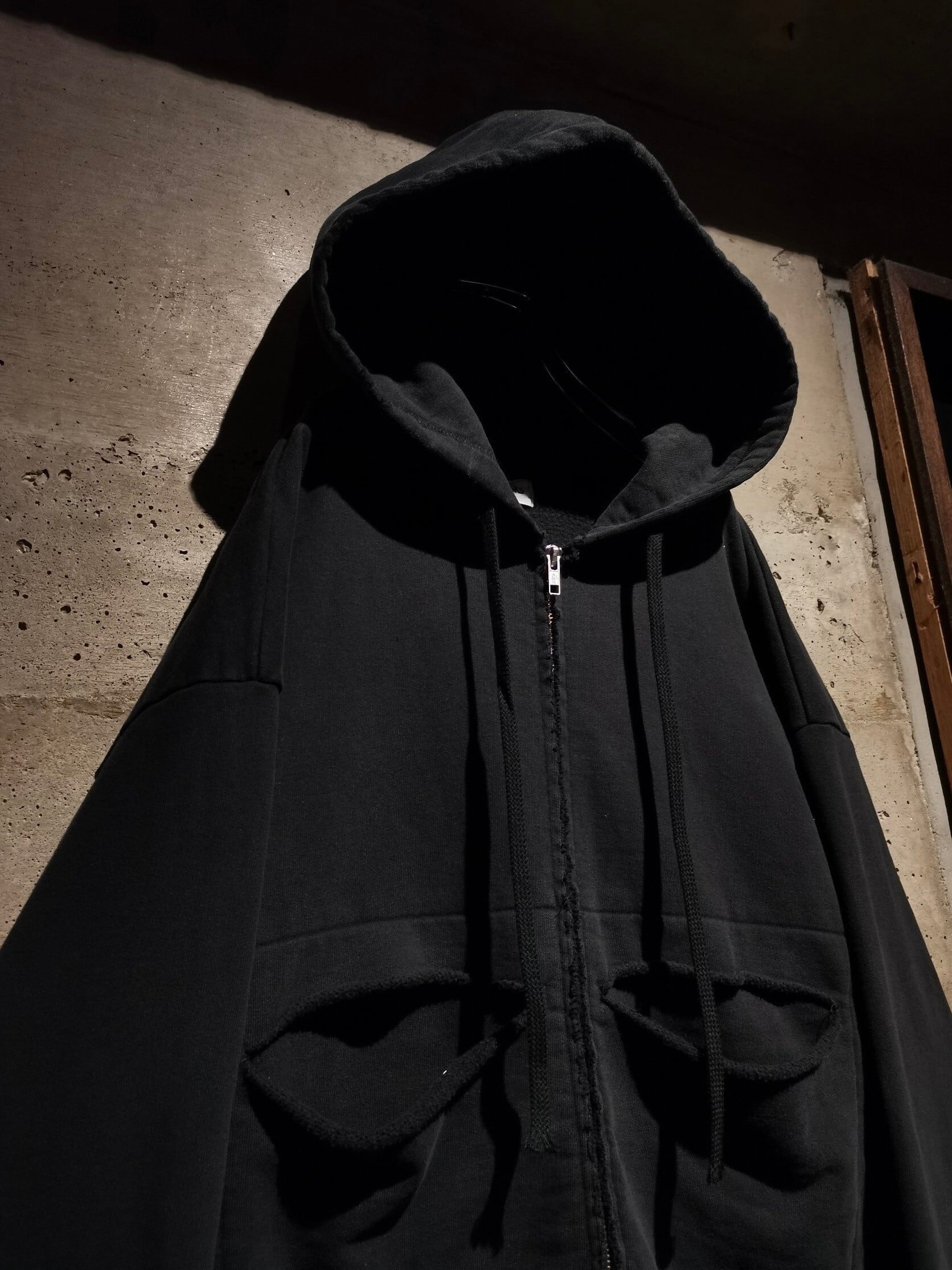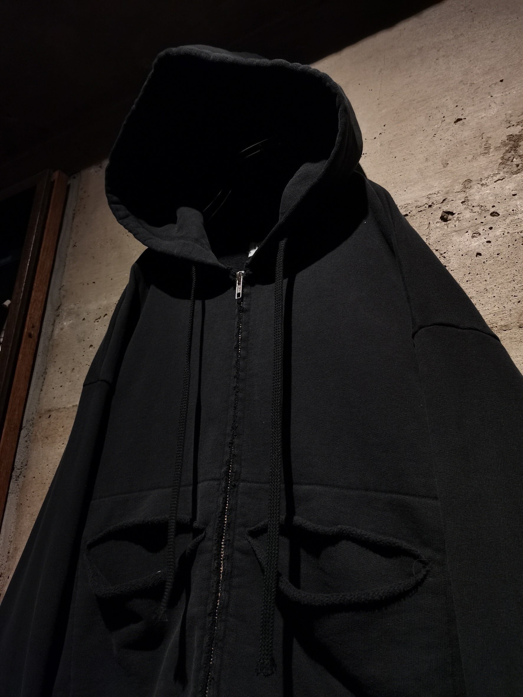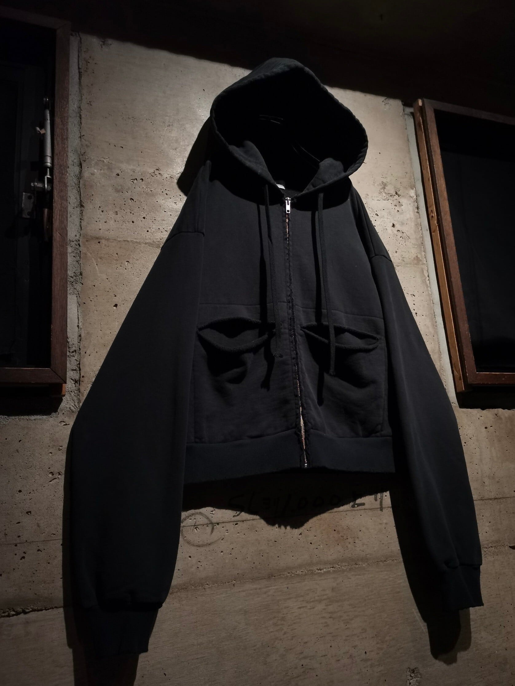バイオウォッシュと適度なディストレスト加工を施した短丈、身幅広のジップアップパーカー。