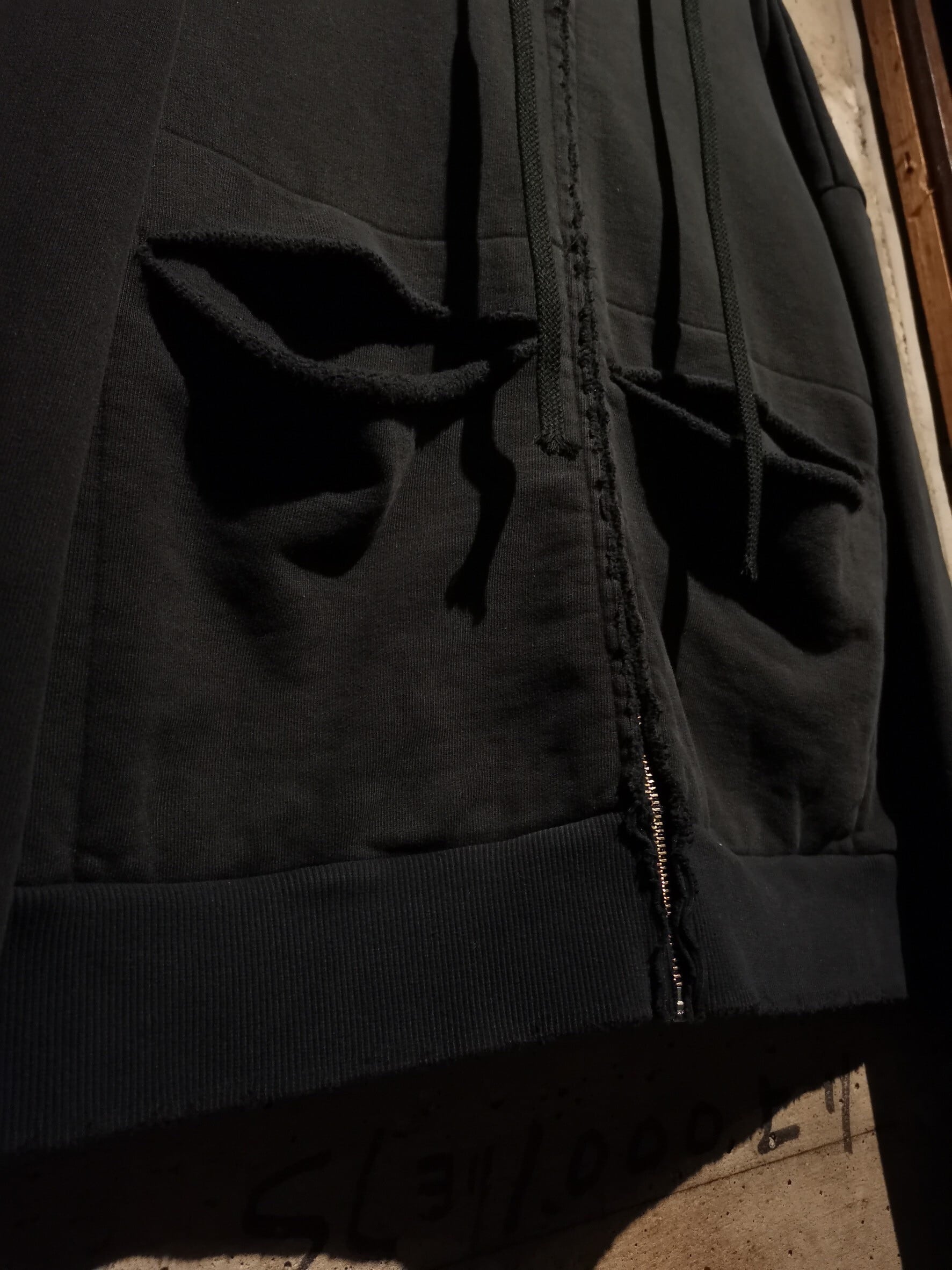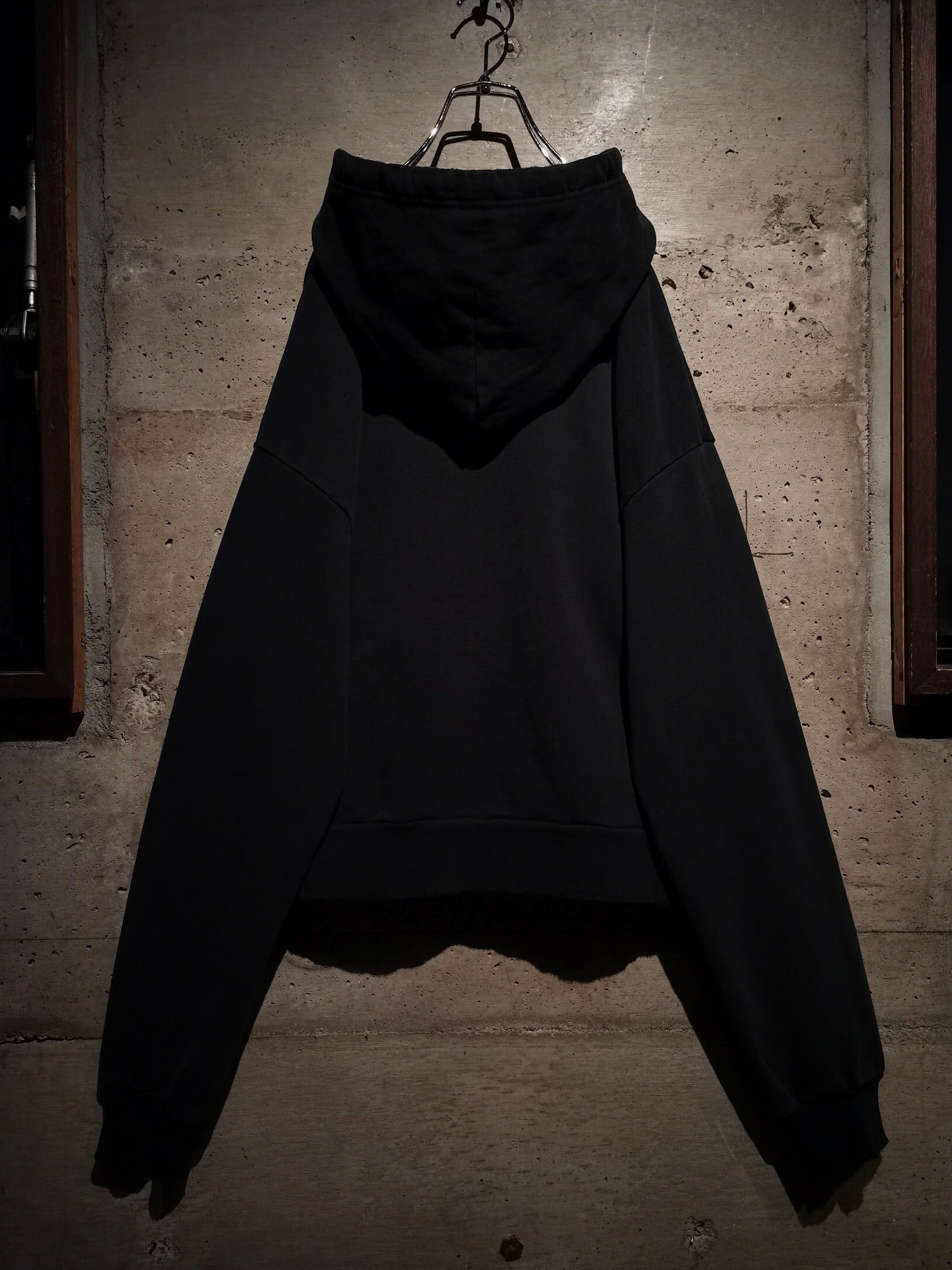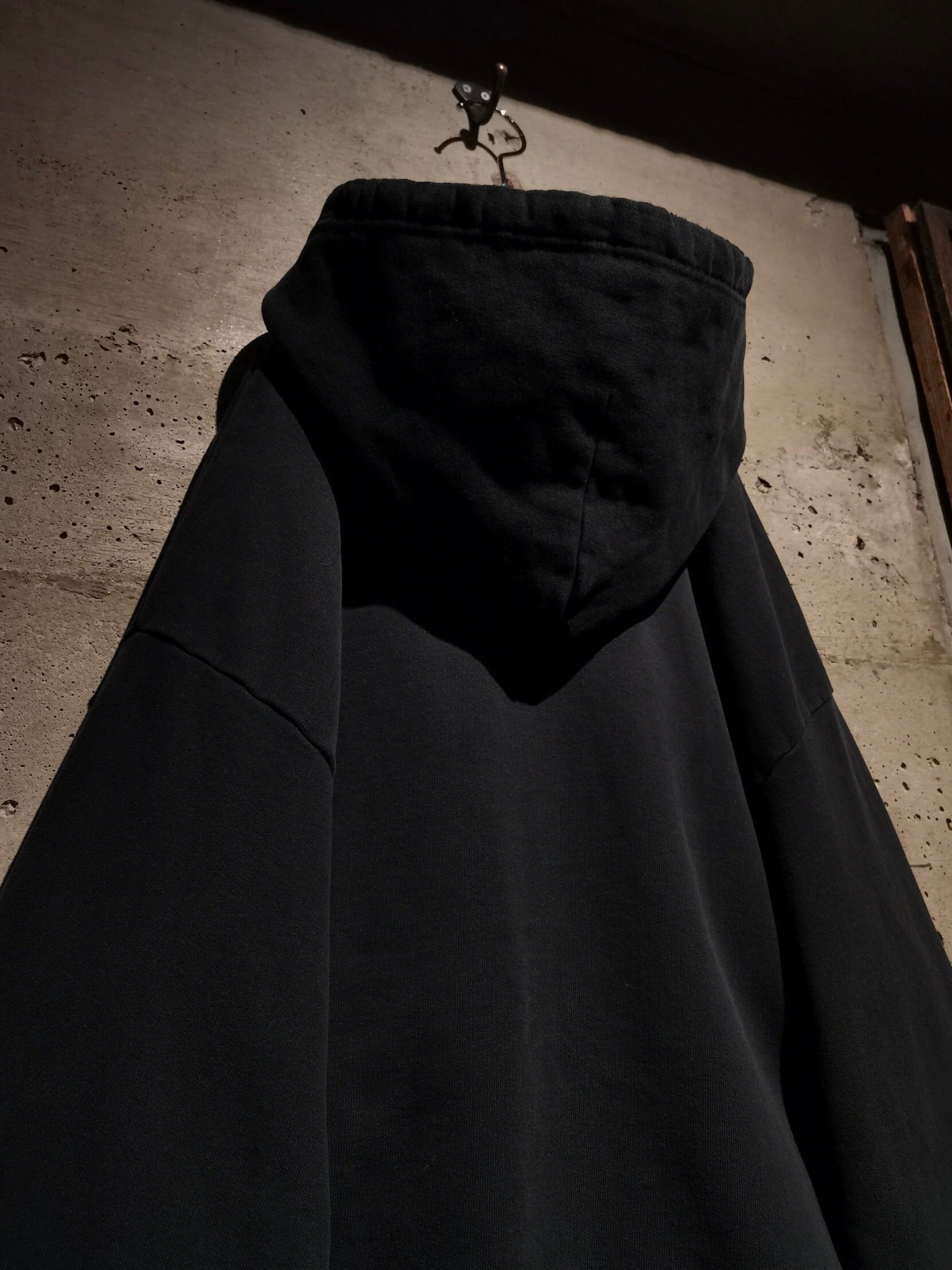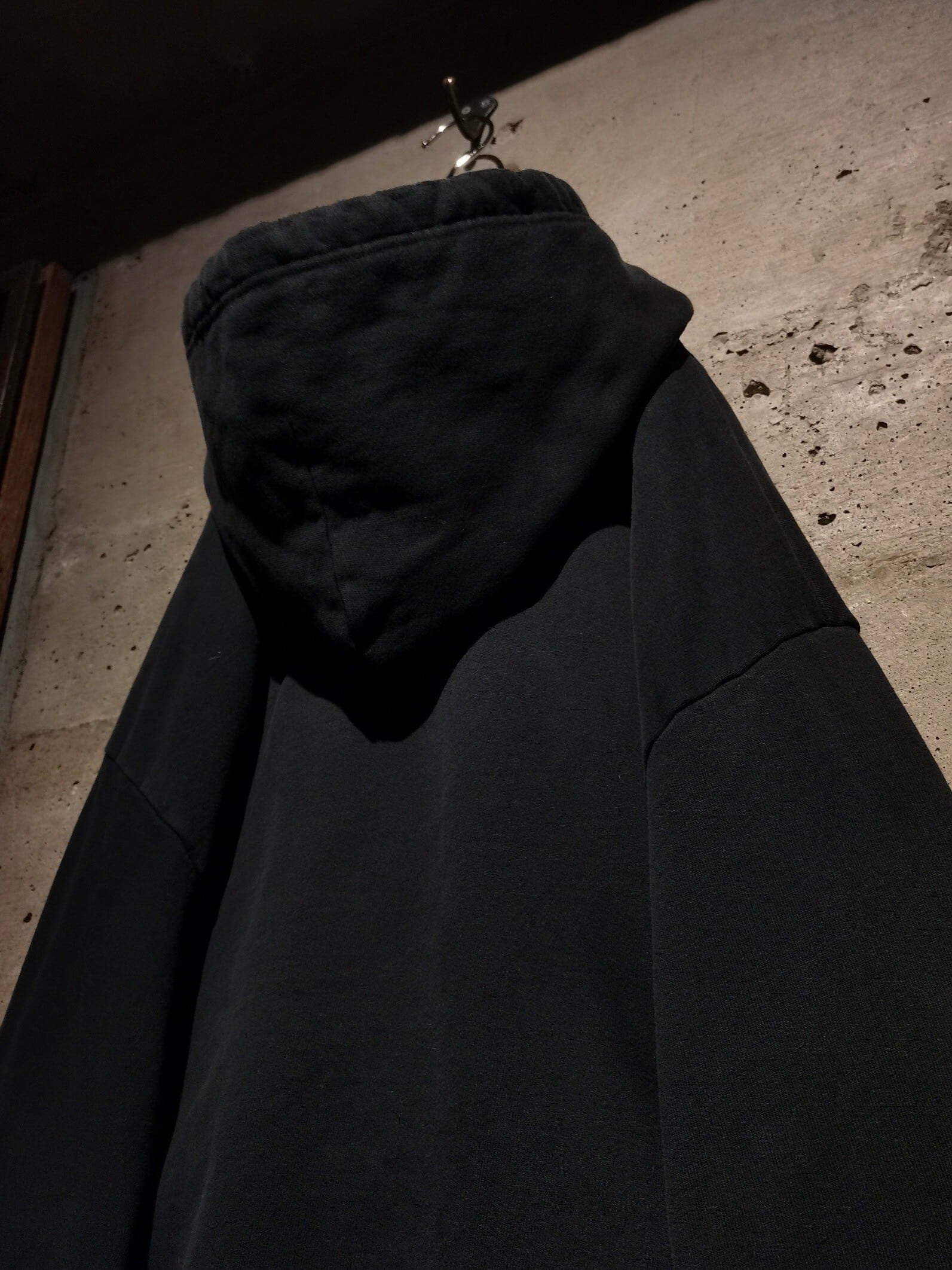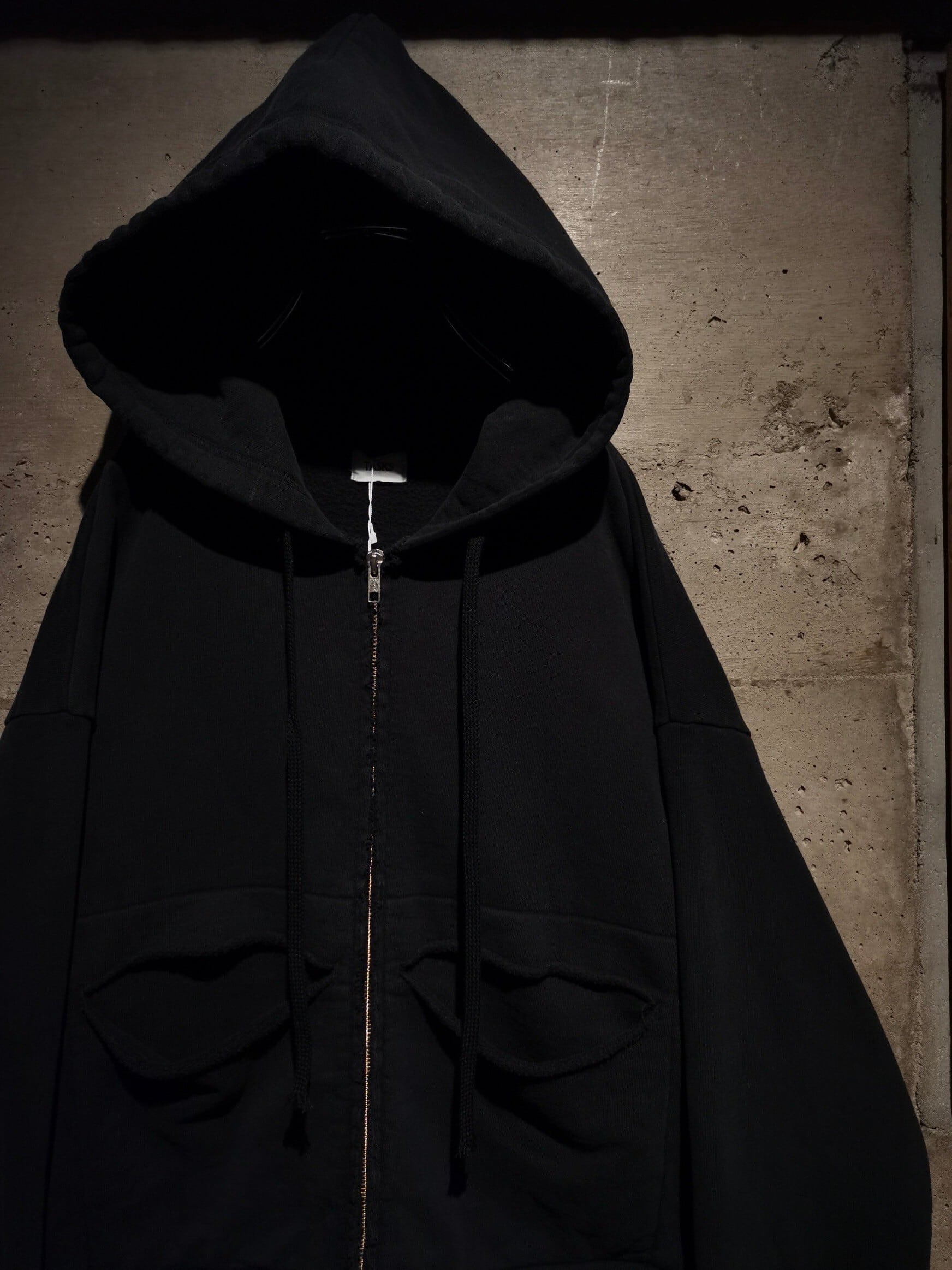 バイオウォッシュと適度なディストレスト加工を施した短丈、身幅広のジップアップパーカー。