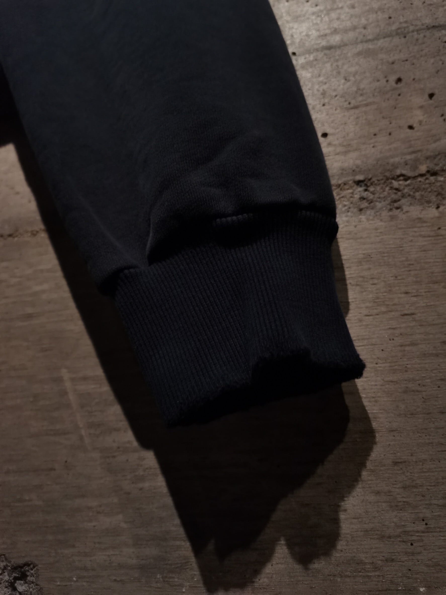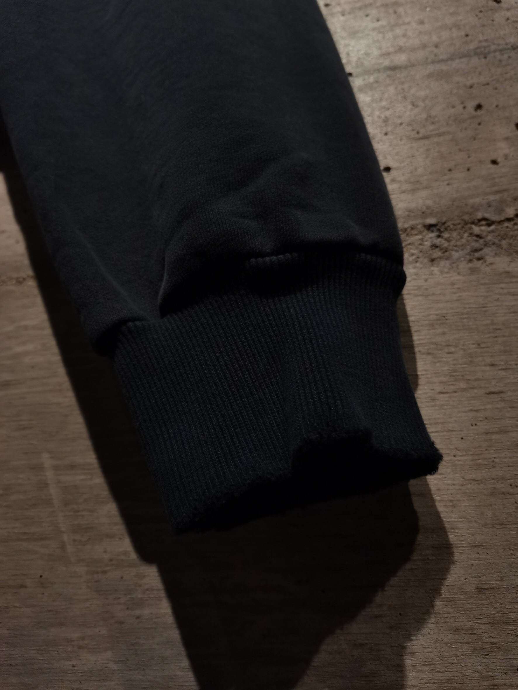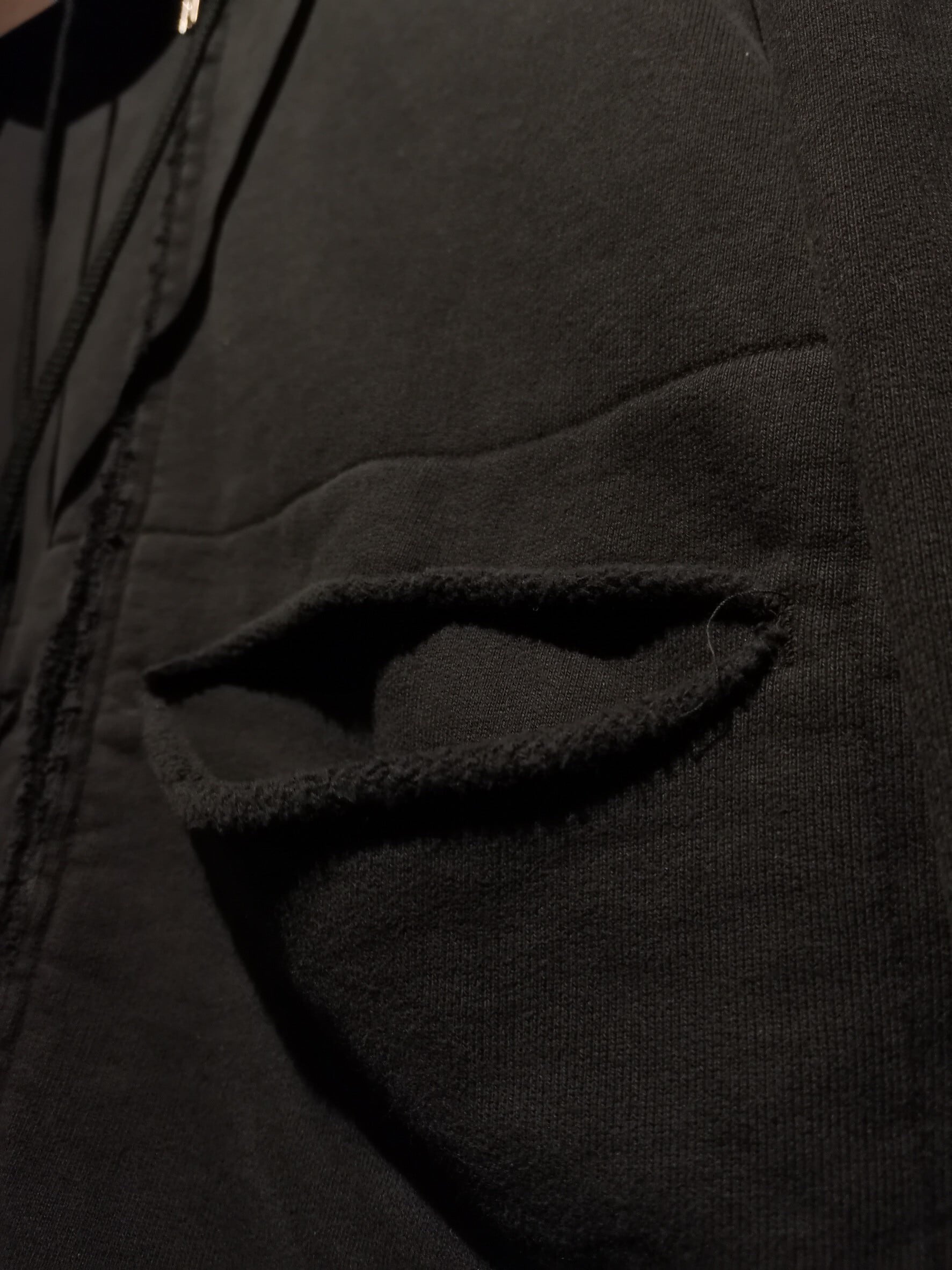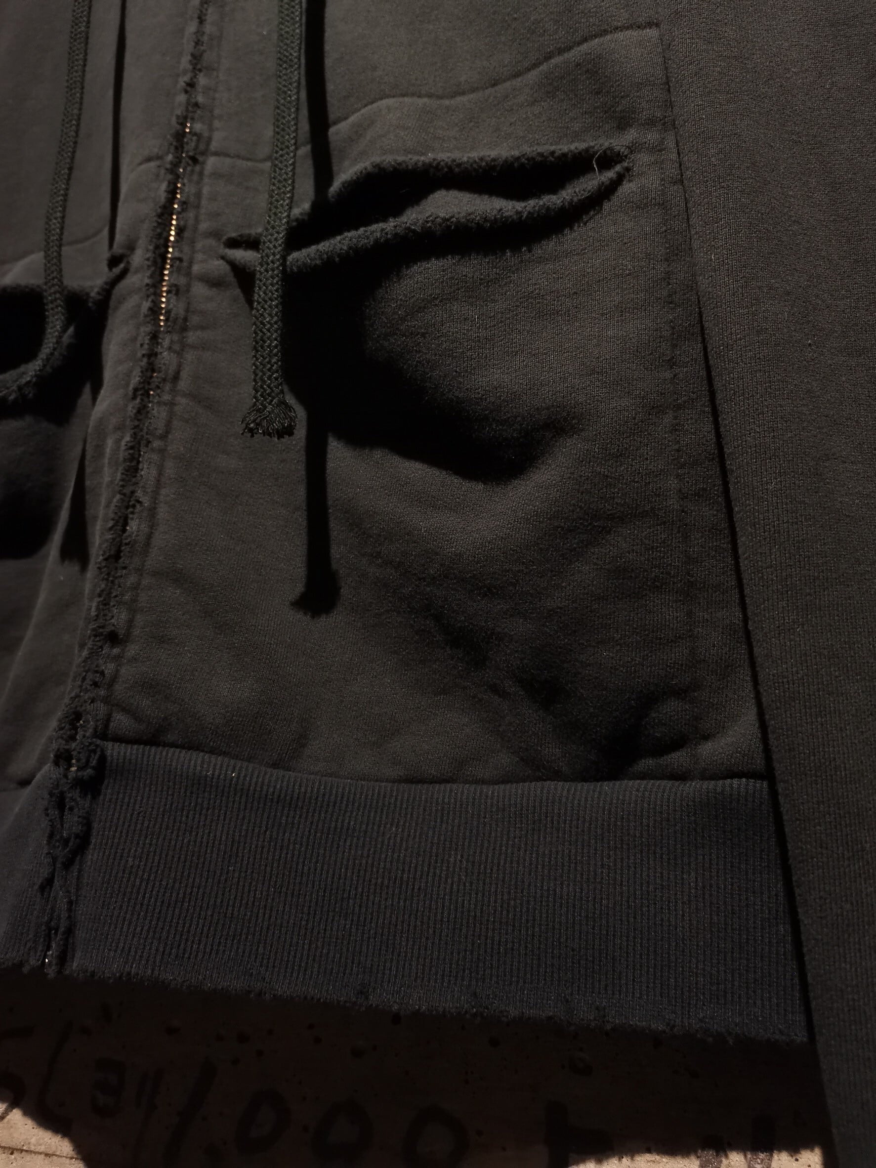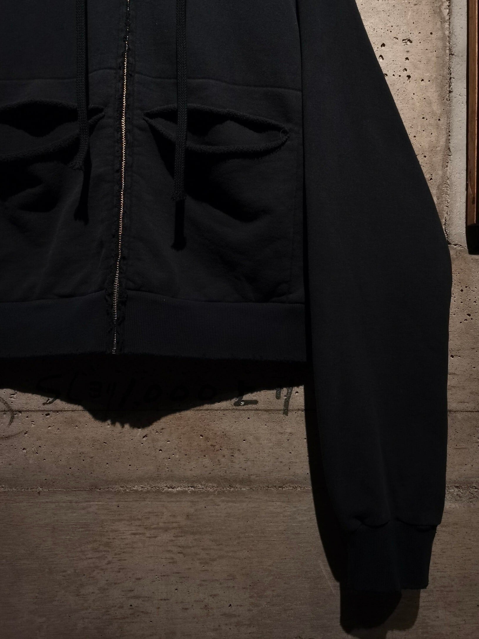 バイオウォッシュと適度なディストレスト加工を施した短丈、身幅広のジップアップパーカー。