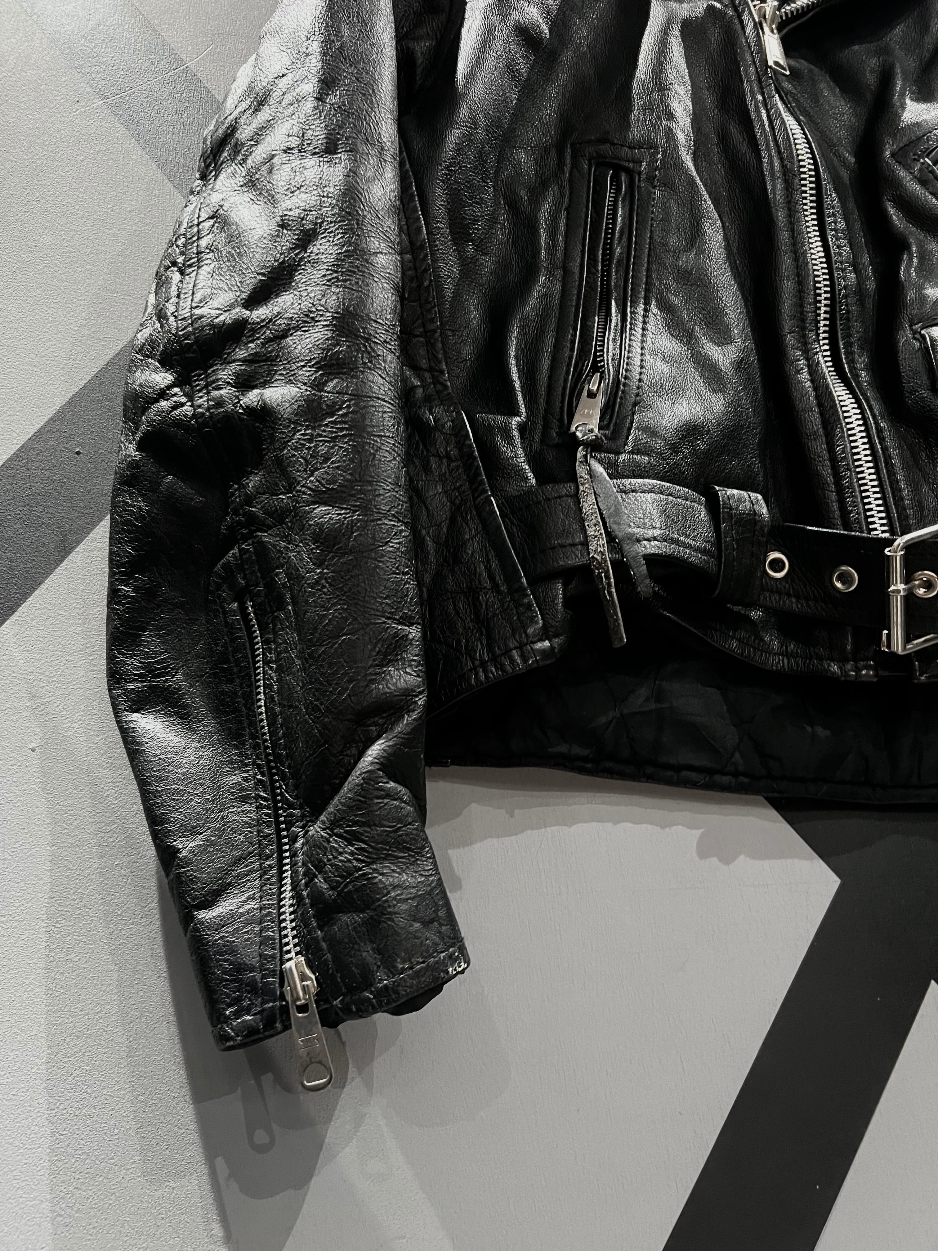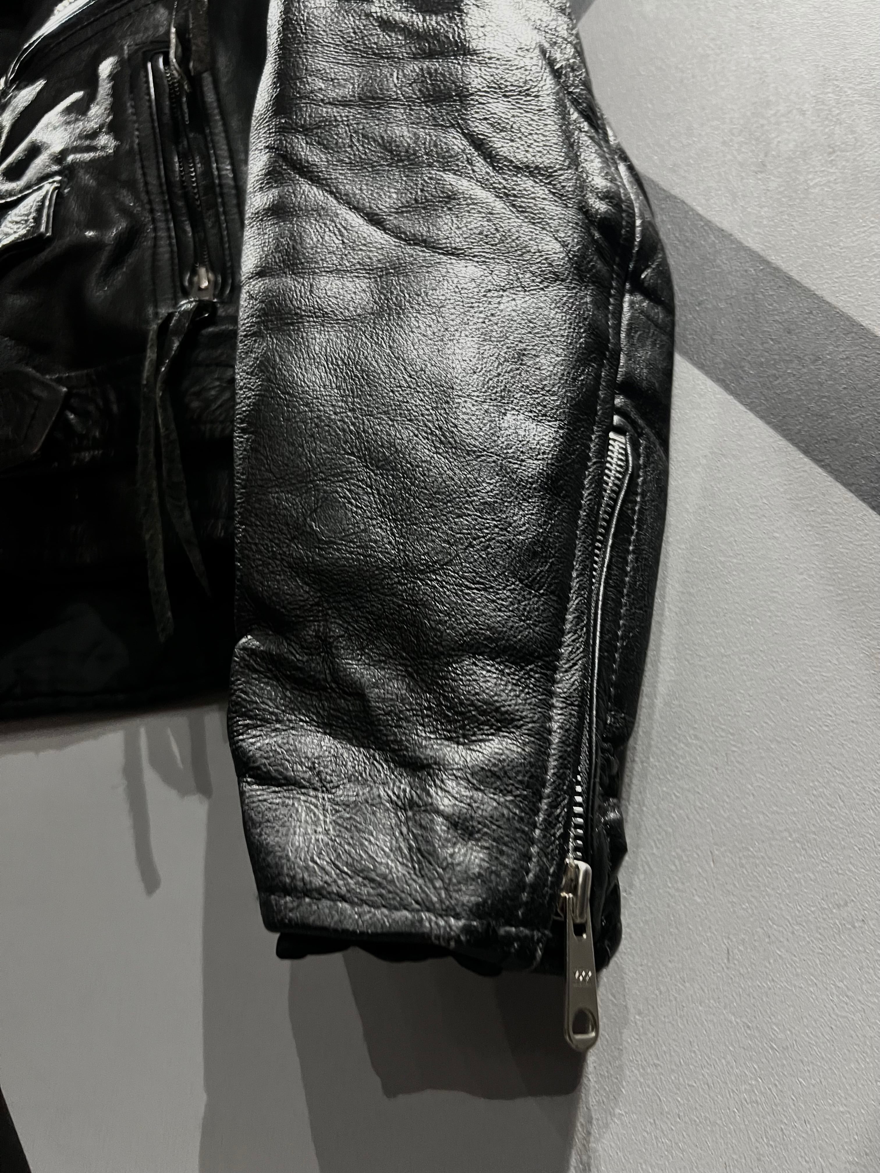 ガシッとした重厚感に加え、ツヤのある上質なレザーを使用。腰のベルト、コインポケット、ジップ、ボディサイドのレースアップなどライダースの基本的なディテールをしっかりと押さえた1着。ベーシックなアイテムが故に、お洋服好きの皆様には是非押さえておいて頂きたい逸品です。