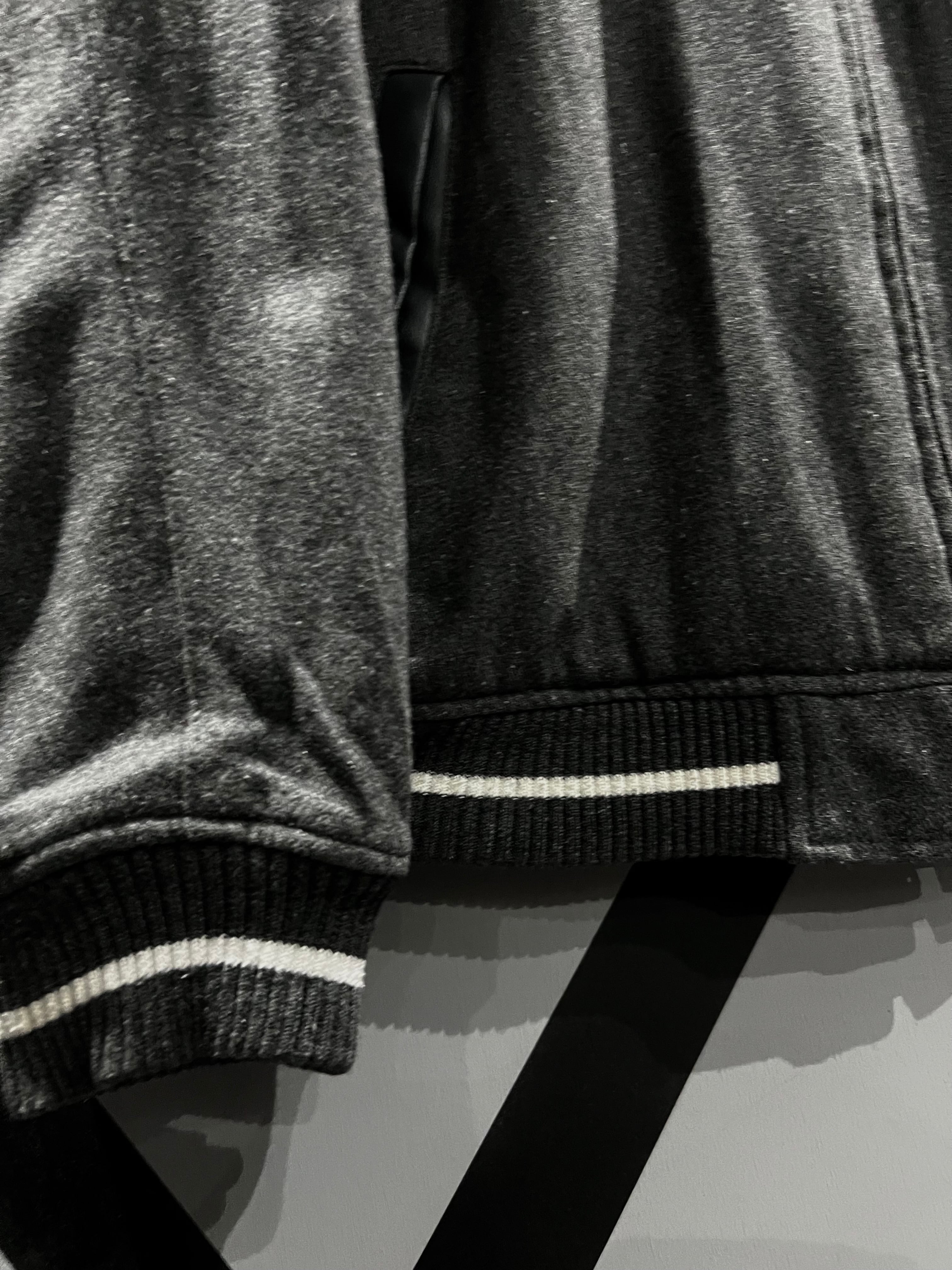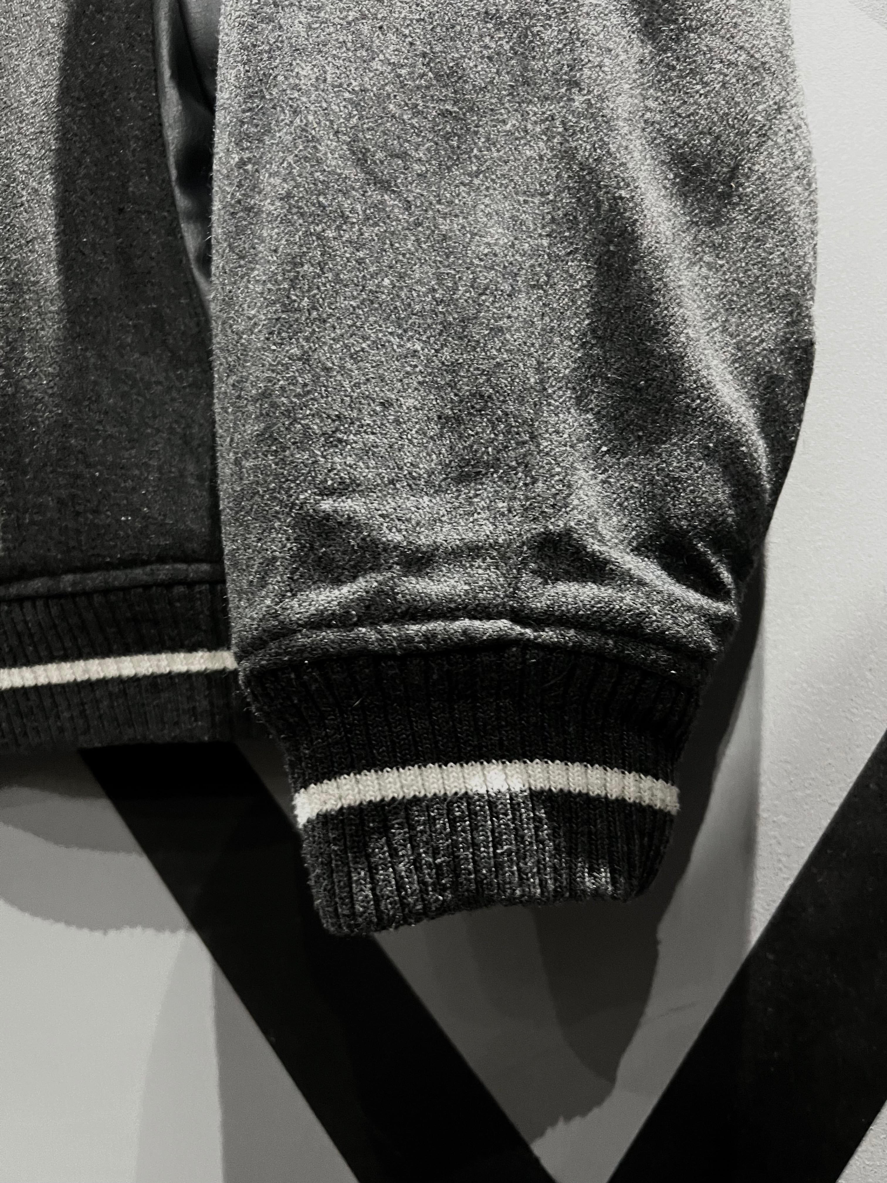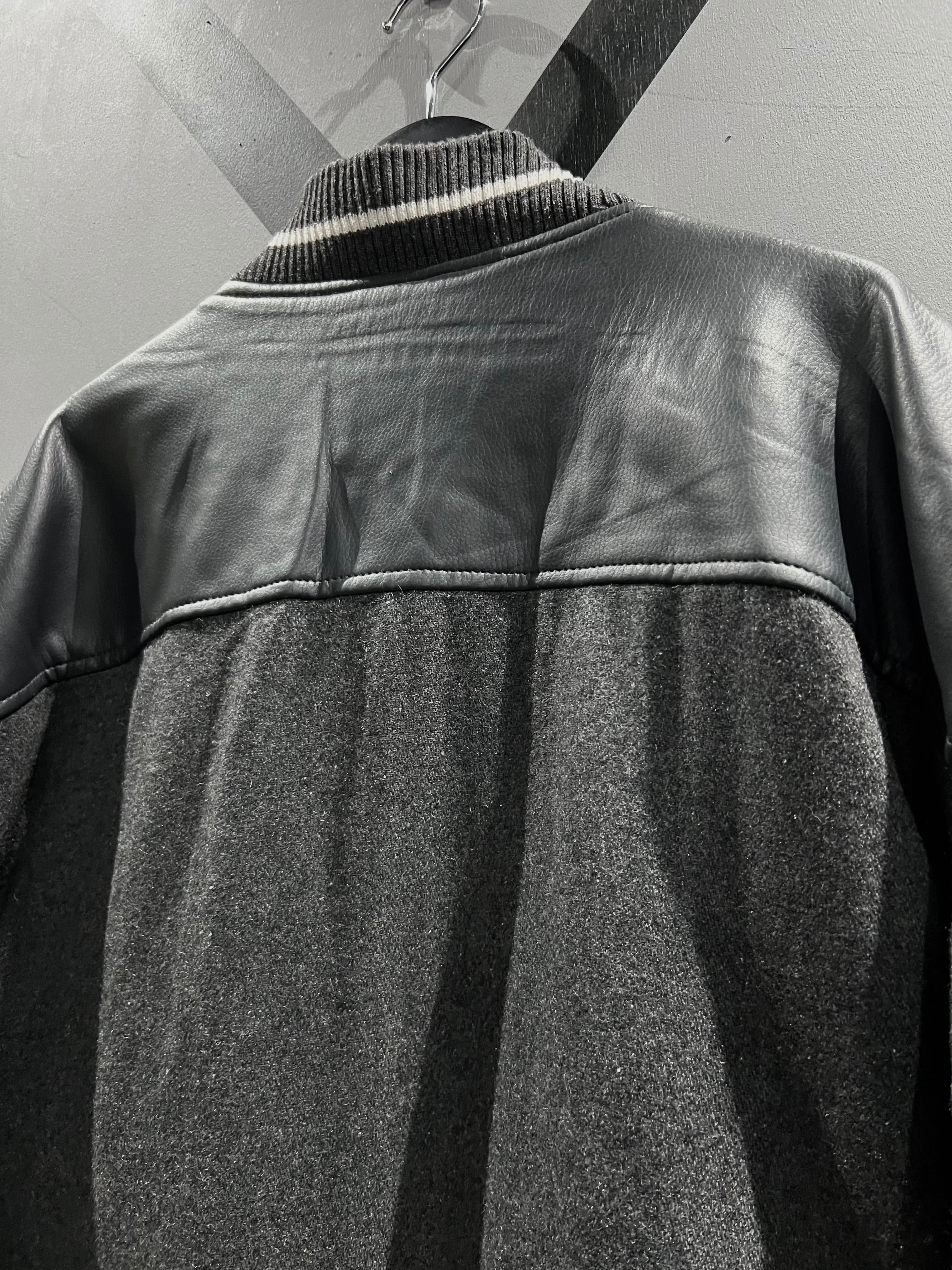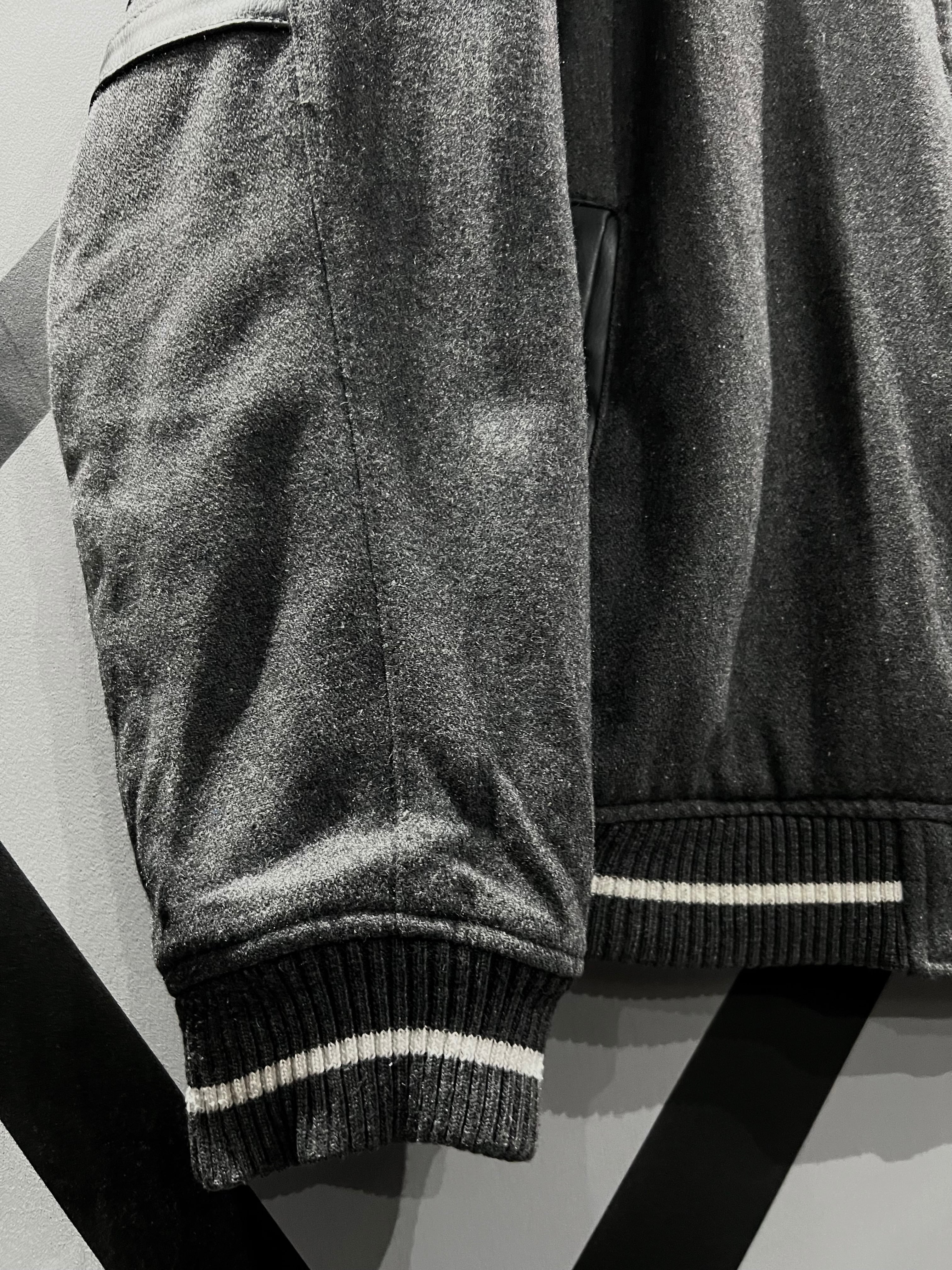 きめ細やかで柔らかなグレーのウール生地をベースとしたボディに、肩周りやアームにフェイクレザーを切り替えたスタジャン。