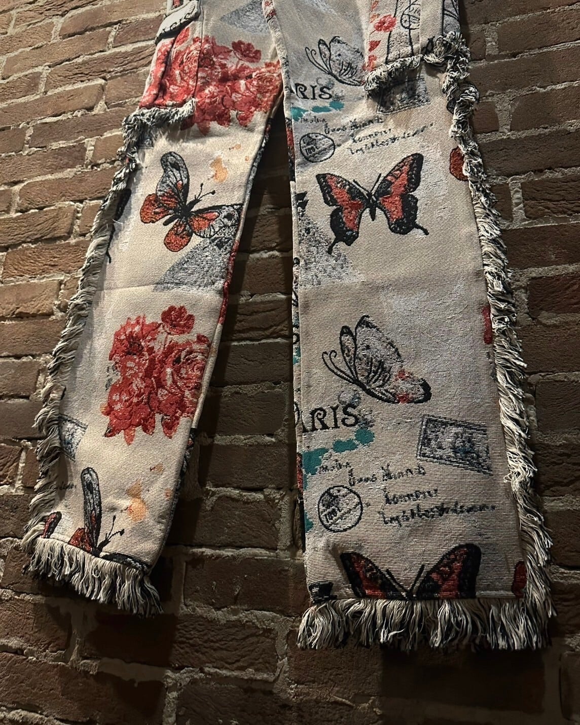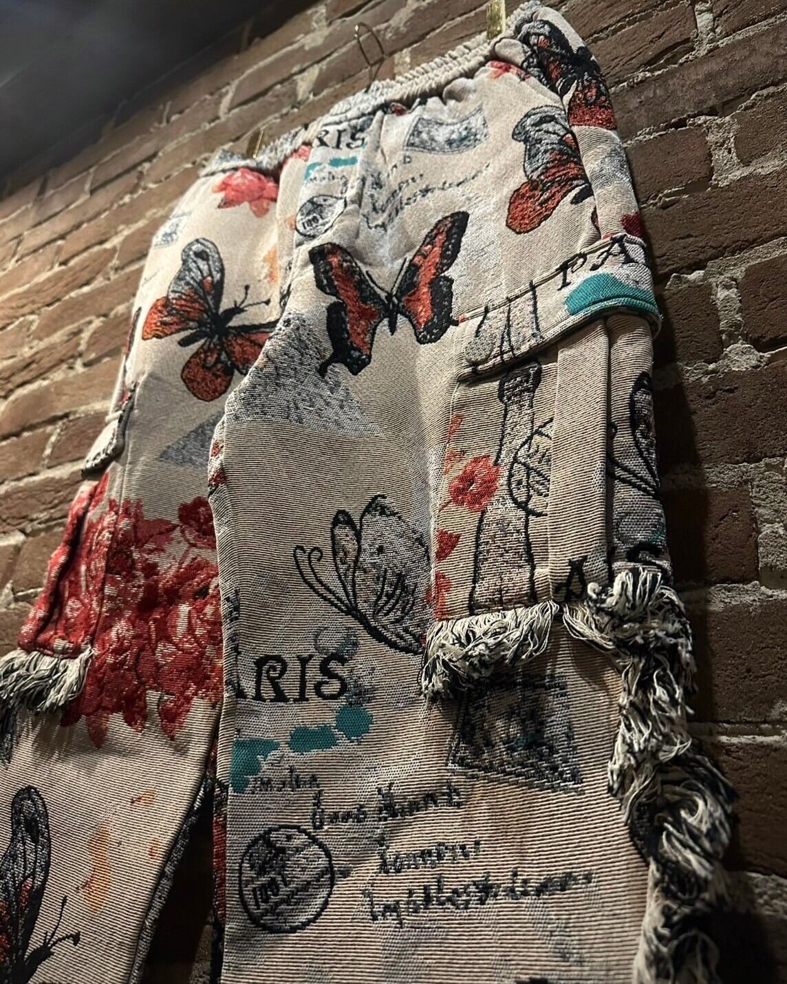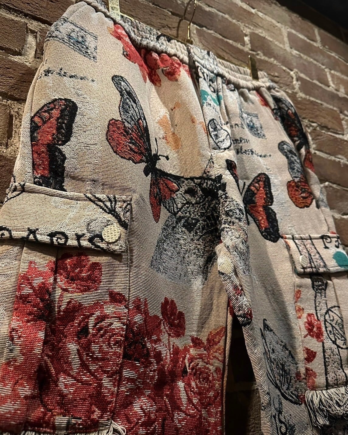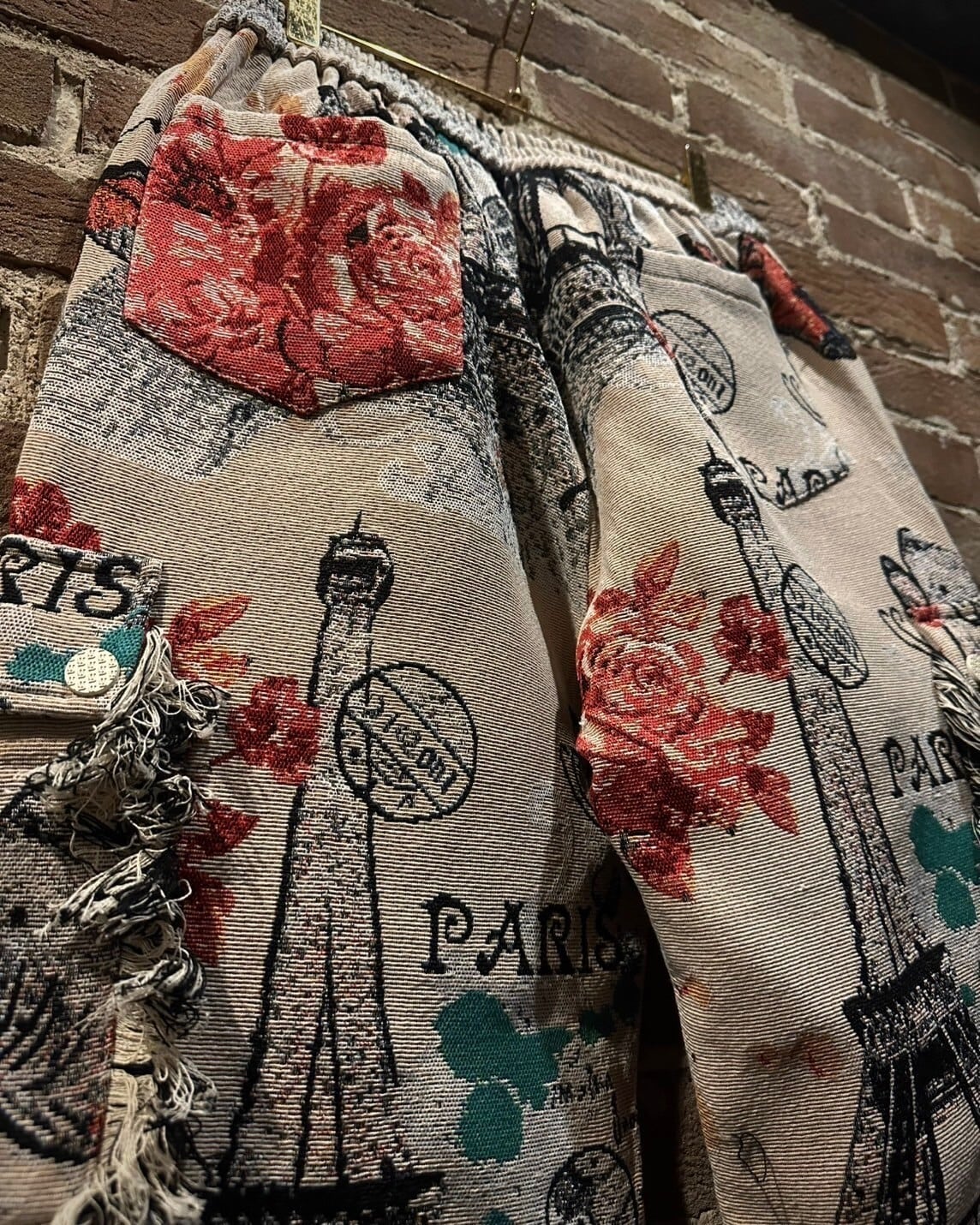 コシのある上質なゴブラン織で、花の都パリにあるエッフェル塔や花、蝶々など表現したカーゴパンツ。