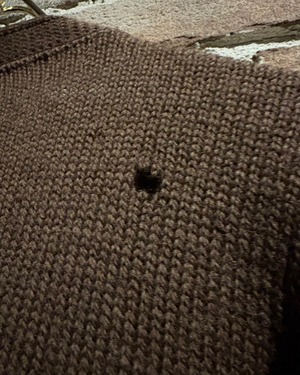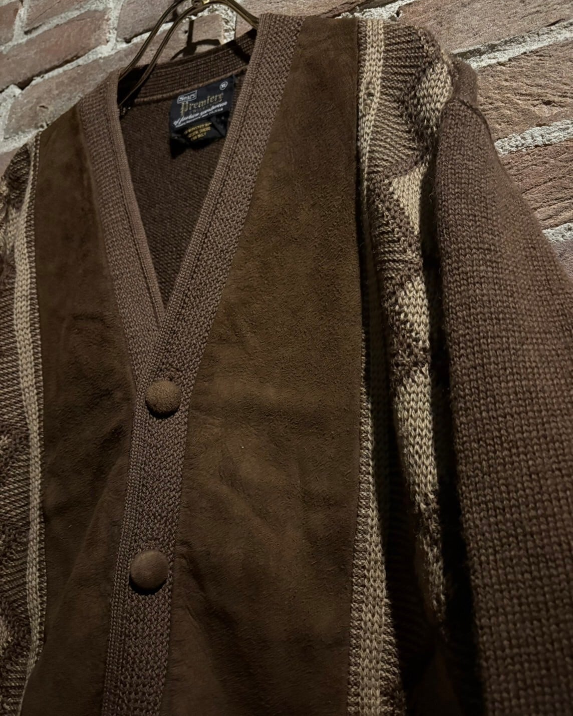 柔らかなブラウンのニットをベースに、前身頃にしっとりと柔らかく肌触りの良いラムスエードレザーを切り替えた、70'sヴィンテージのニットカーディガン。