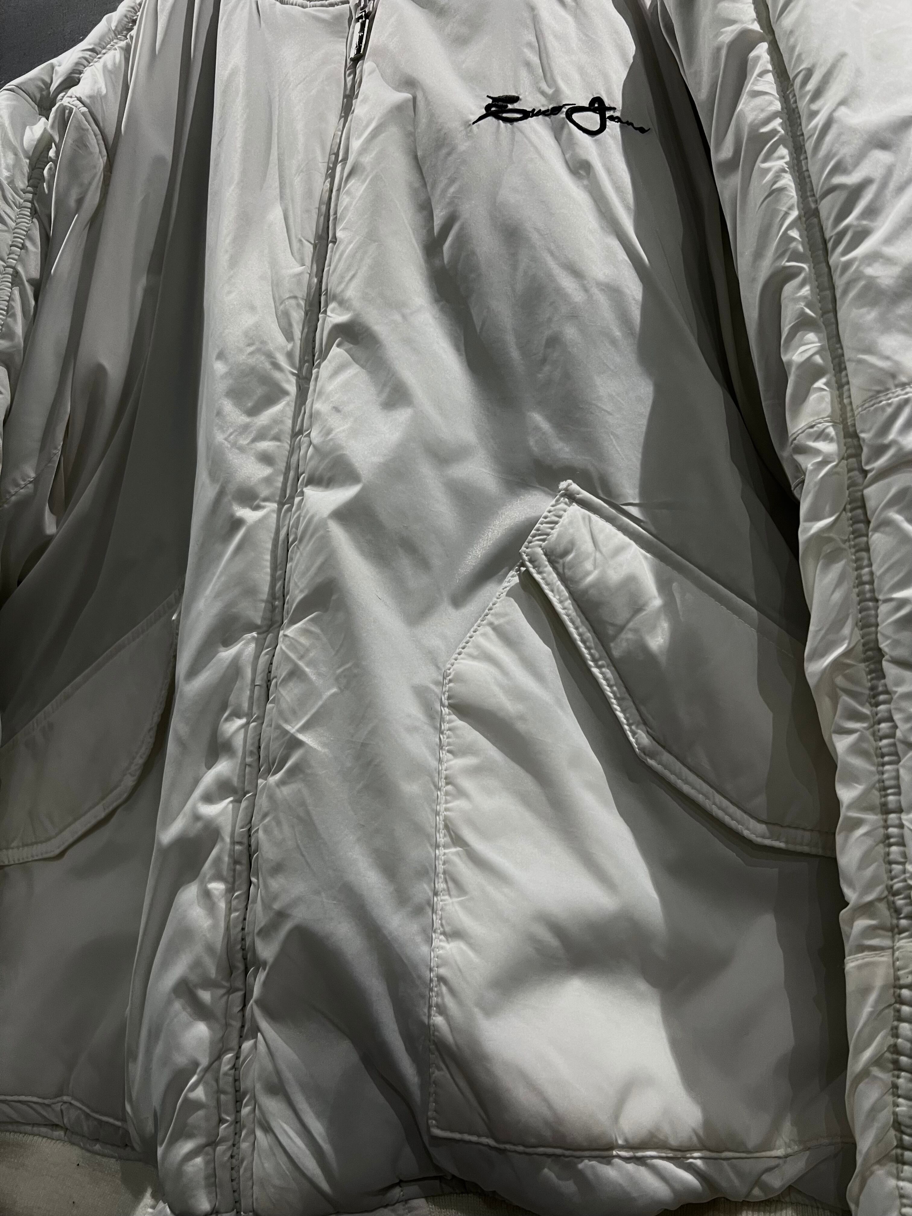 オールホワイトに、左胸にはブランドネームを刺繍で、ガバッと裏返すと表面には全体にステッチを走らせたキルティング仕様のブラックカラーへ早変わり。その日の気分によって着る面を変えられるリバーシブルのボンバージャケット。