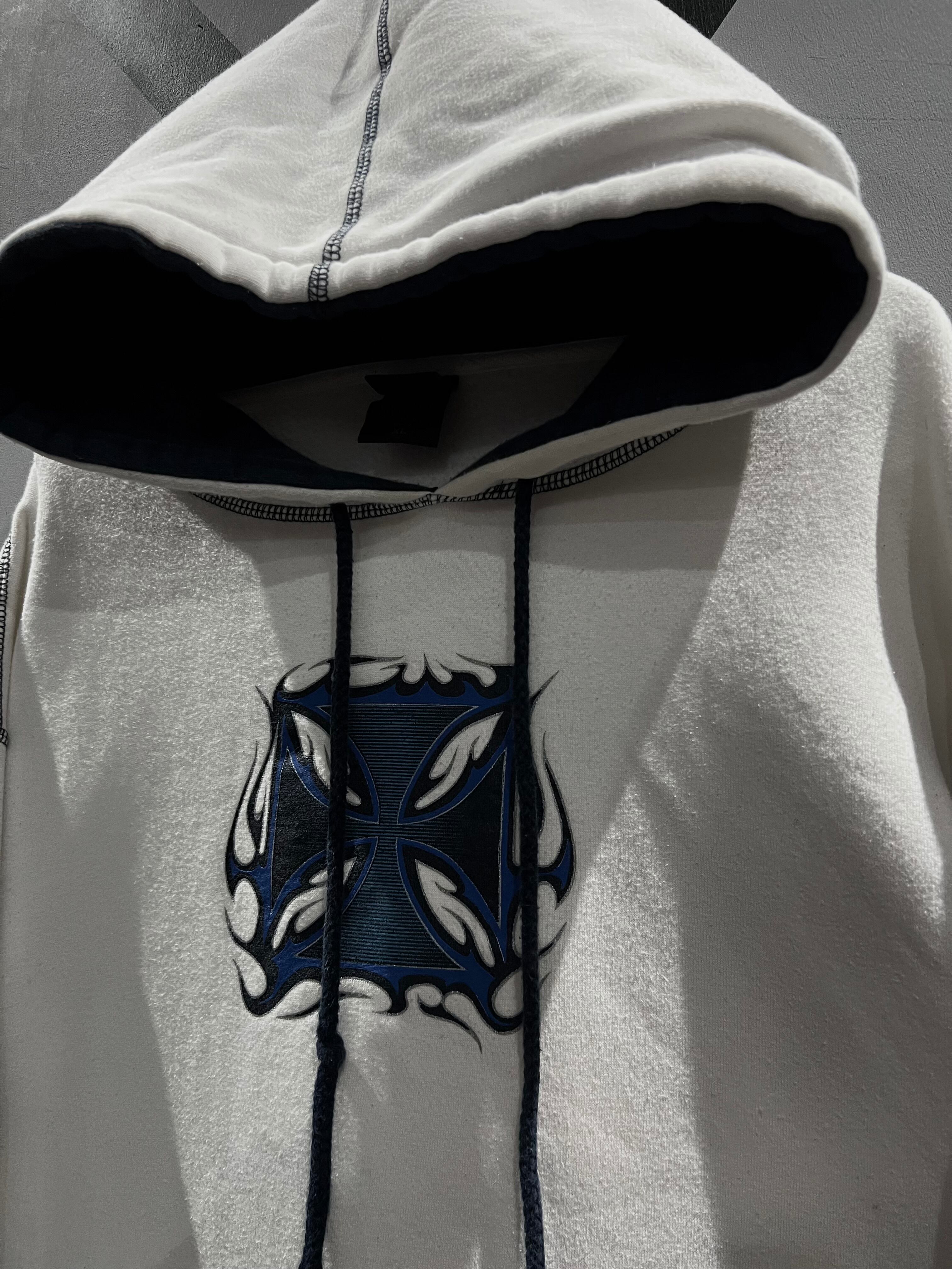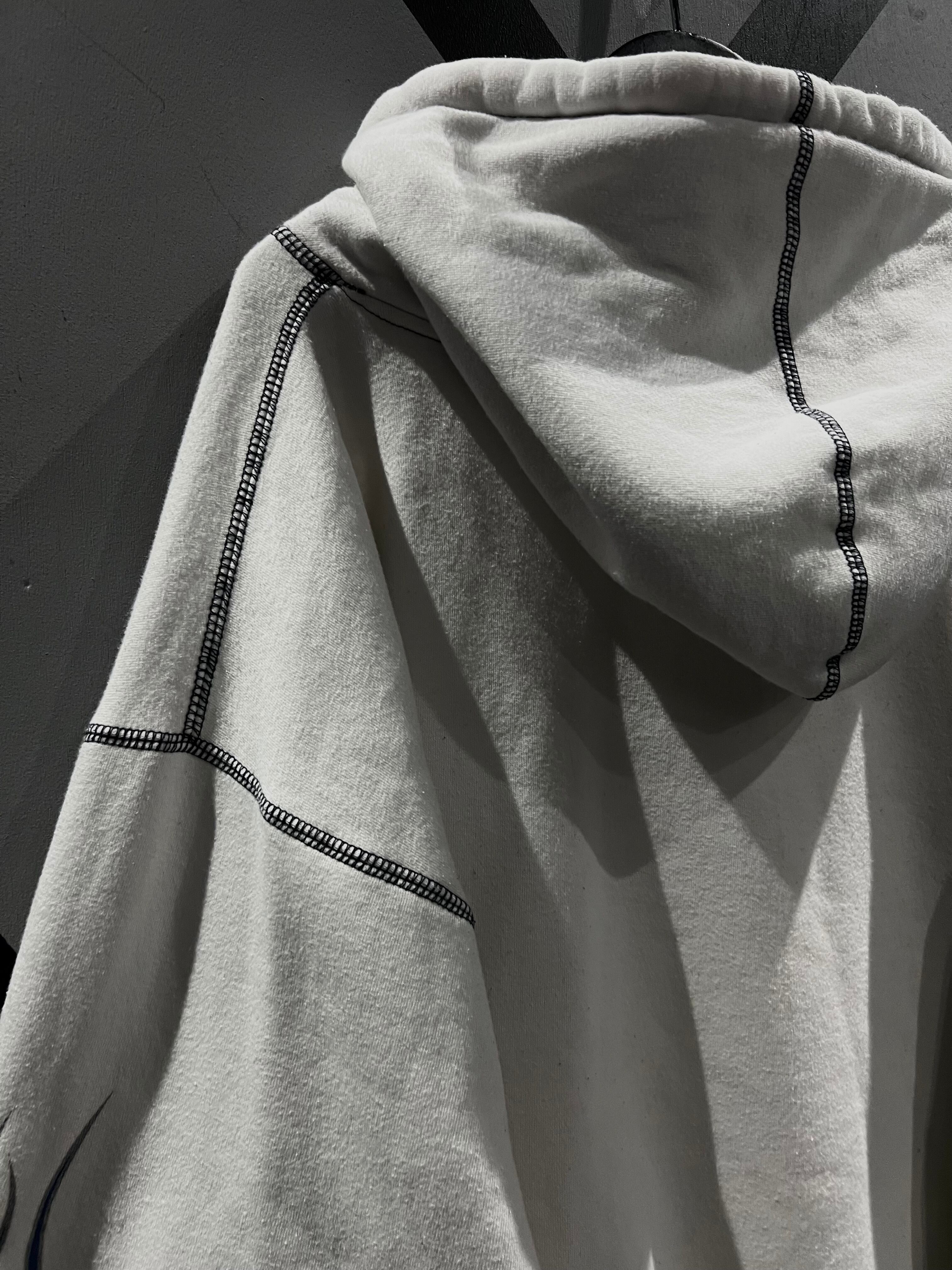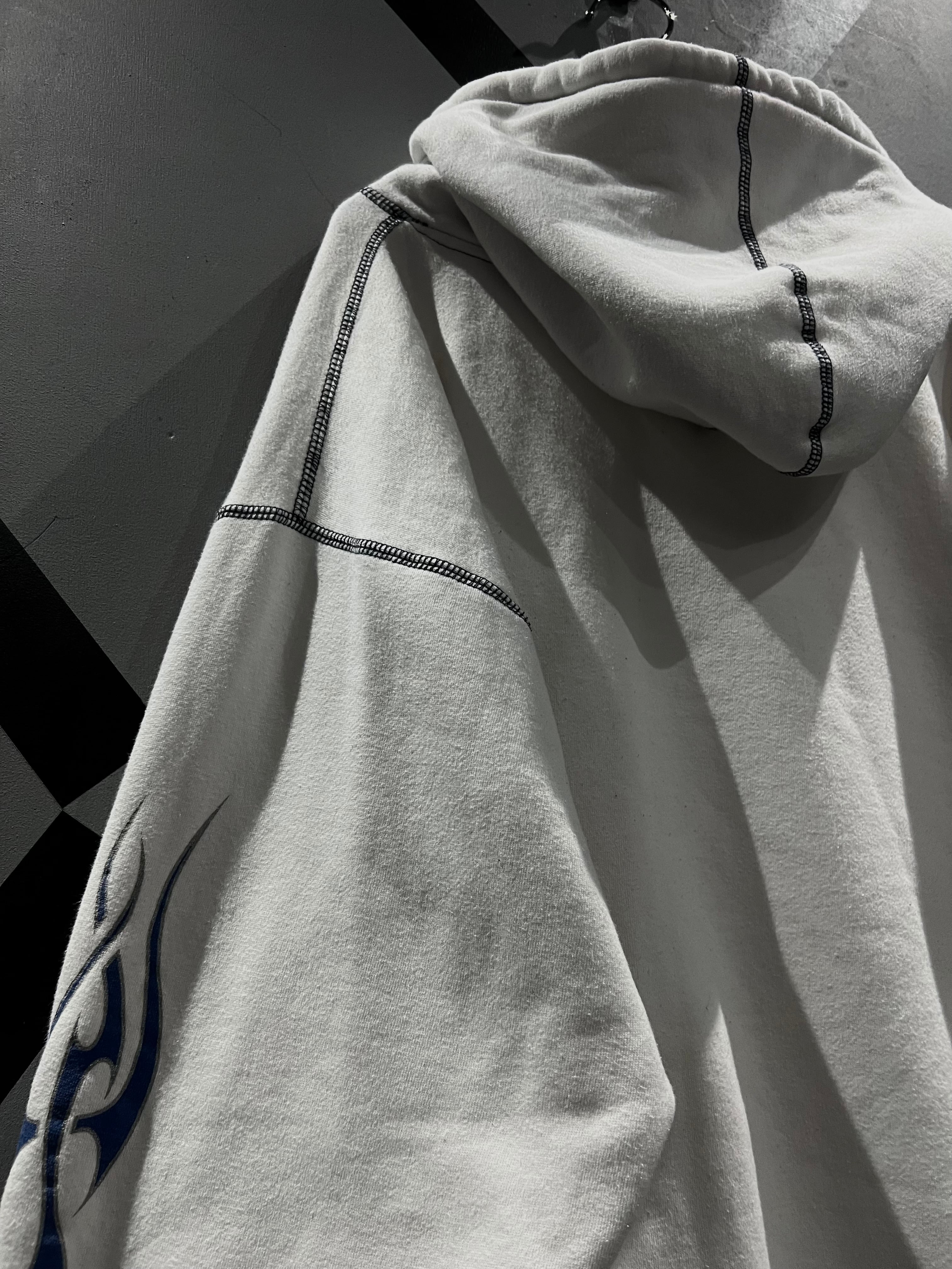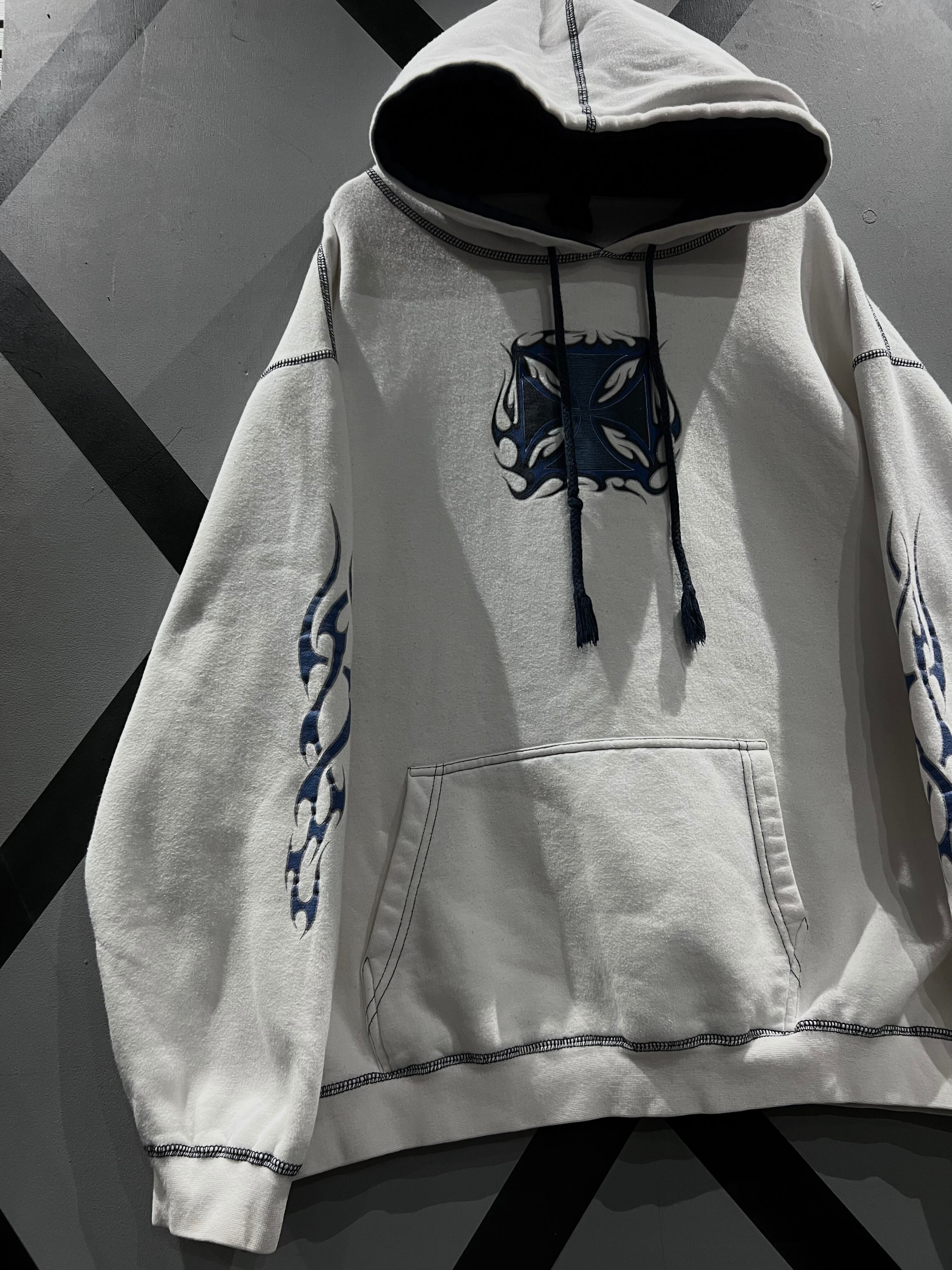 ハリ、肉感のあるホワイトのボディをベースに、トライバルなプリントを載せたプルオーバーフーディ。
