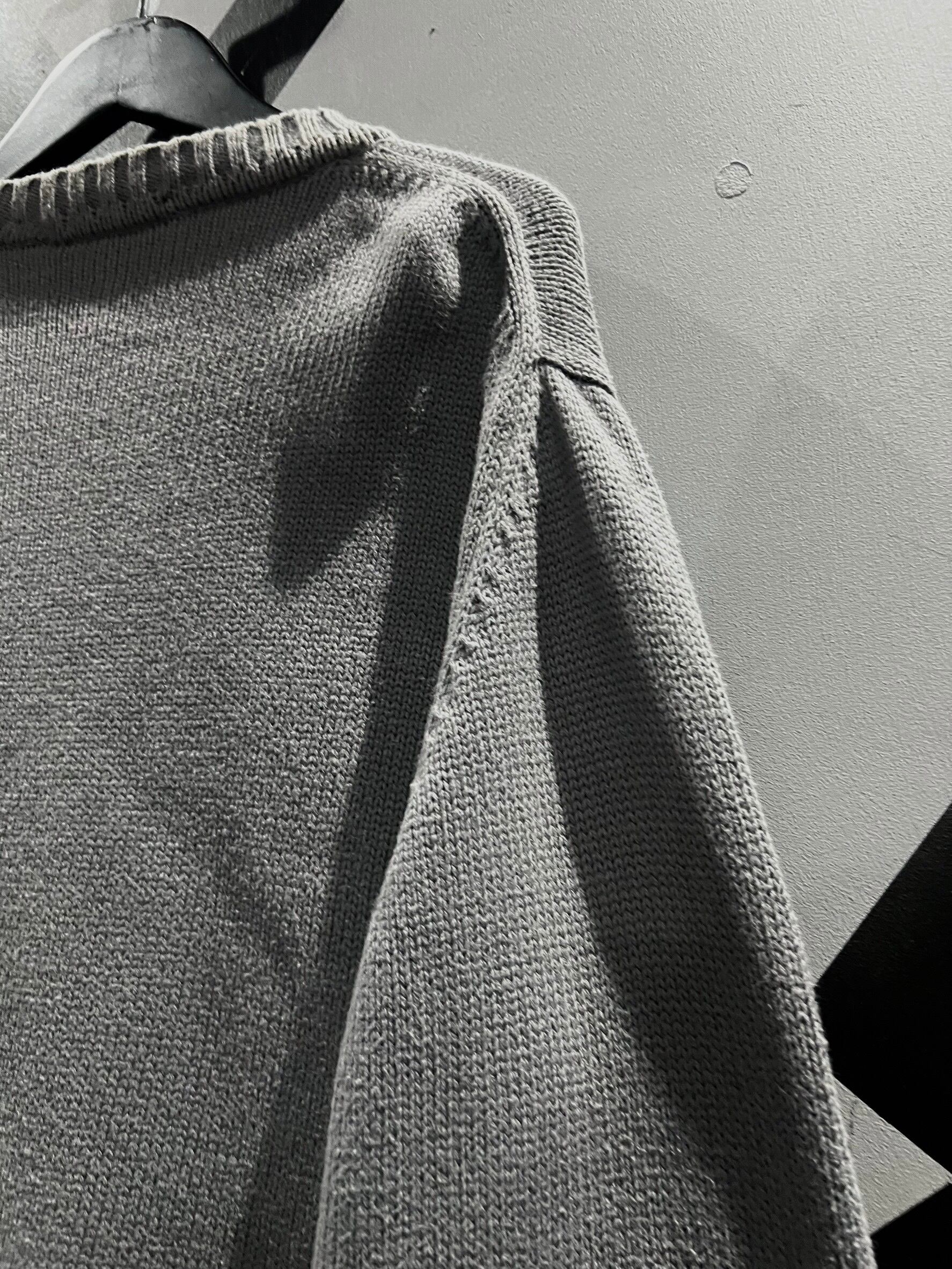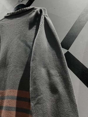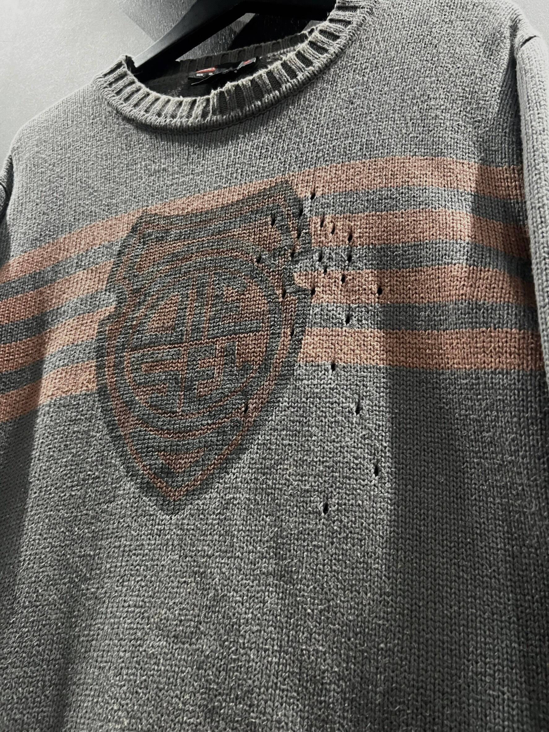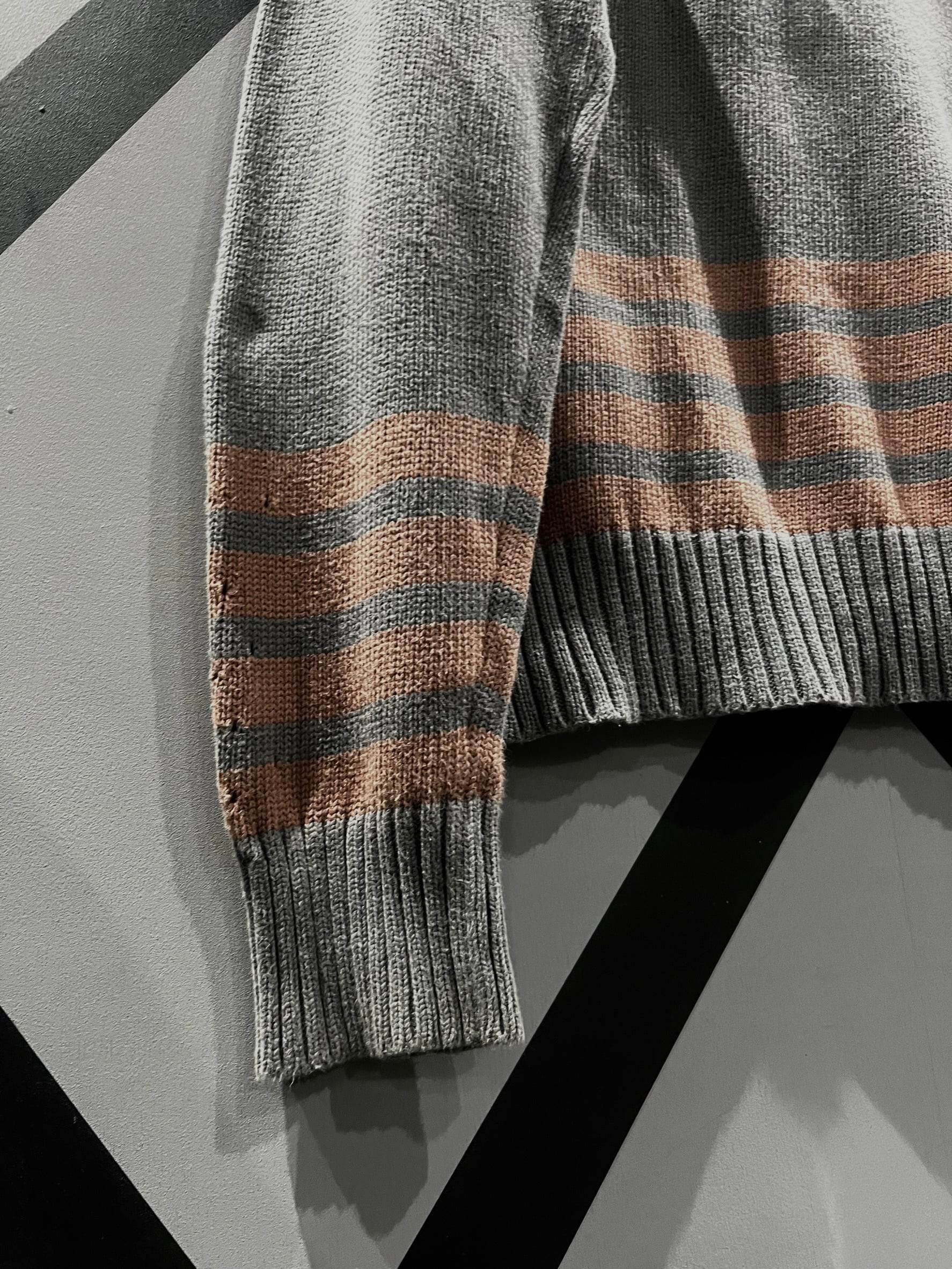 グレーのボディをベースに、ボーダー、エンブレム調のデザインを載せたコットンニット。