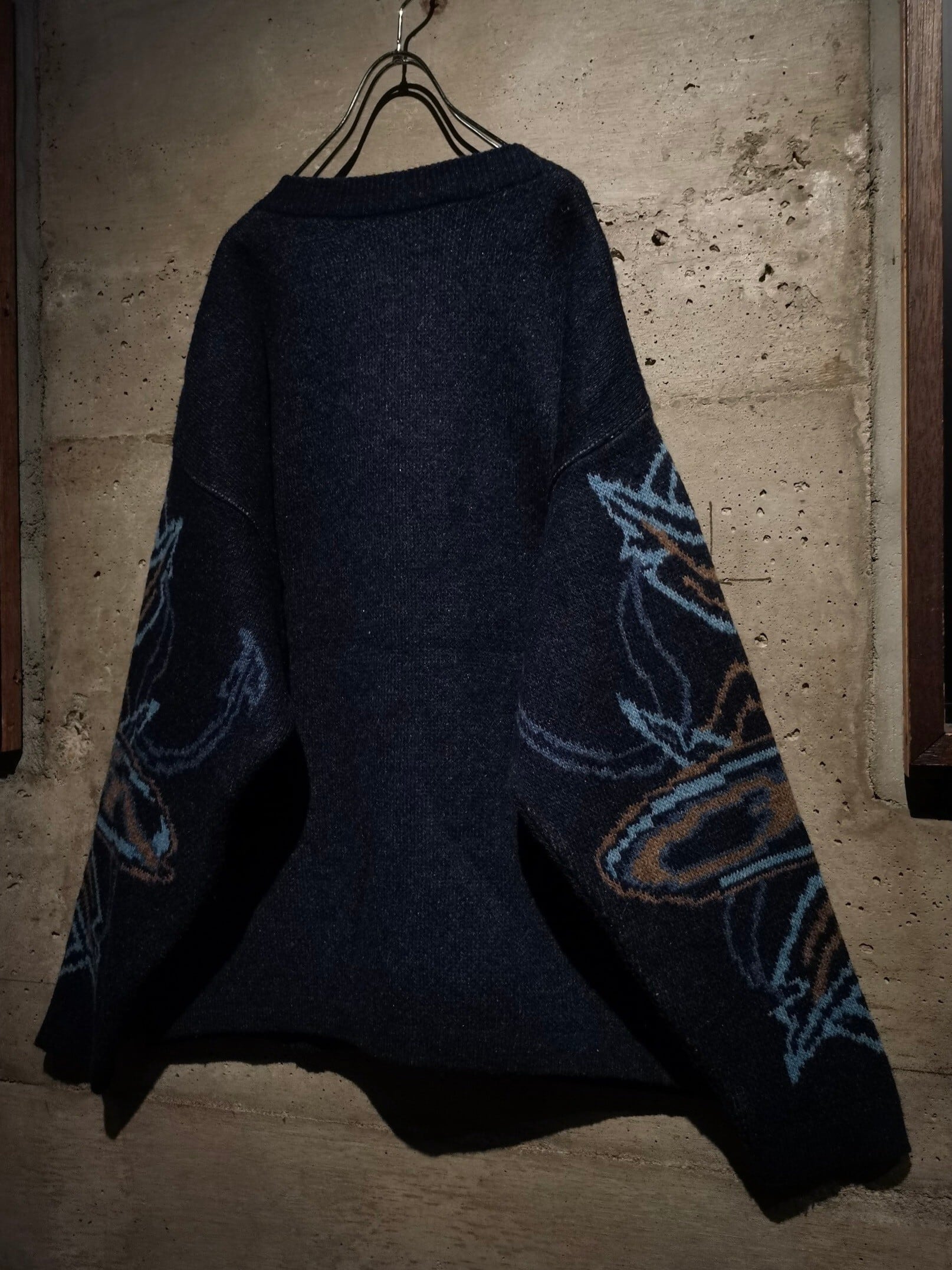 深海を彷彿とさせる深いネイビーをベースに、魚が泳ぐ様子を描いたような抽象的なデザインを載せた1着。