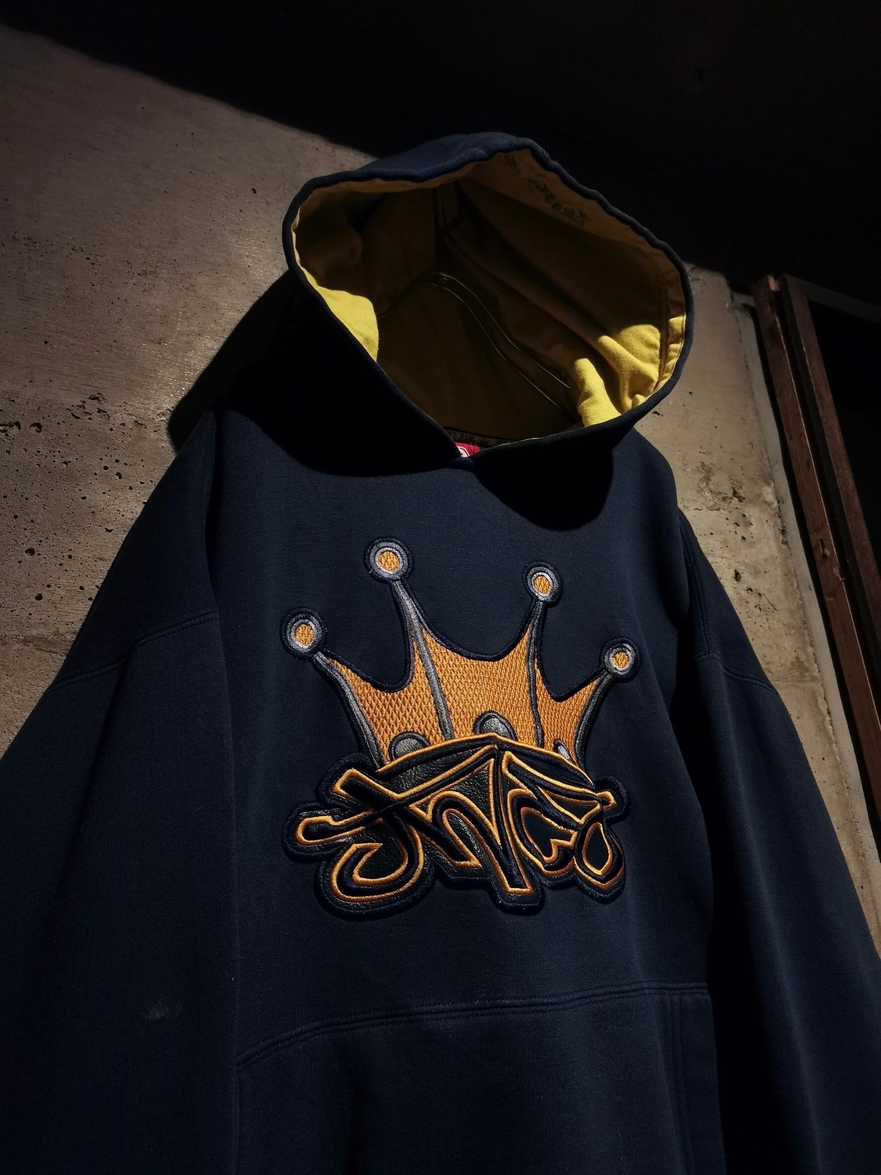 こちらの1着はネイビーのボディに、アイコニックなクラウン、ブランドネームをパッチで載せたフーディ。パッチにはフェイクレザーにロゴ、キルティング調の刺繍を用いており、細やかな部分にブランドのこだわりをヒシヒシと感じられますね。