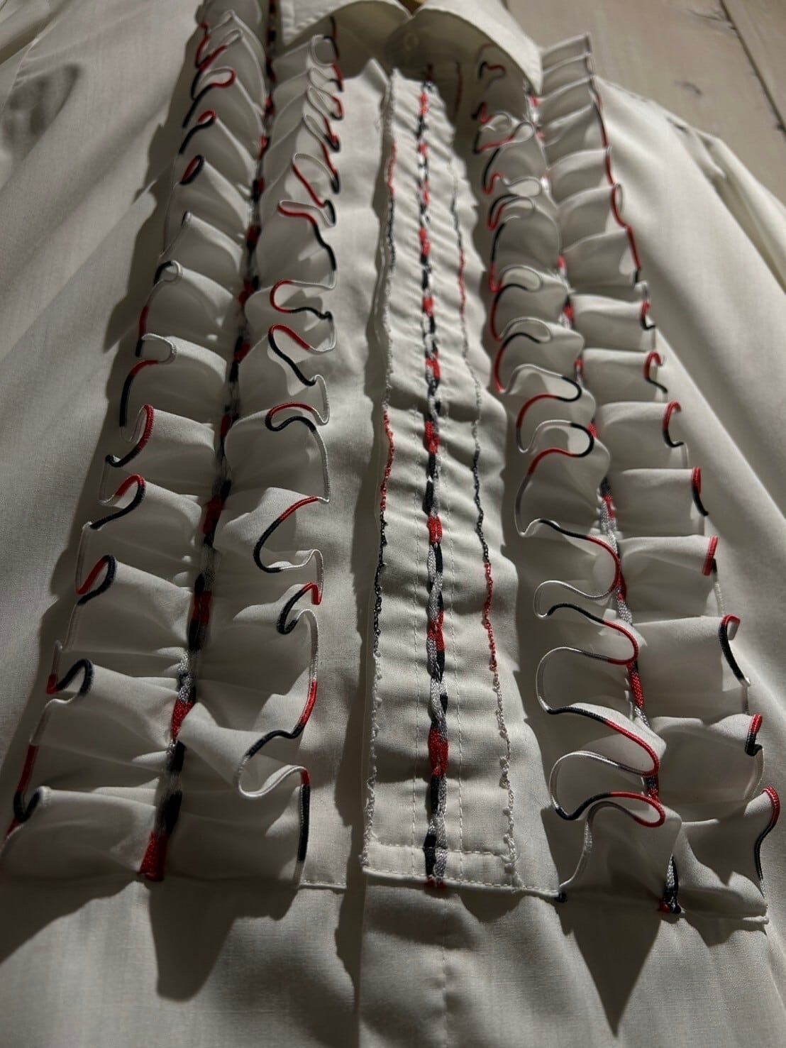 大ぶりのフリル部分には黒と赤によるパイピング、袖はカフス仕様となっている為お好きなカフスボタンでアクセントを追加するのも◎