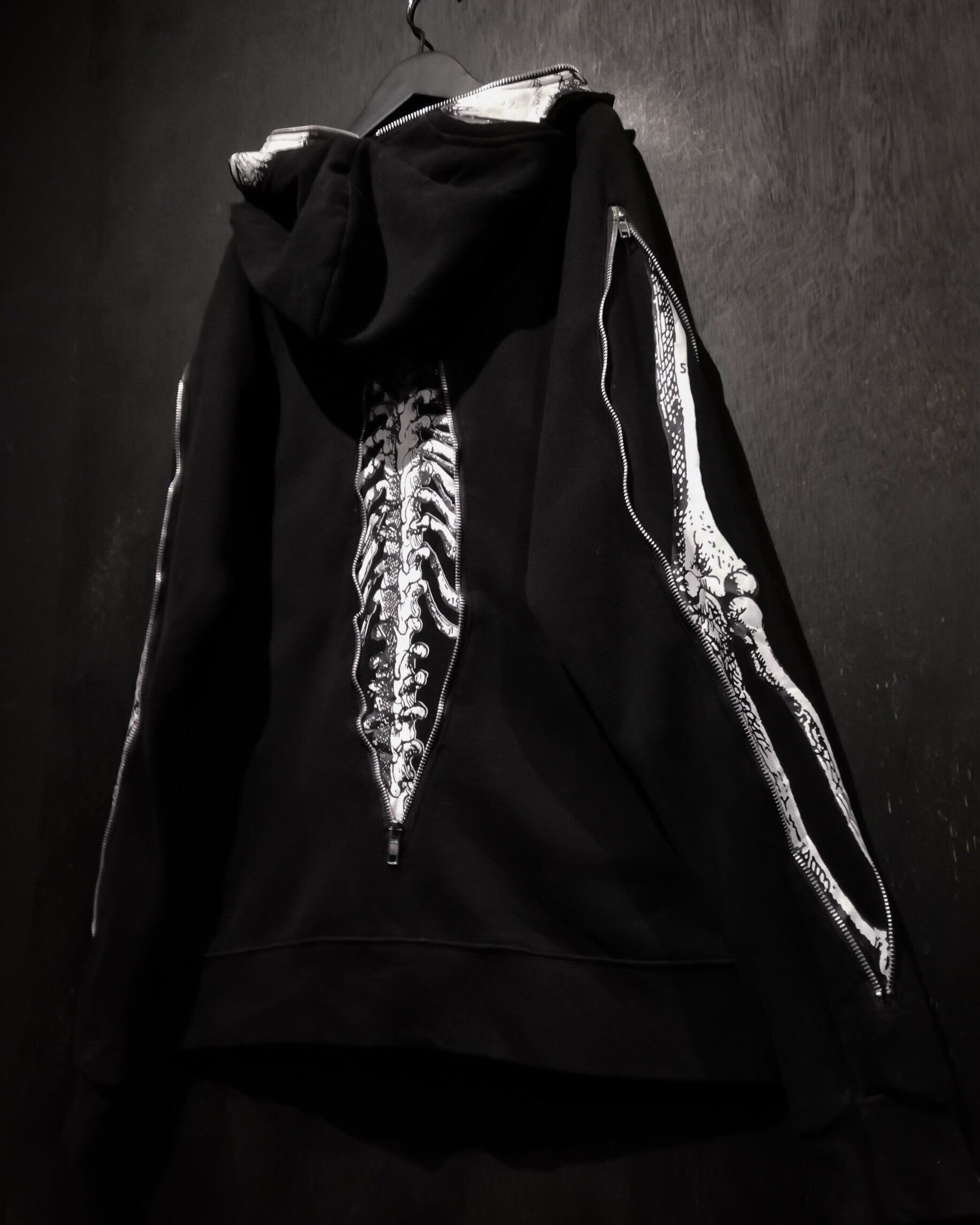 ブラックベースのボディに、スケルトンのデザインを載せたジップアップフーディ。