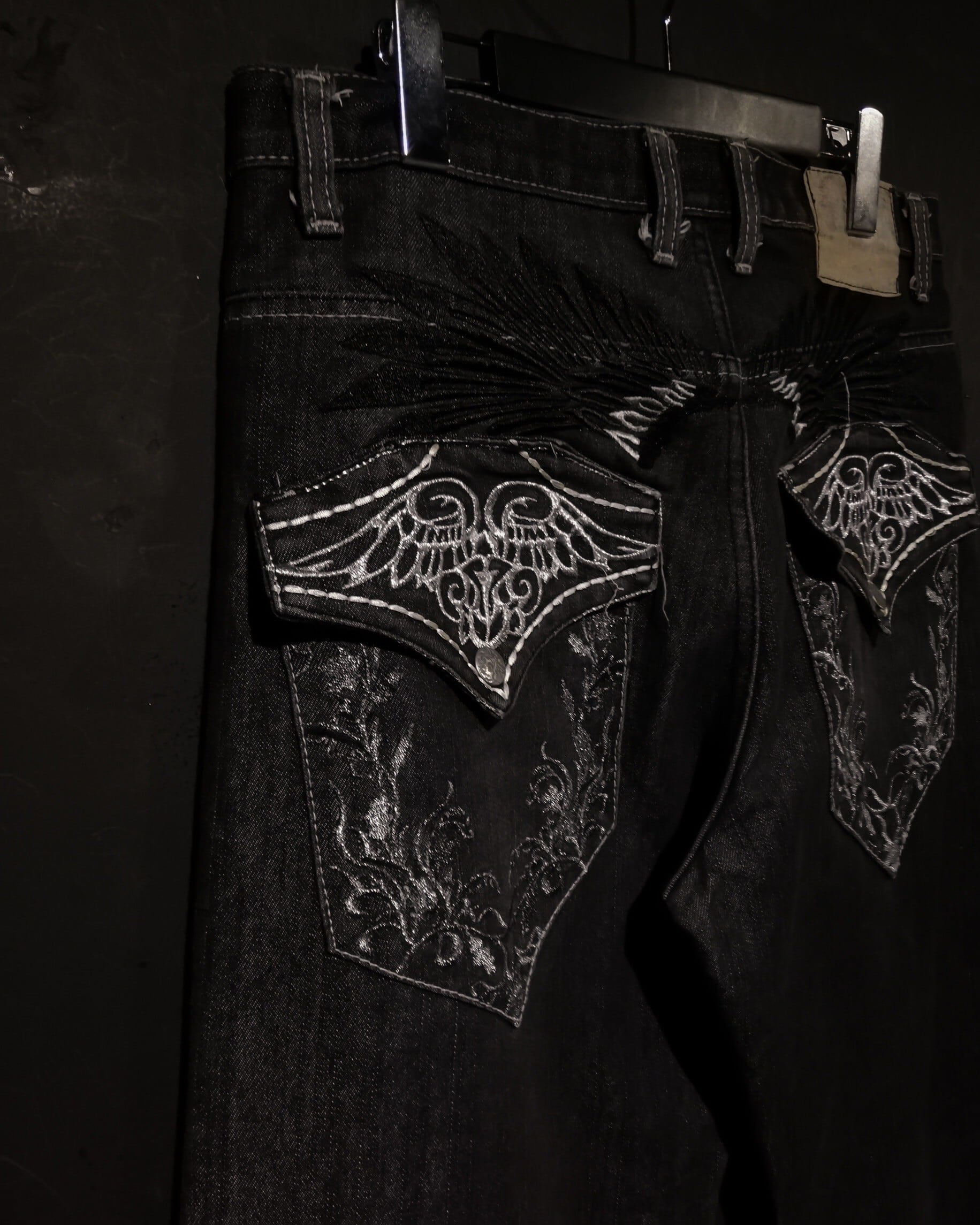 正に、背中ならぬ"ケツ"で語る1着ですね。バックポケットのフラップは変形のカッティング、刺繍には黒、白、シルバーの色を用いたりと細やかなディテールにも気を配ったハイクオリティな仕上がりに。