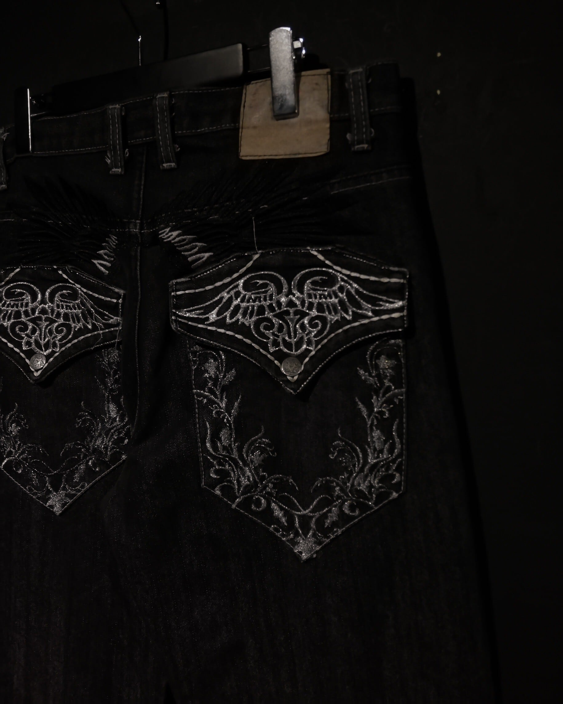 ヴィンテージ業界でも球数がグッと減り、買付難度が上がったブラックデニムのボディをベースに、バックポケットにBling-Blingな表情を見せる刺繍を施したバギーパンツ。