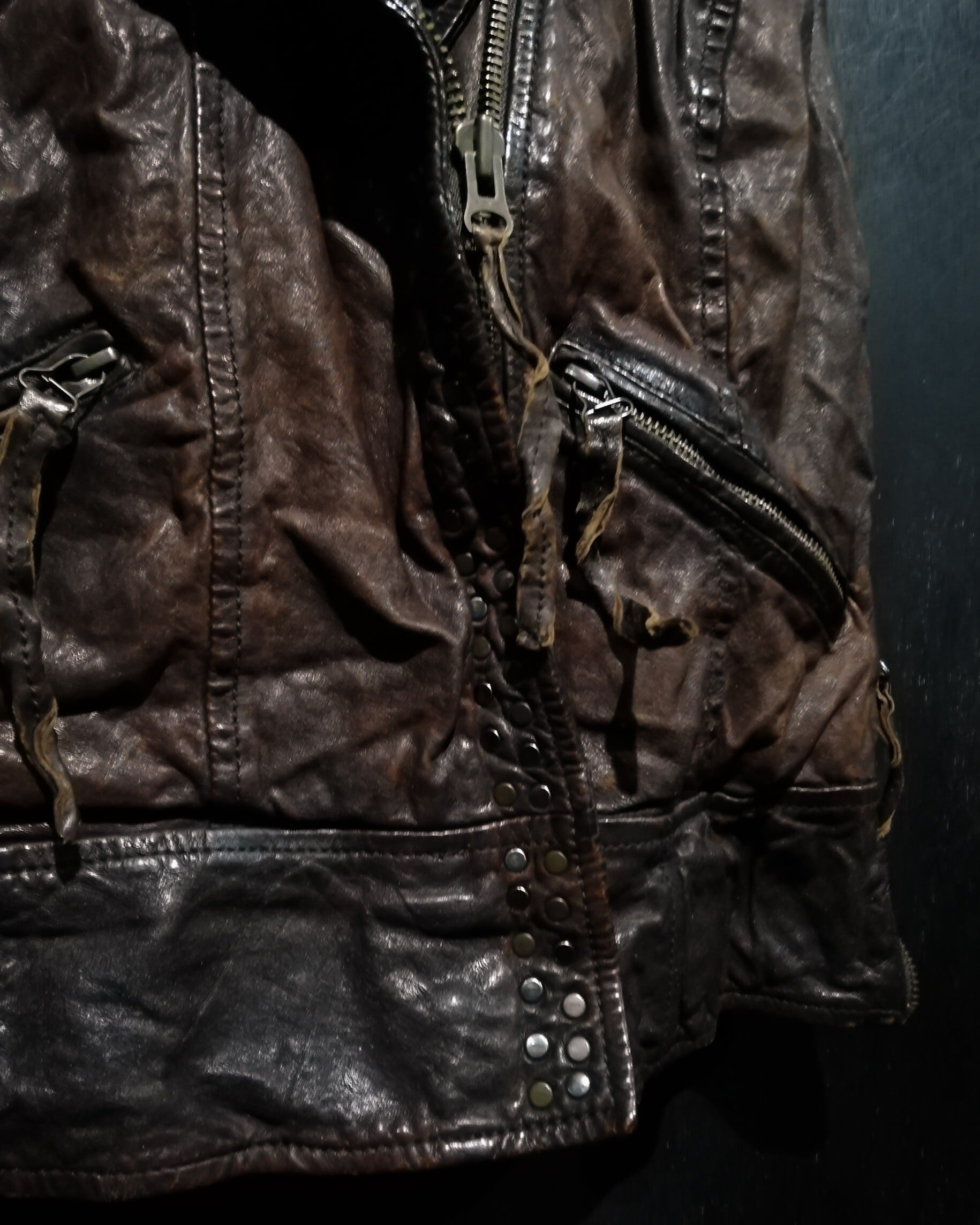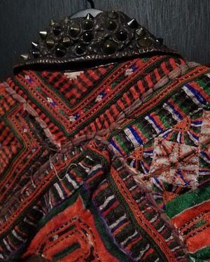 前たてはダブルライダースタイプに仕上げられており、襟やラペルなどには幾つものスタッズの打ち込み。更に背面ヨークを緻密な織りの生地で切り替えた1着。