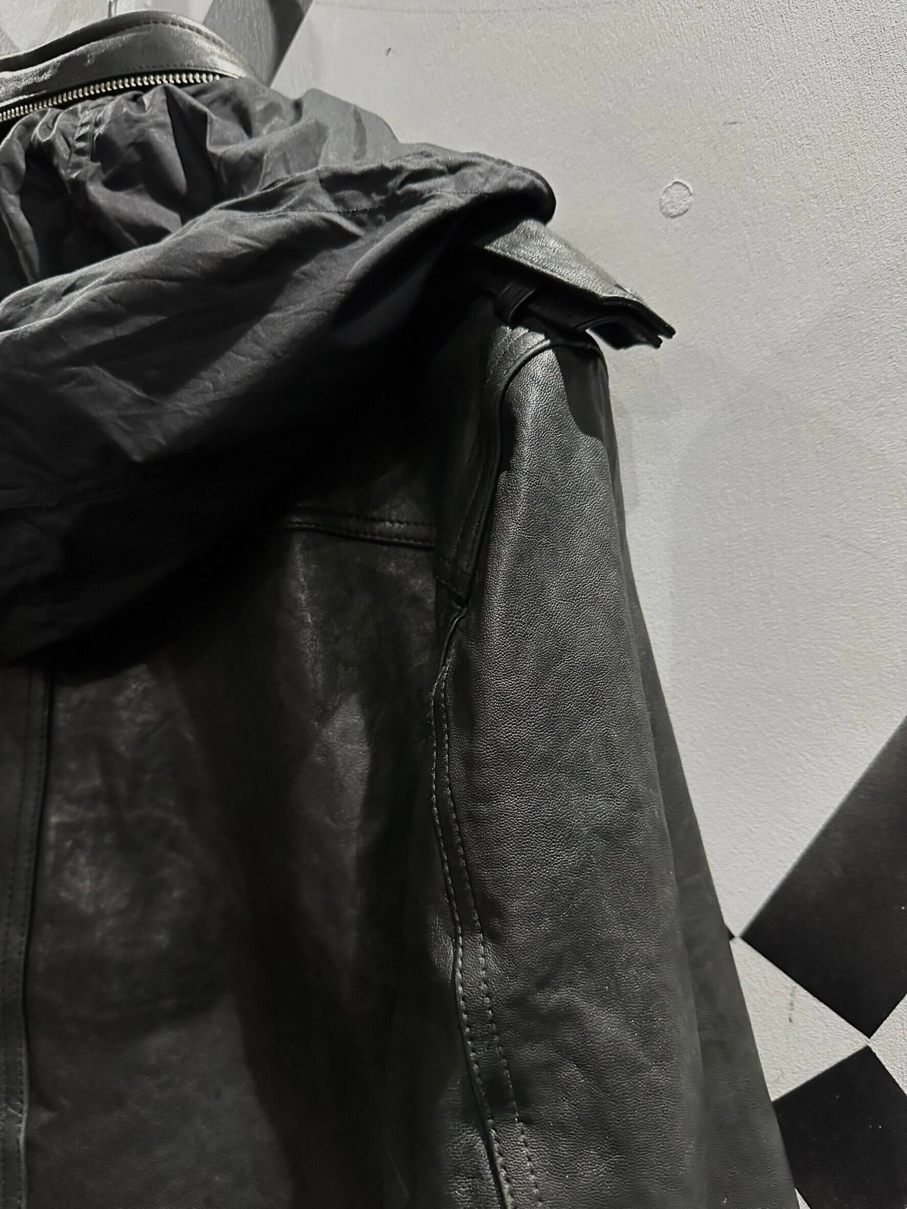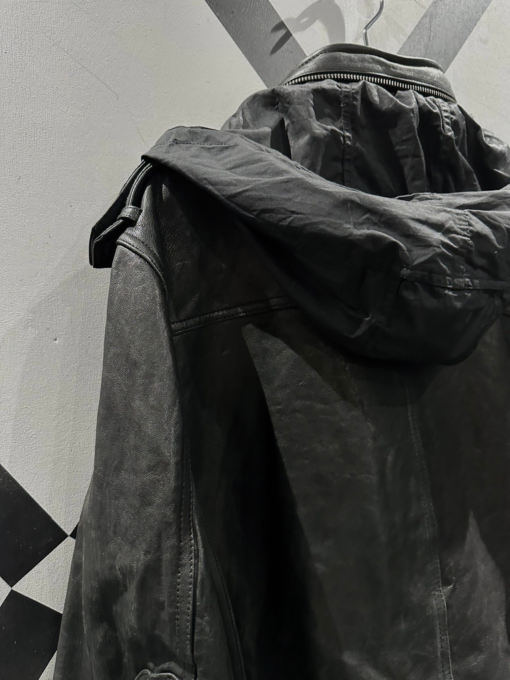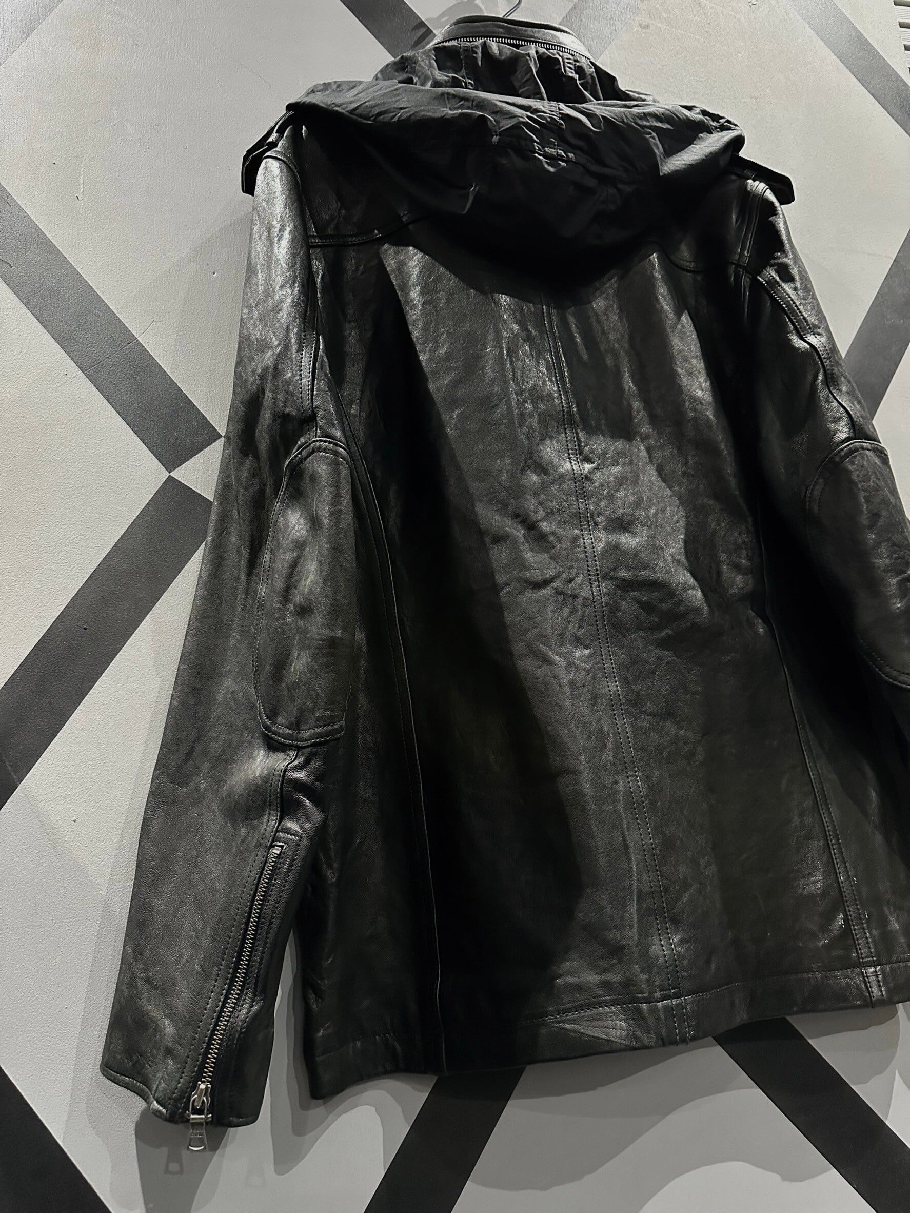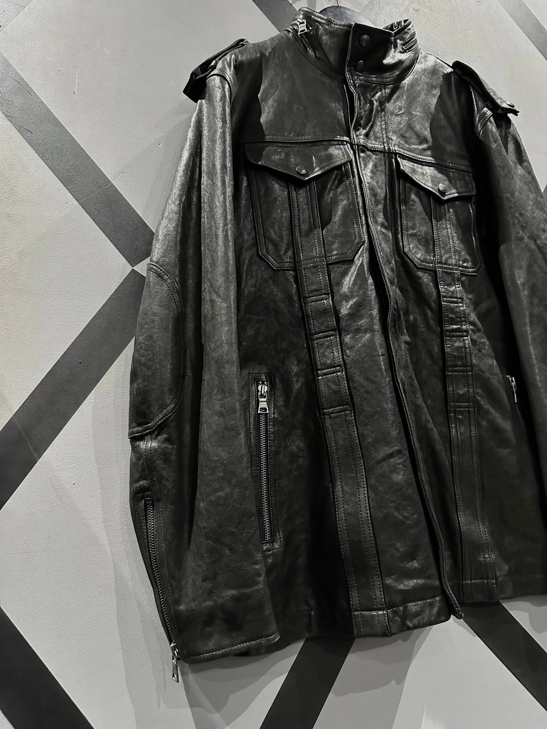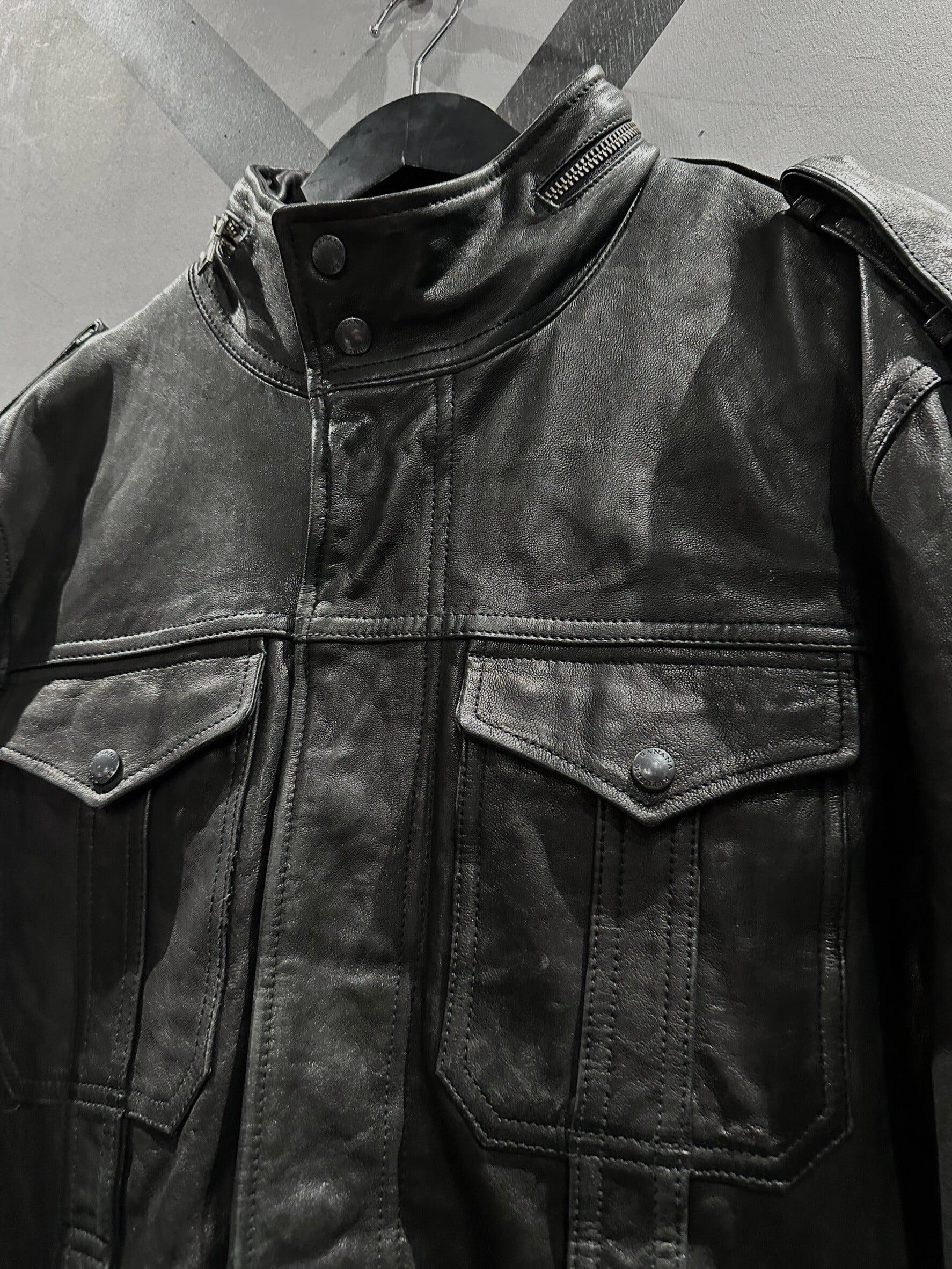 ハリのある上質なブラックレザーを用いて、胸元にはフラップポケット、ボディサイドにはジップポケットをON。肩にはエポレットなど、様々なギミックを落とし込んだレザージャケット。