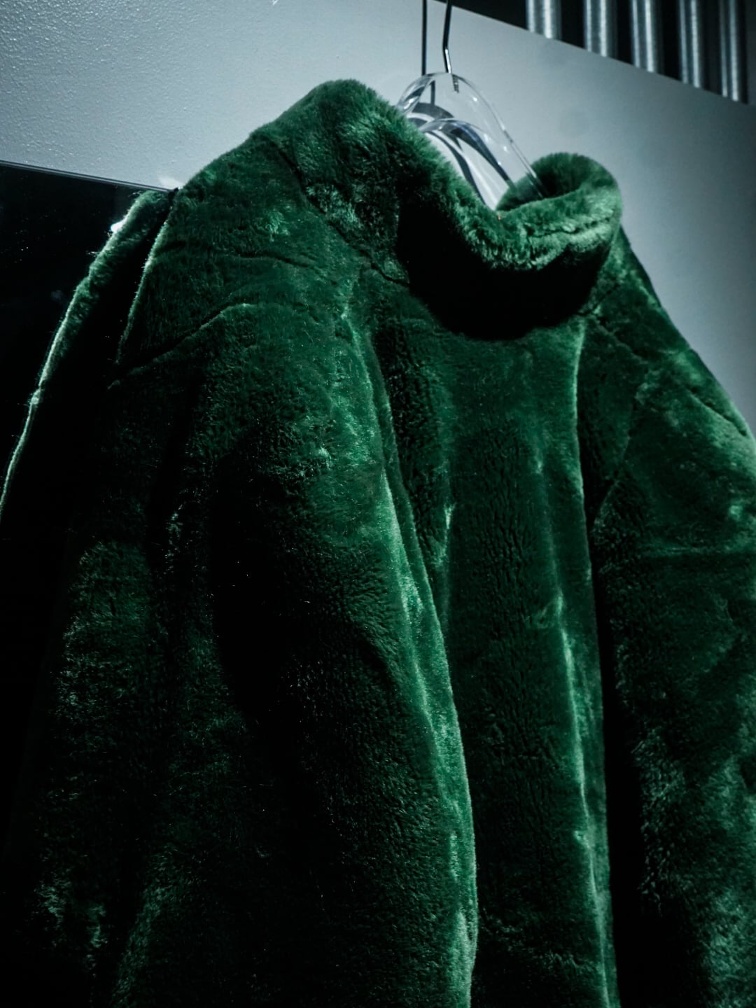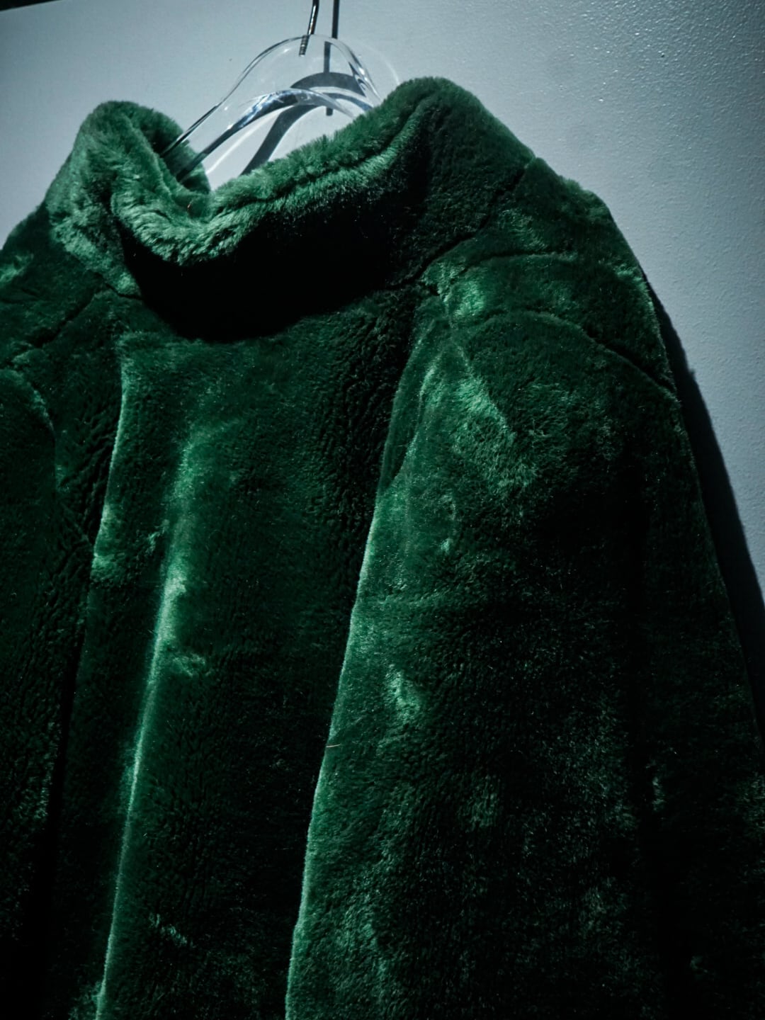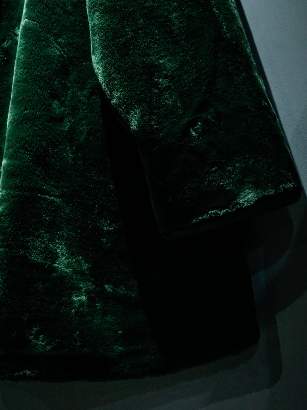 一瞬で目を奪われる程美しい、艶のある光沢を放つ色彩に身を包んだフェイクファーコート。デザインはシンプルですがその圧倒的な存在感を放つカラーリングで只者ではないオーラを立ち込めさせます。