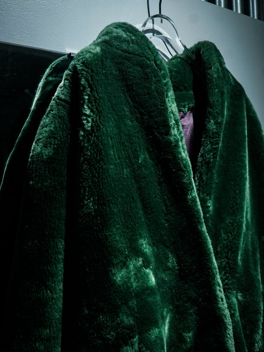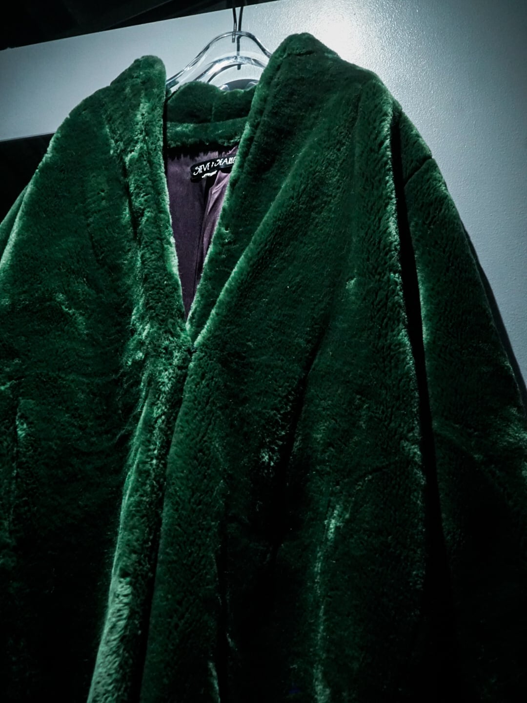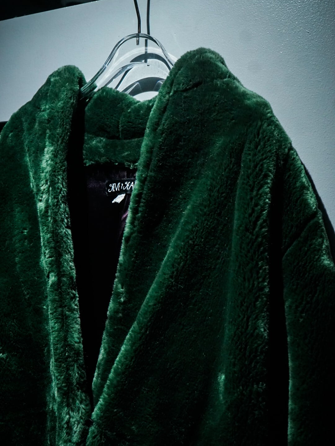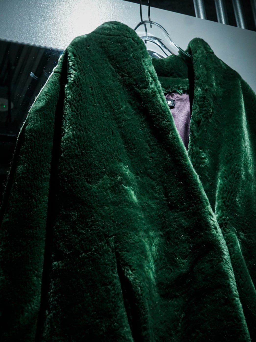 一瞬で目を奪われる程美しい、艶のある光沢を放つ色彩に身を包んだフェイクファーコート。デザインはシンプルですがその圧倒的な存在感を放つカラーリングで只者ではないオーラを立ち込めさせます。